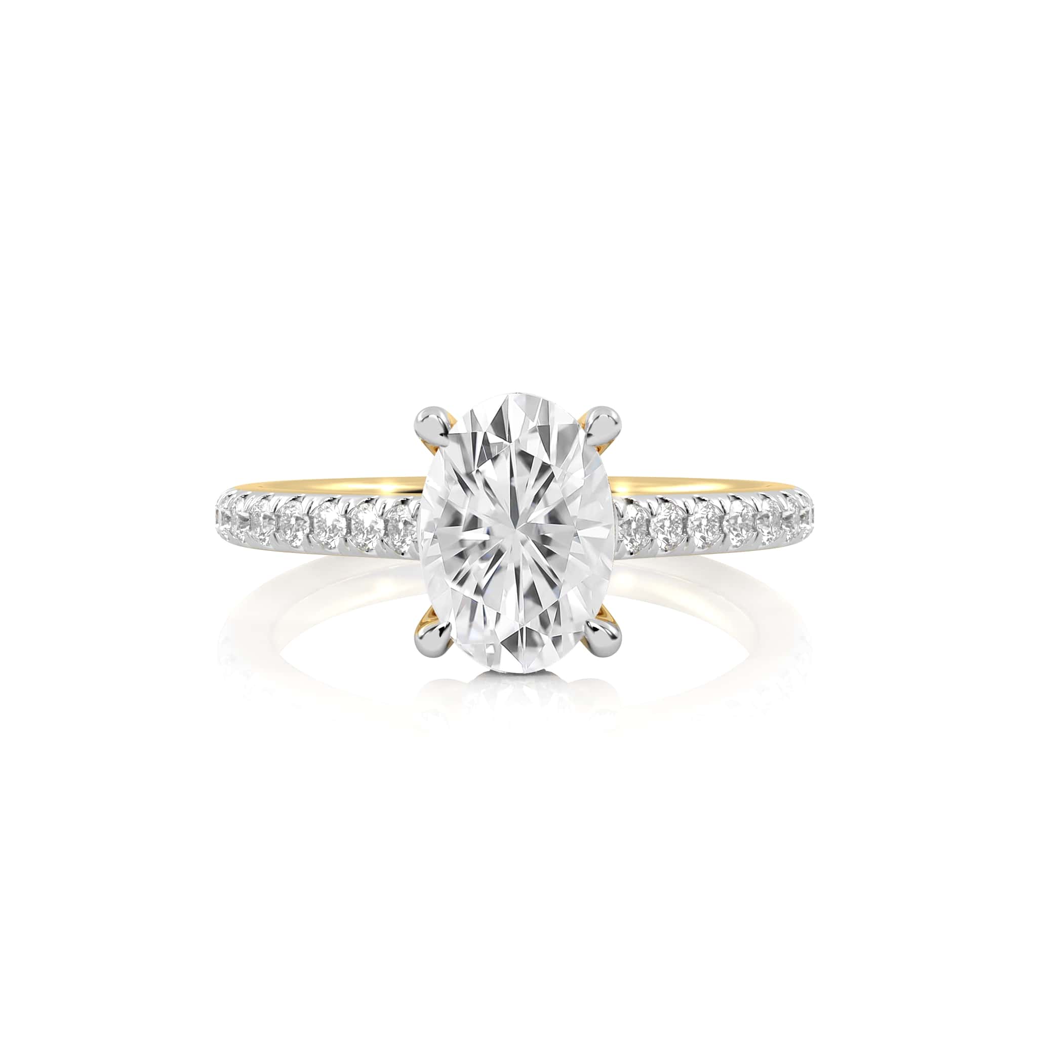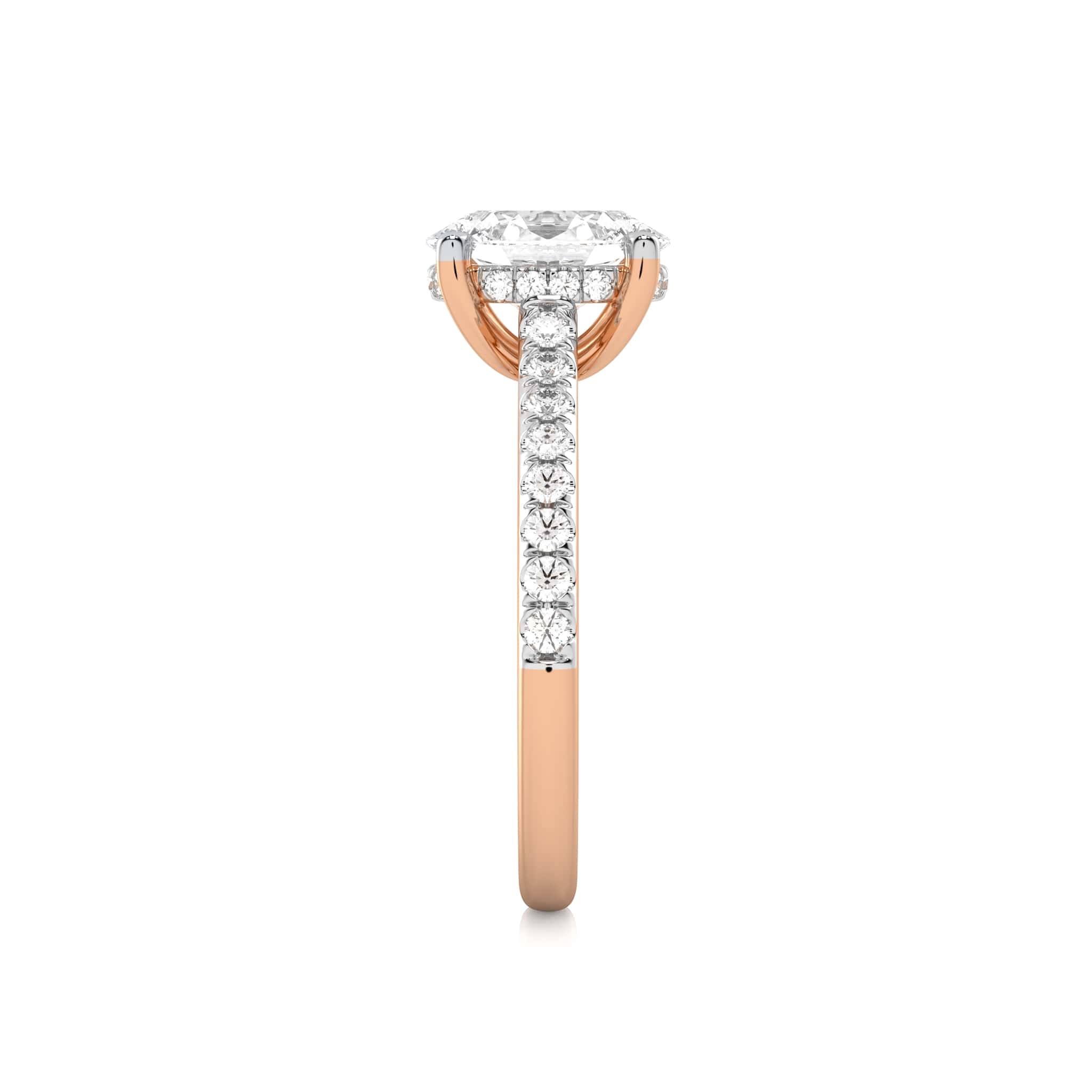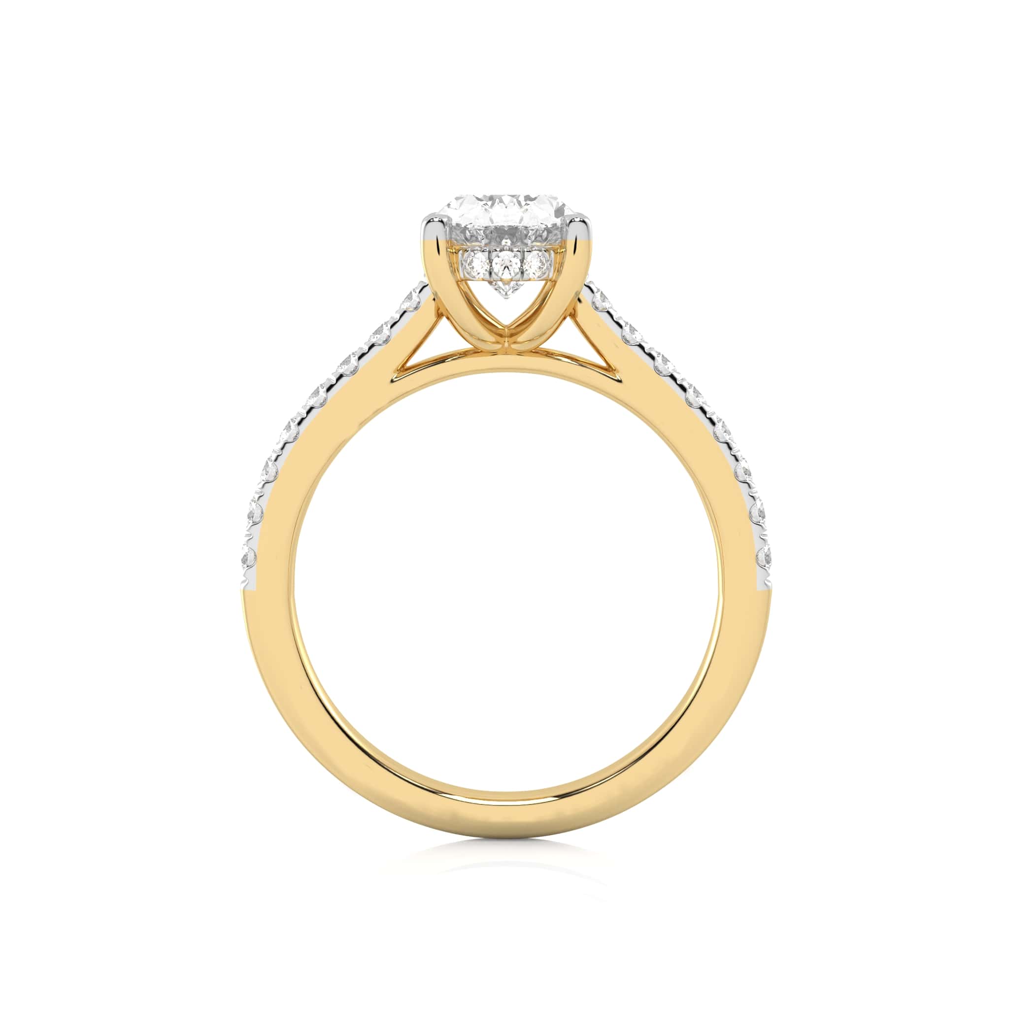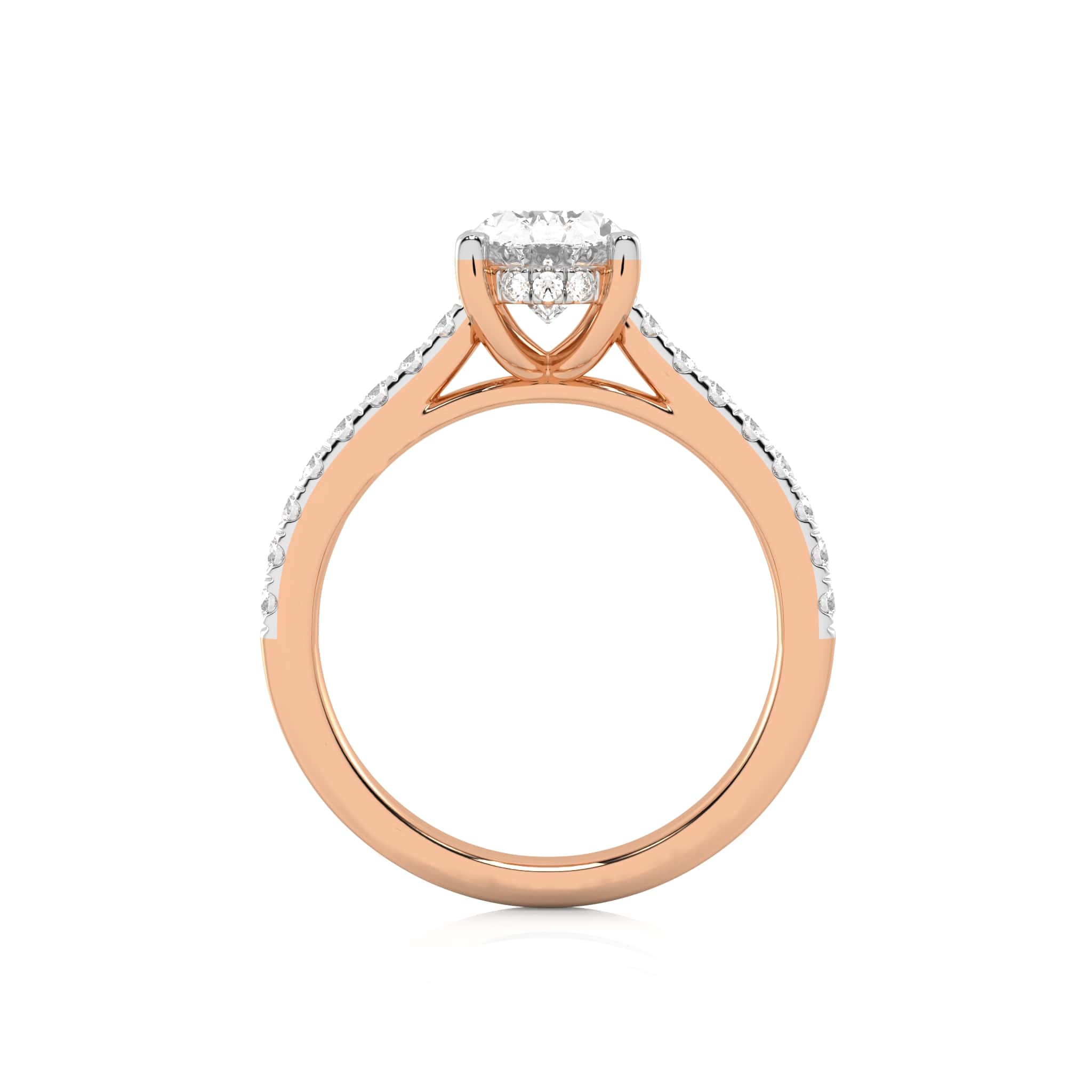 This ring features a breathtaking 2 carat oval center stone highlighted by 1/3 carat round side stones crafted with Natural diamonds in a refined micro-prong and prong setting, it offers a naturally graceful and timeless appeal