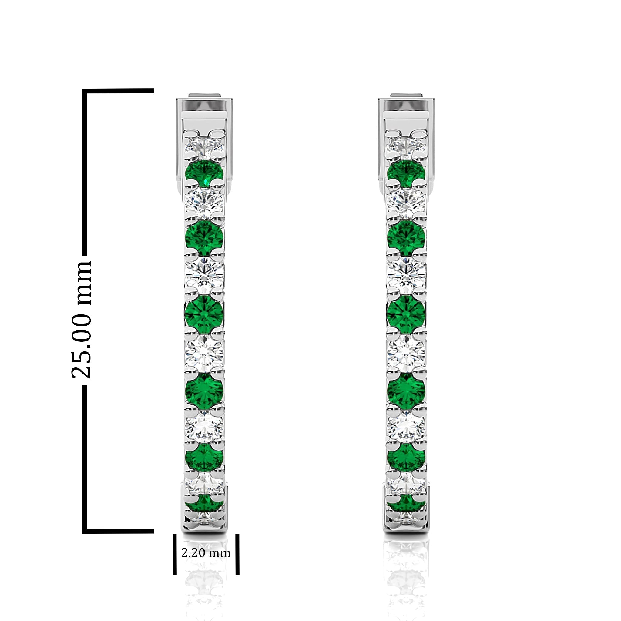Let's have a look at these stunning 1 3/4 CT. Inside Out Hoop Earrings, where shimmering round natural diamonds meet the vivid allure of emeralds. Set in a classic prong design, the diamonds boast H-I color and I1-I2 clarity, providing a radiant sparkle, while the emeralds add a vibrant touch of green. The inside out setting ensures that every turn captures light beautifully, making these hoops a striking choice for both day and evening elegance