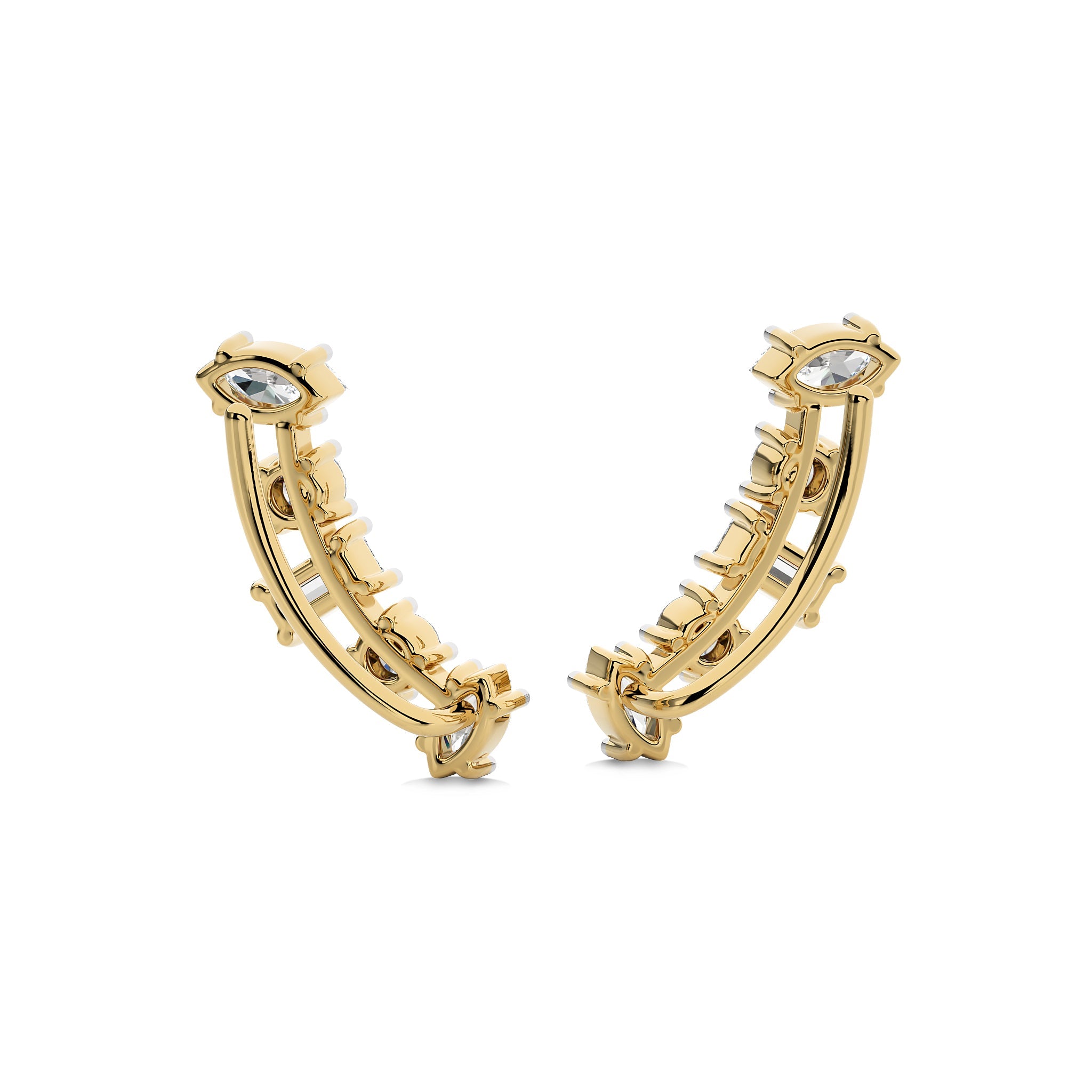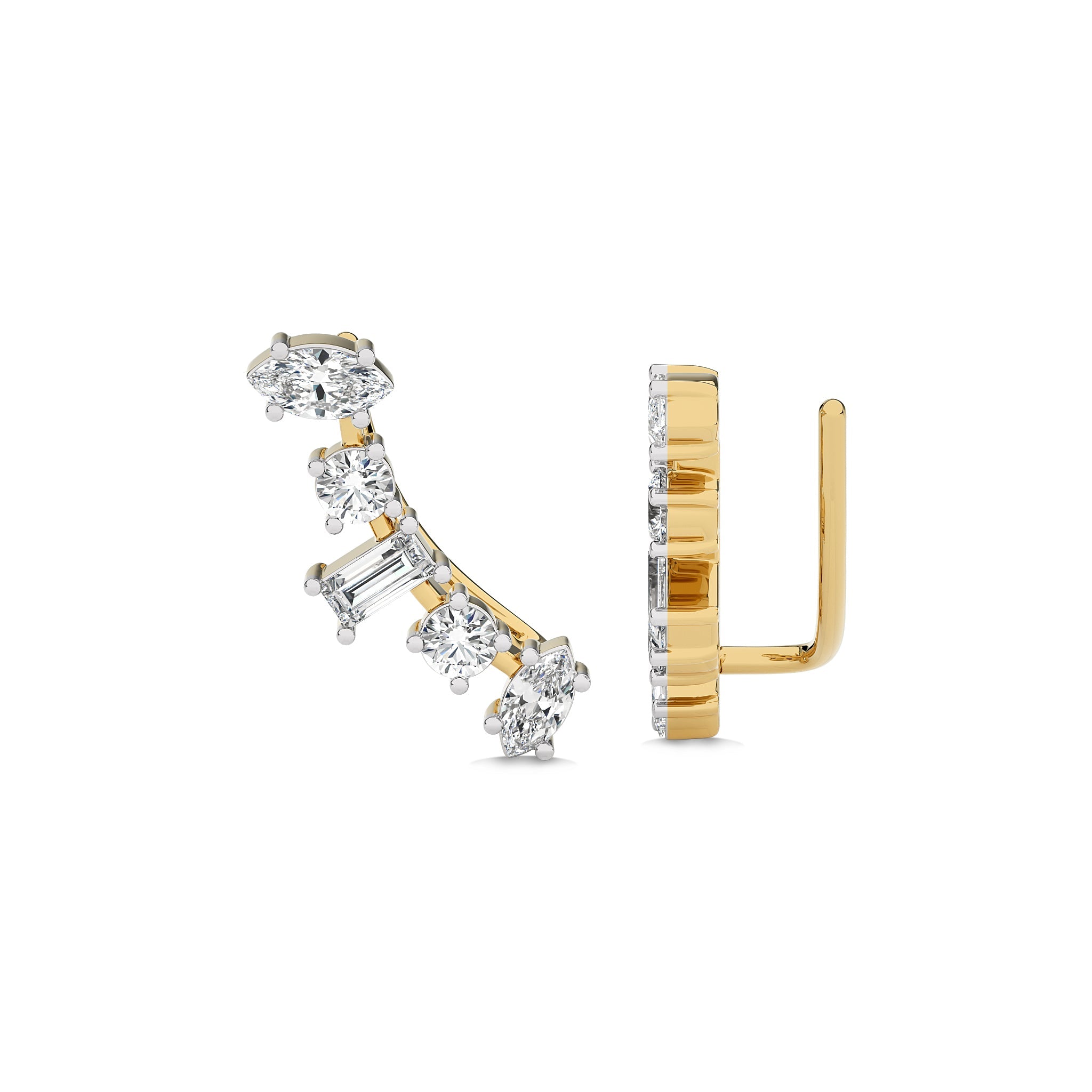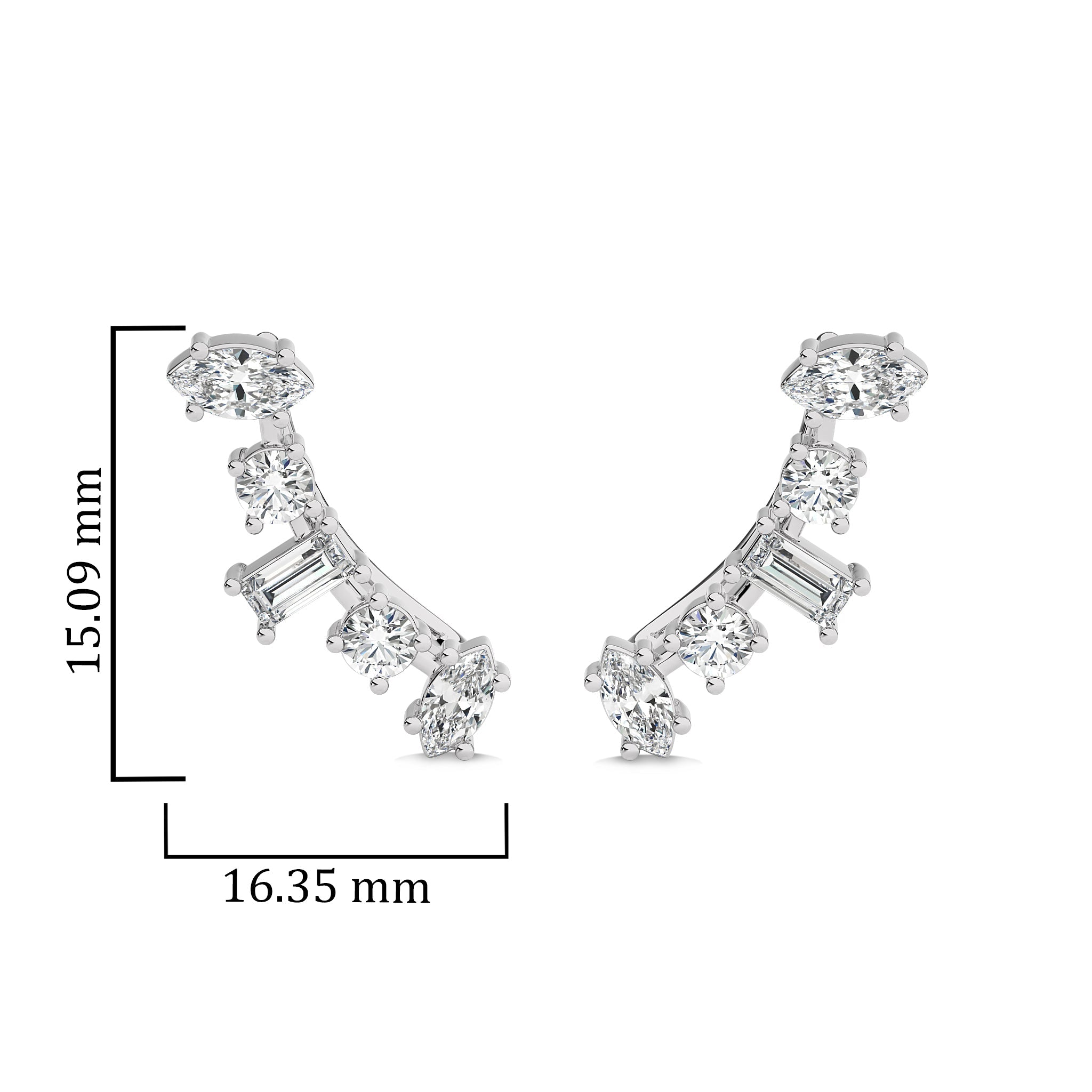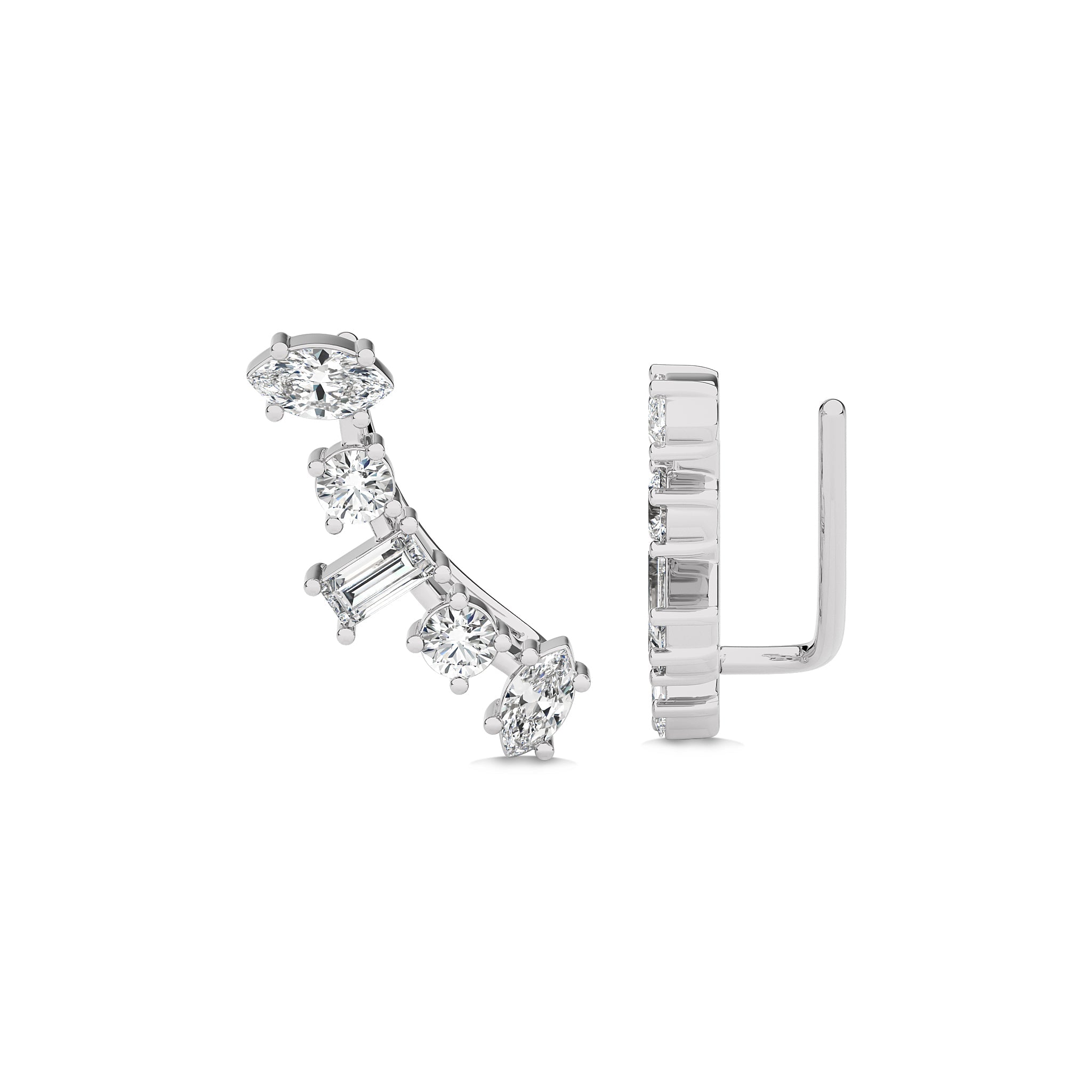 Fascinate onlookers with these 1 1/2 CT. round, marquise, and baguette crawler earrings. Featuring H-I color and I1-I2 clarity diamonds in an exquisite prong setting, these earrings combine various shapes to create a dazzling and unique design. Perfect for infusing any outfit with a modern touch of sparkle
