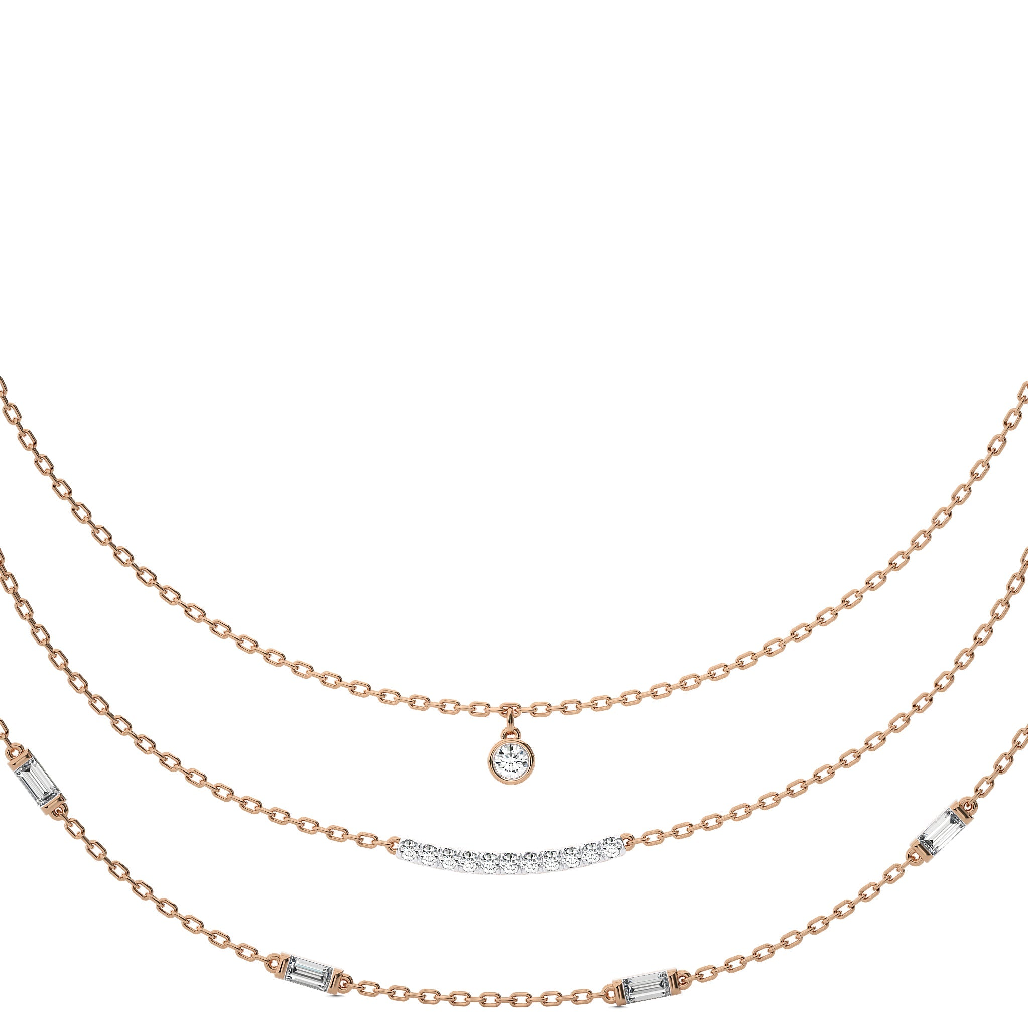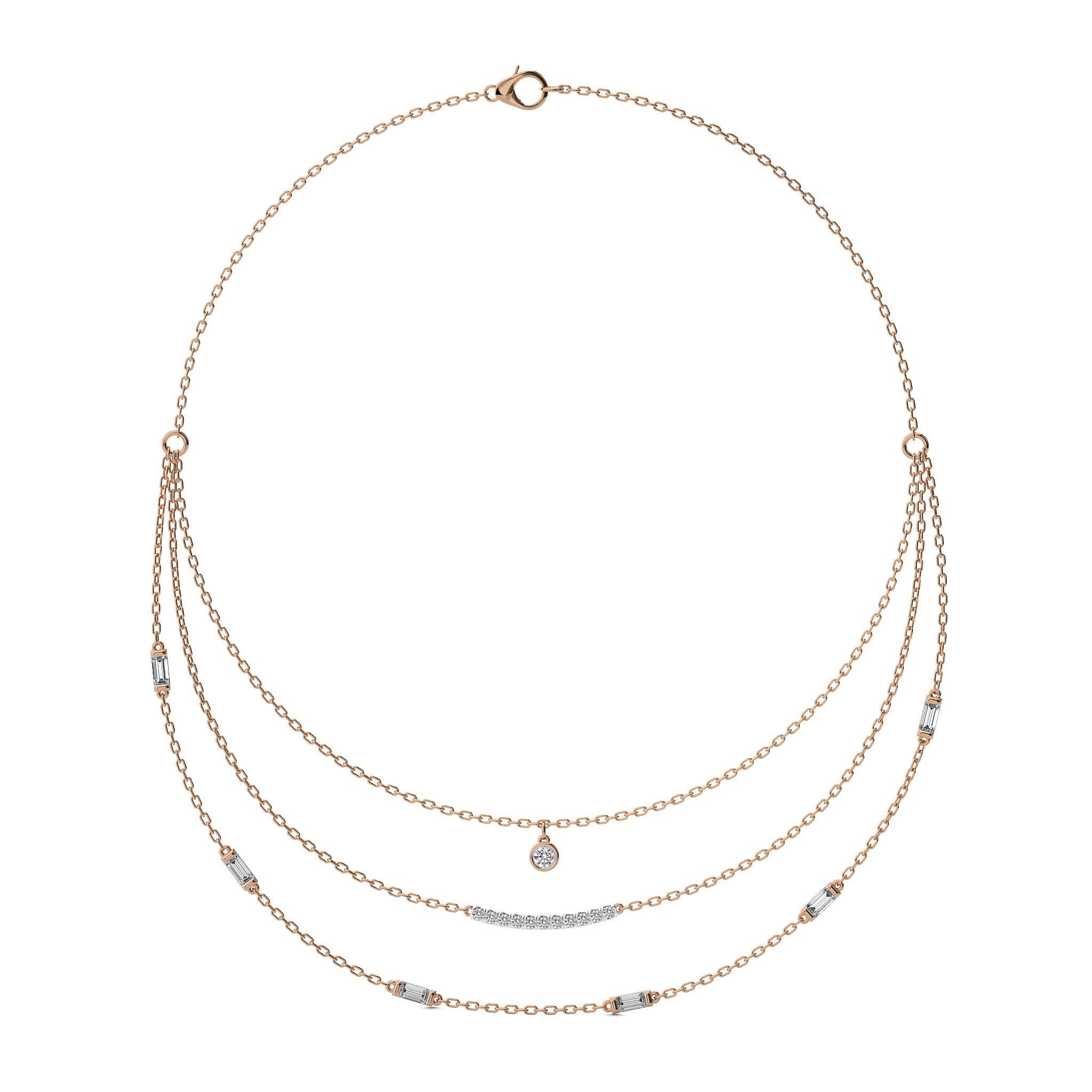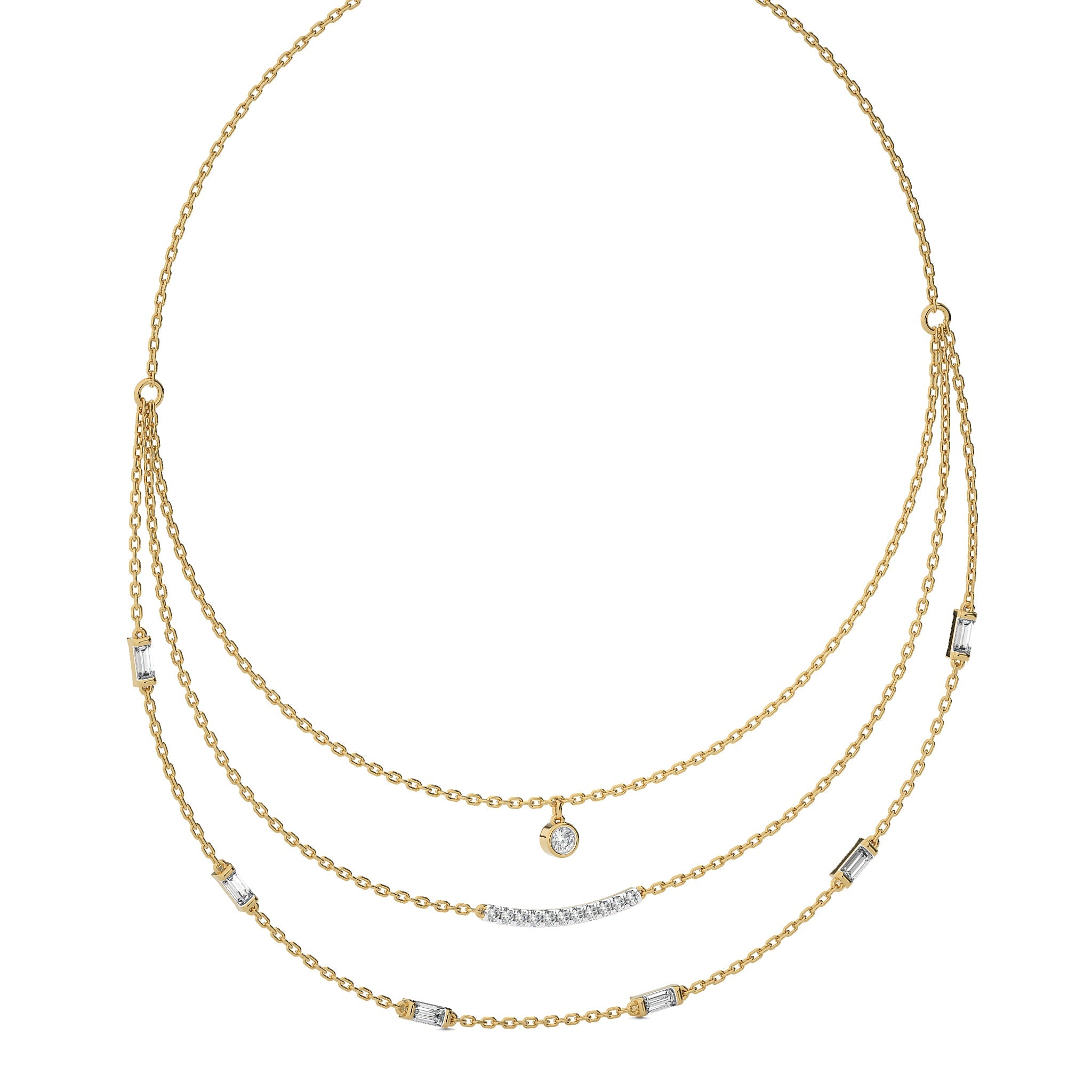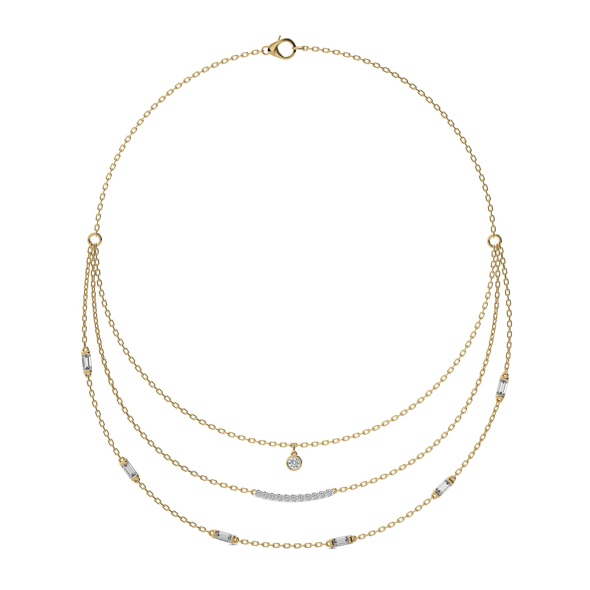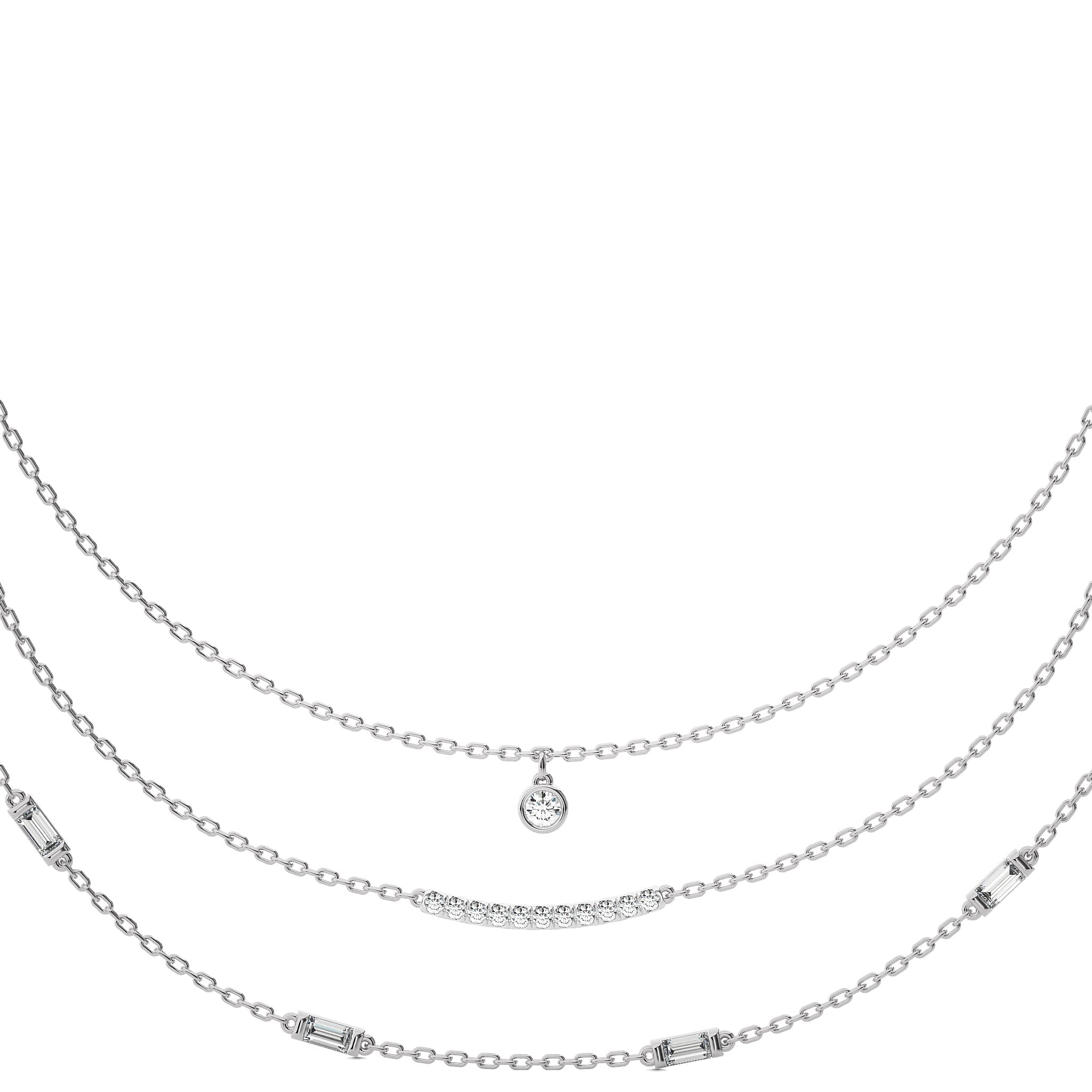 Illuminate your collection with this 1 3/4 CT. Round and Baguette Lab Created Diamond Three Layered Necklace, featuring DEF/SI quality diamonds. Crafted with micro split, bezel, and channel settings, this piece showcases a stunning design that enhances any outfit. A luxurious accessory for making a lasting impression