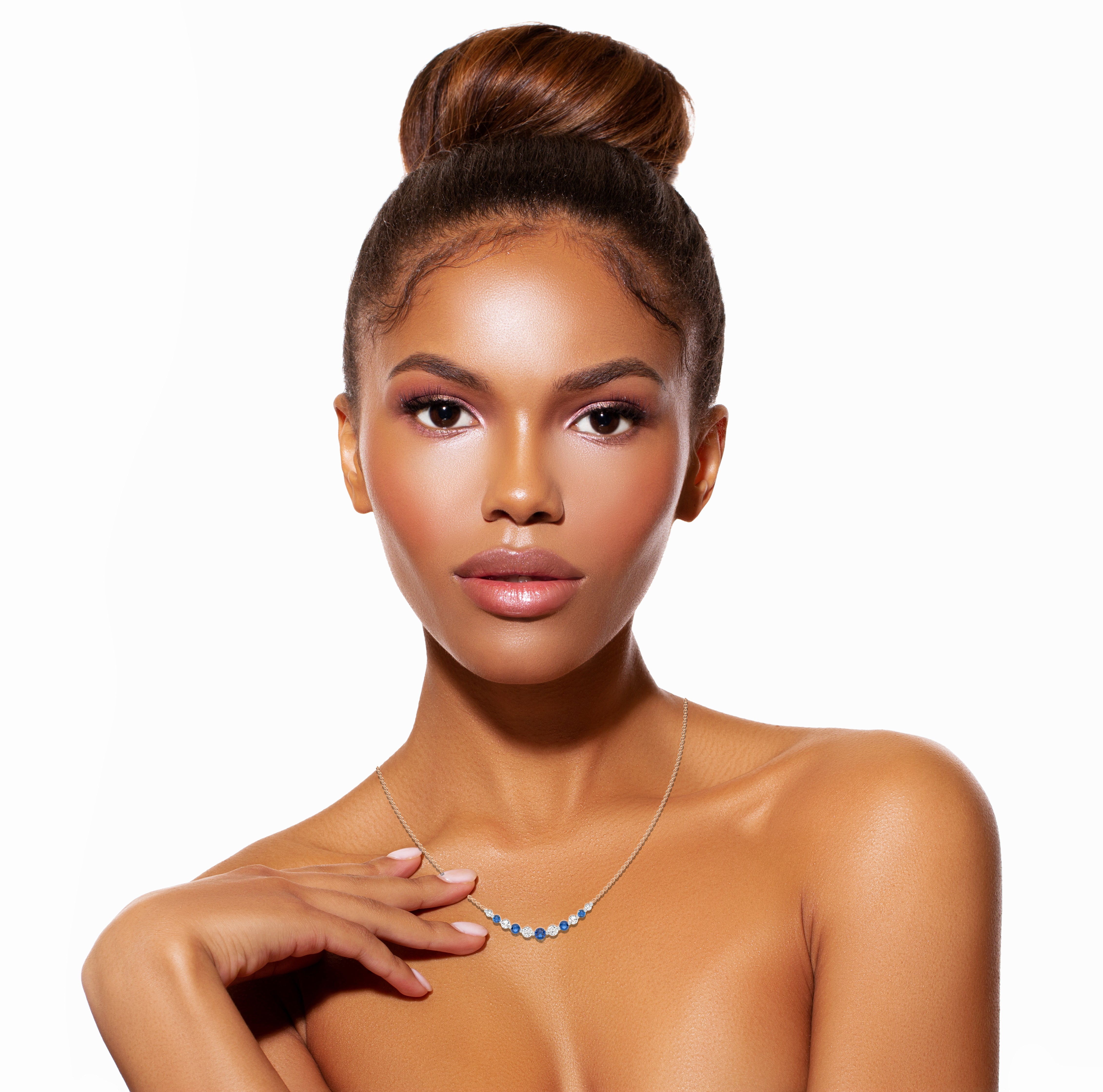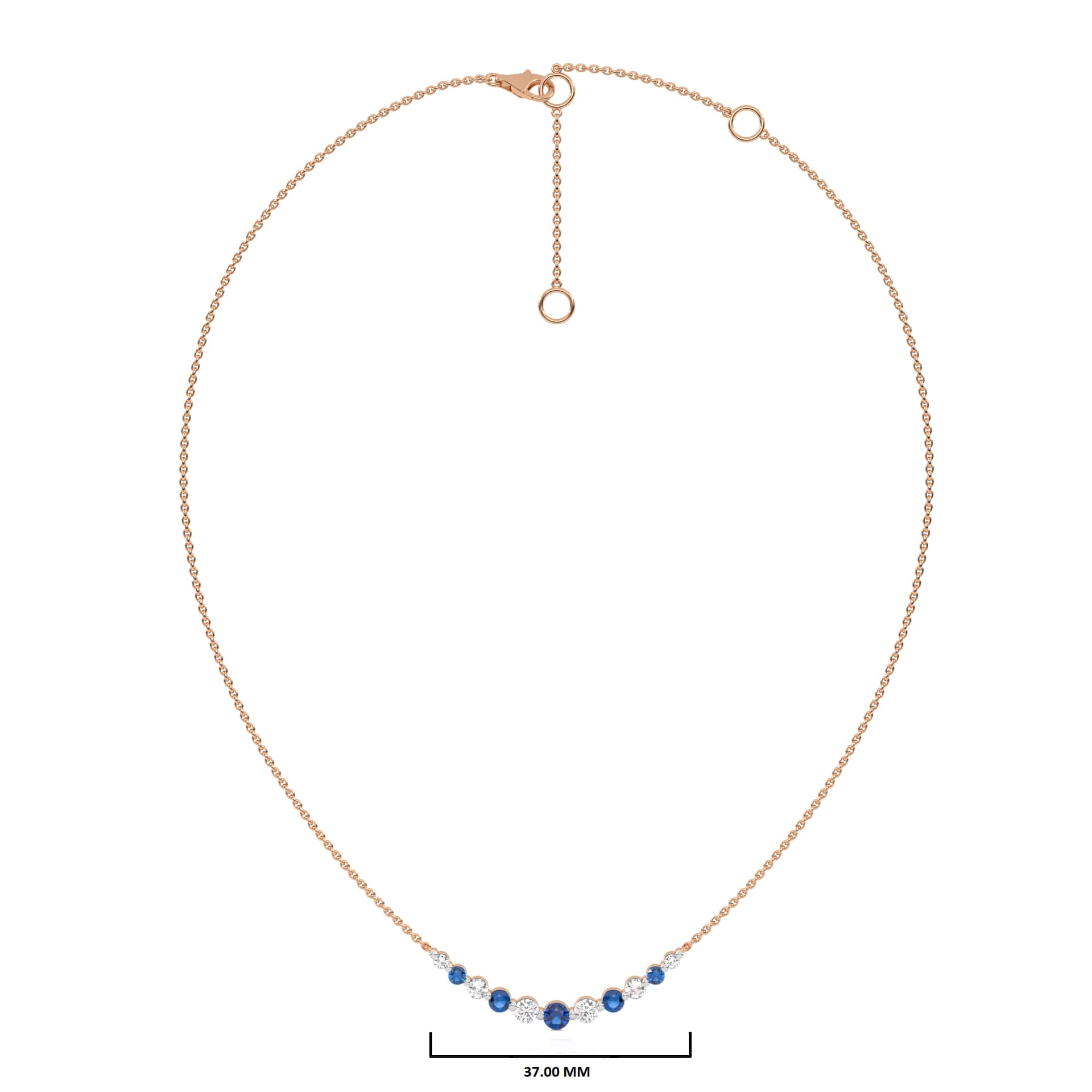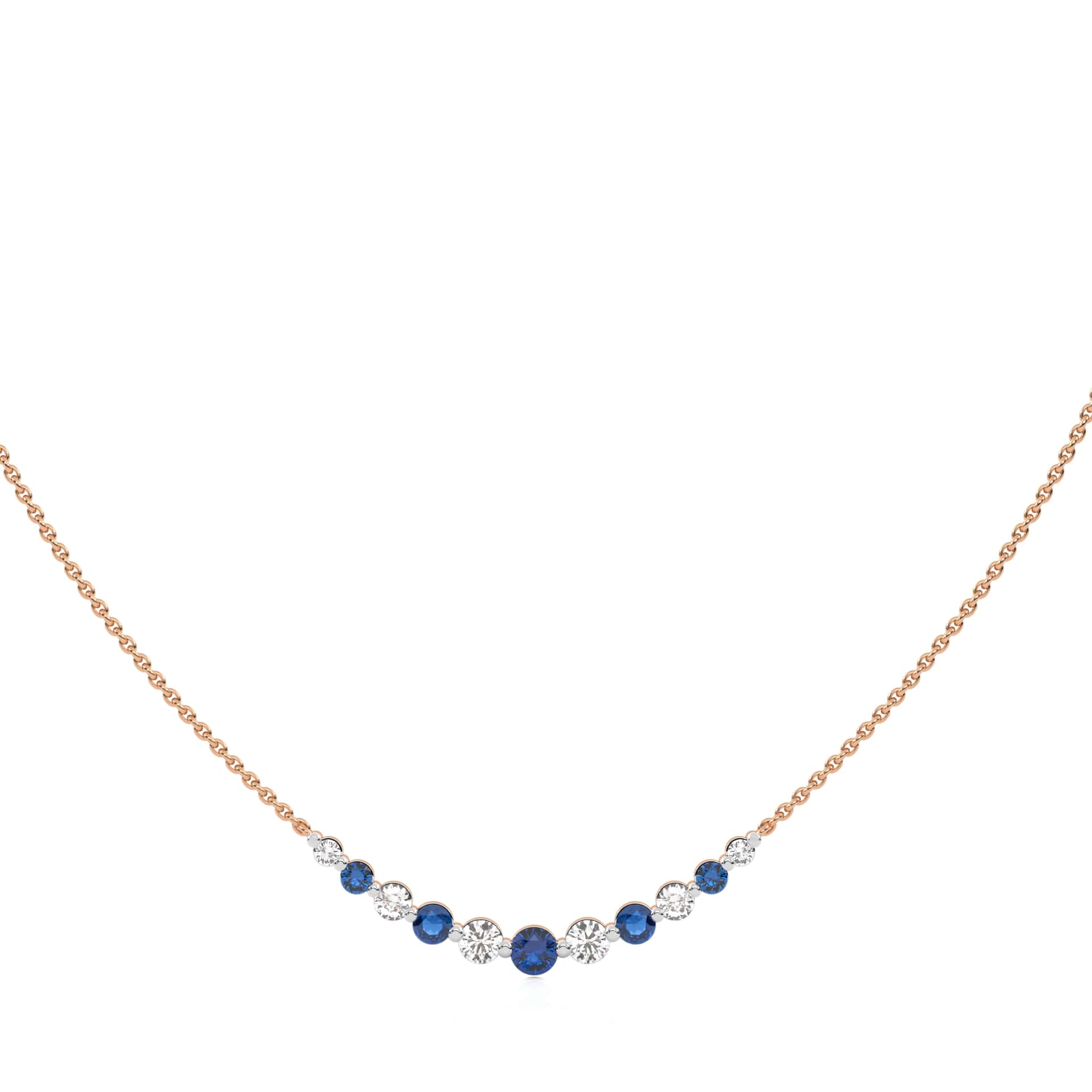 This exquisite graduated necklace features 1 CT. of round natural diamonds, beautifully paired with rich blue sapphires. Set in a prong design with H-I/I1-I2 quality, it offers a graceful and captivating reflection of elegance and natural beauty