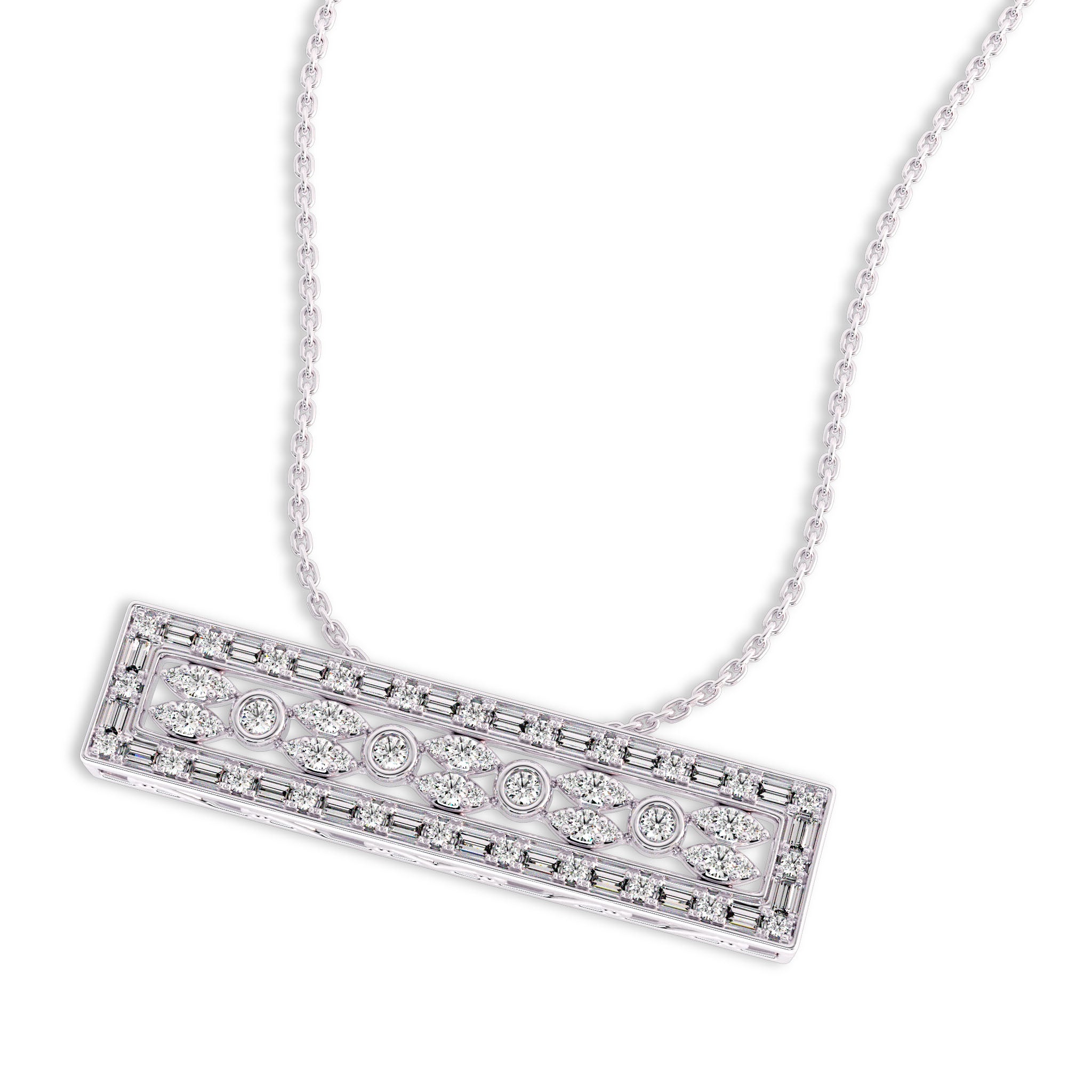 Adorn your neckline with our 1 CT. Lab Created Round and Baguette Diamond Studded Designer Bar Necklace, a unique masterpiece of elegance. Featuring the mesmerizing interplay of DEF/SI diamonds in micro split, pave, bezel, and prong settings, this necklace is a symbol of your distinctive style and sophistication, showcasing the artistry of love and luxury