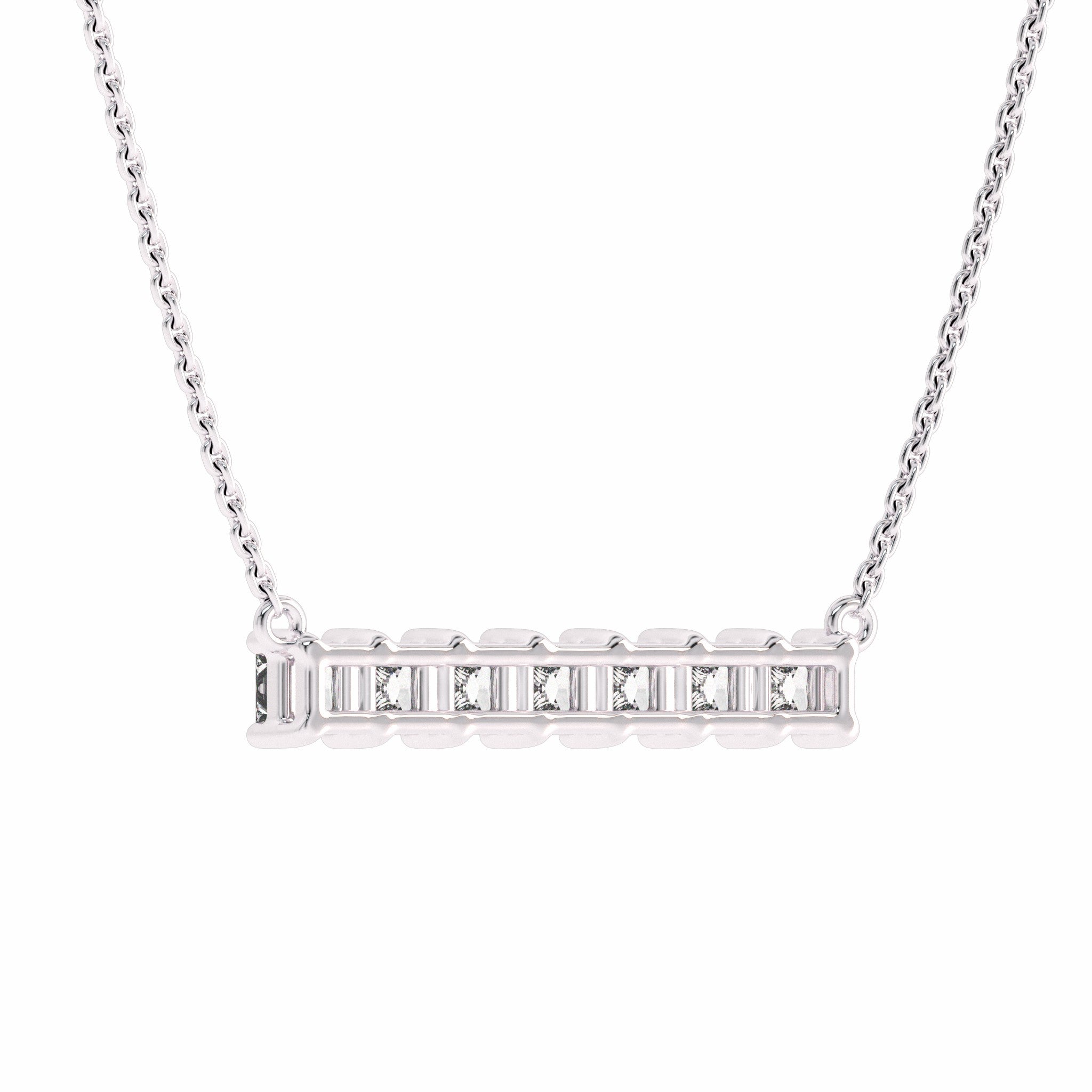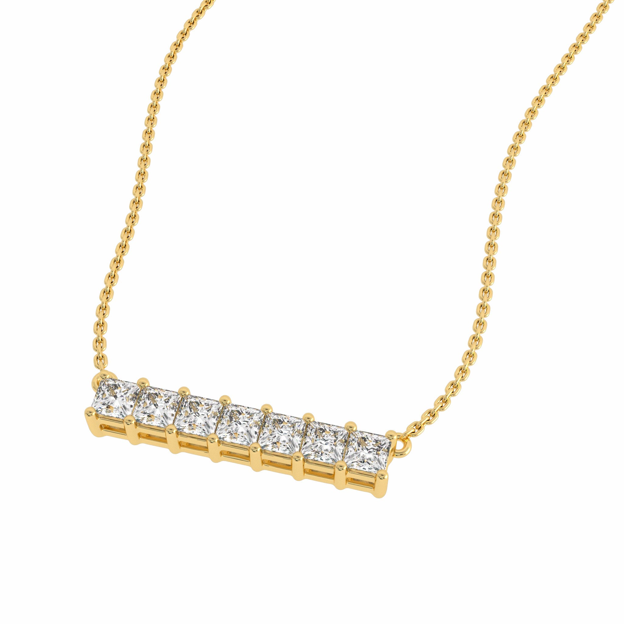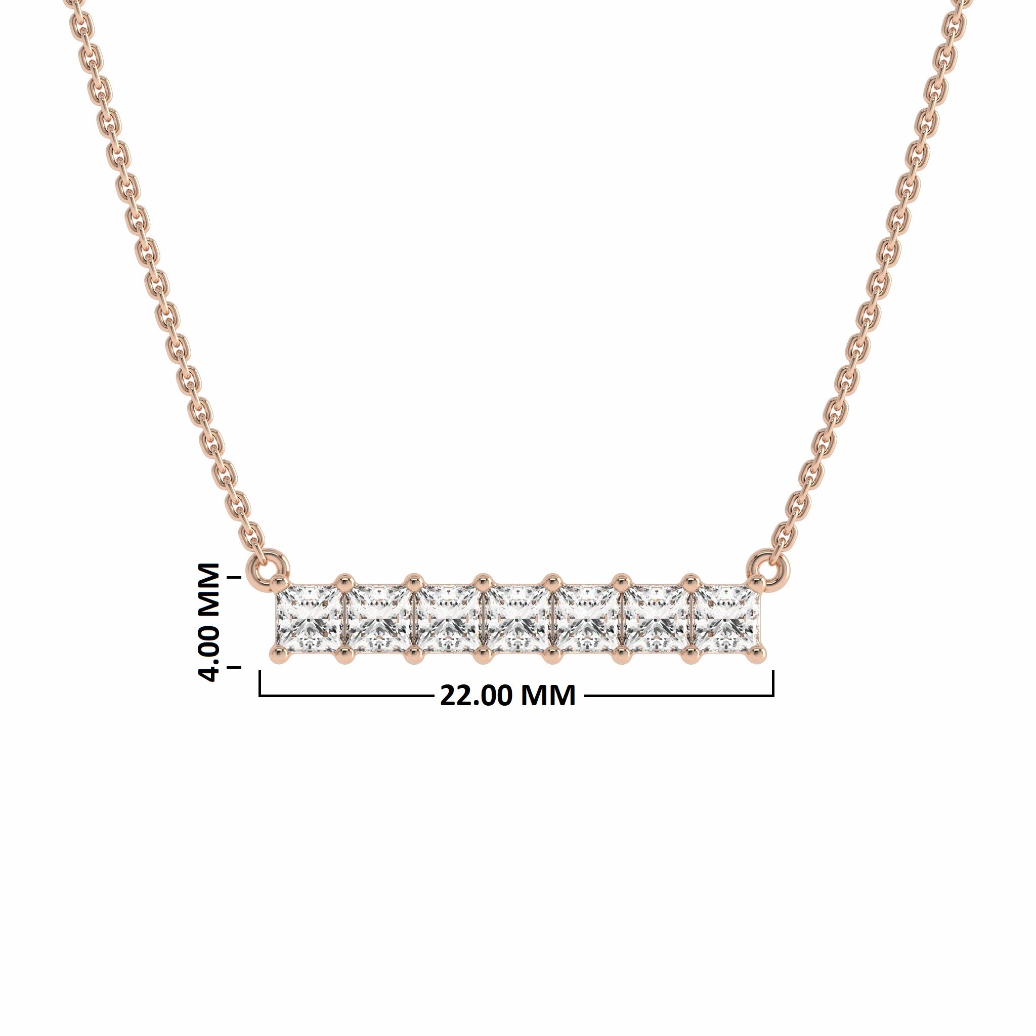 This princess diamond bar necklace adds glamour to your collection. The design showcases an elegantly timeless arrangement that complements just about any ensemble. It is studded with 1 carat of DEF/SI quality lab-created diamonds. The 18-inch princess necklace never fails to impress.