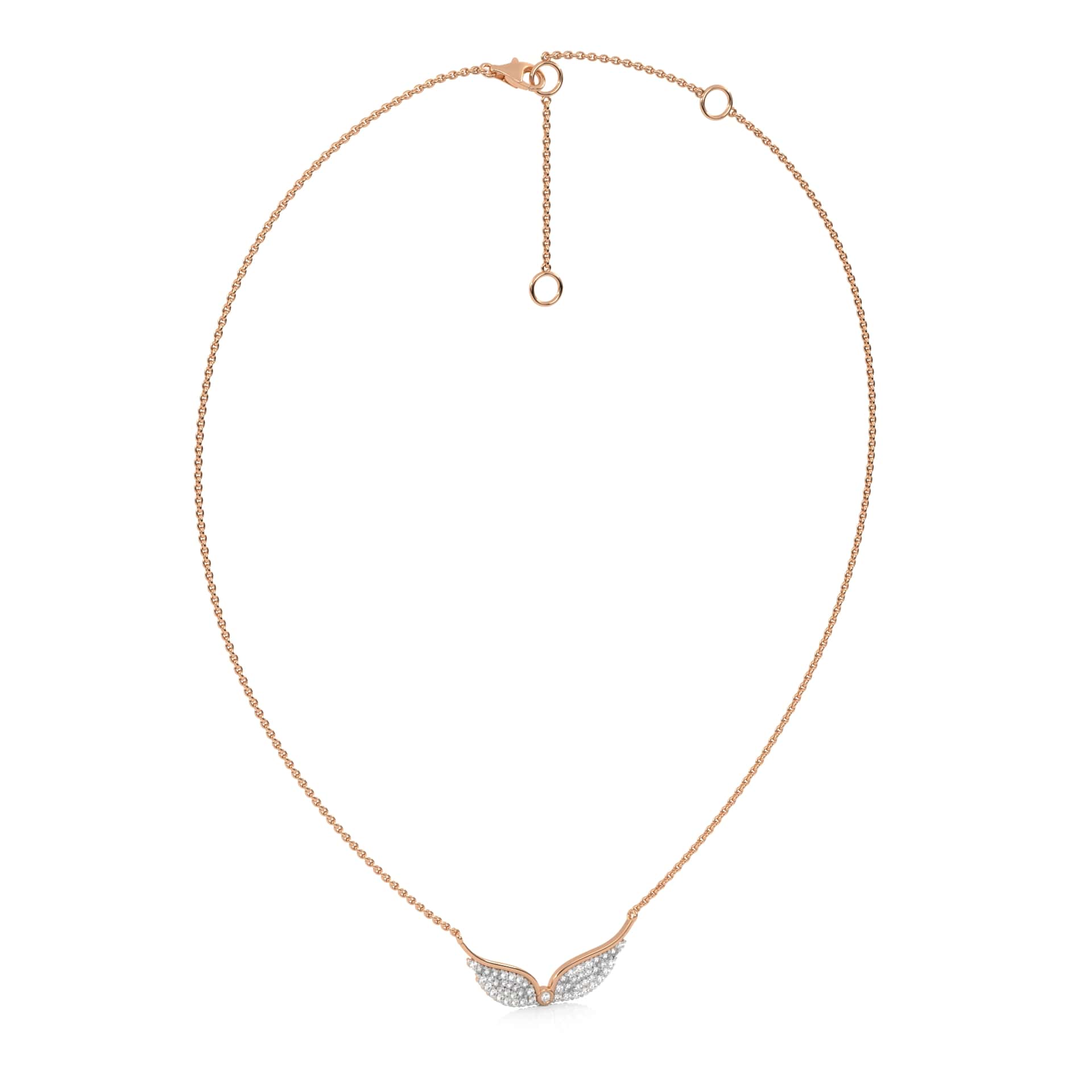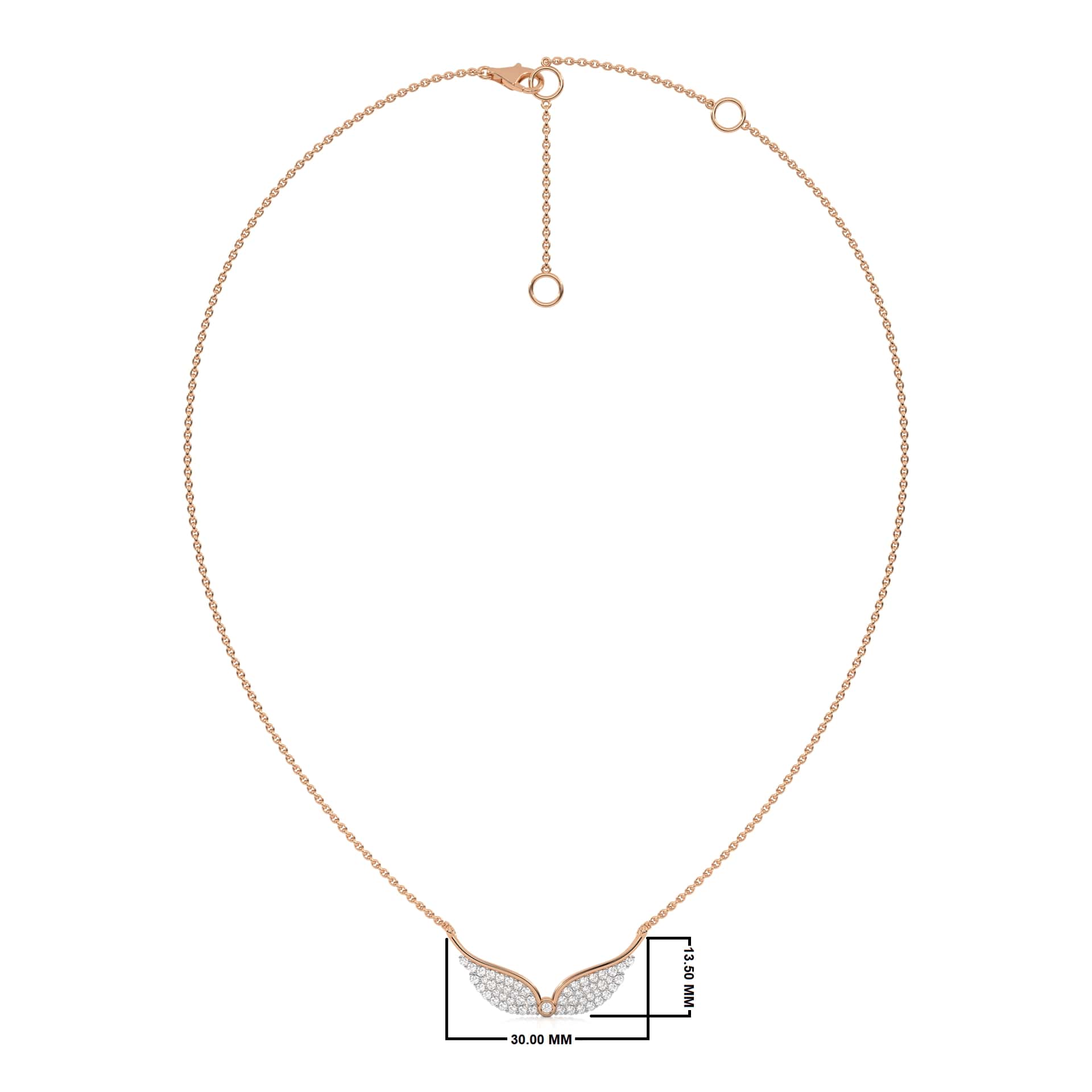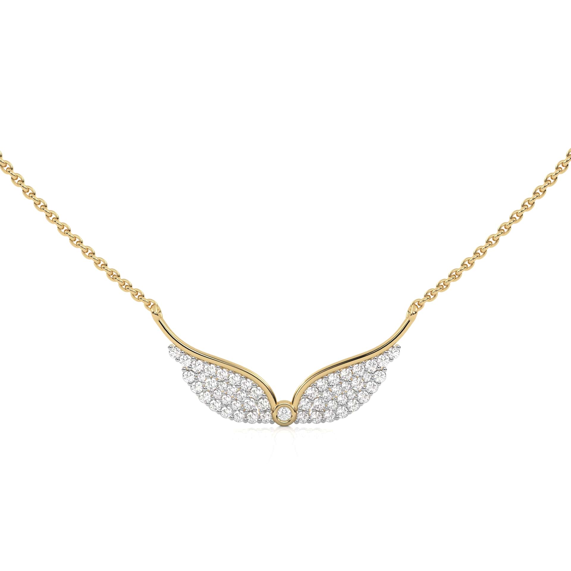 This Round Lab Created Diamond Angel Wings Pendant Necklace features 1/2 carats of round DEF/SI quality Lab Created diamonds in a prong setting. The angel wings design symbolizes protection and grace, radiating a delicate brilliance with each movement. Perfect for adding a touch of elegance and meaning to any occasion