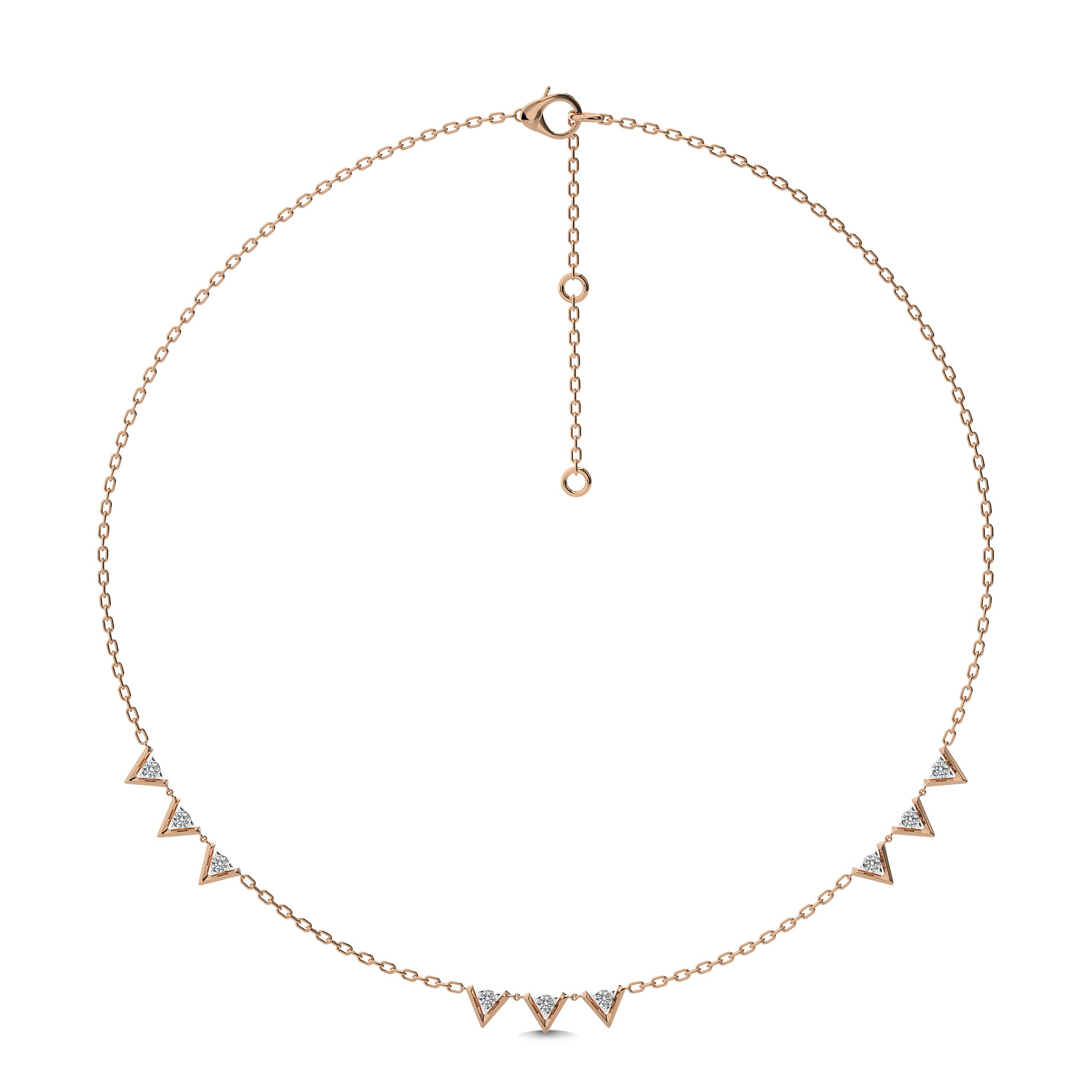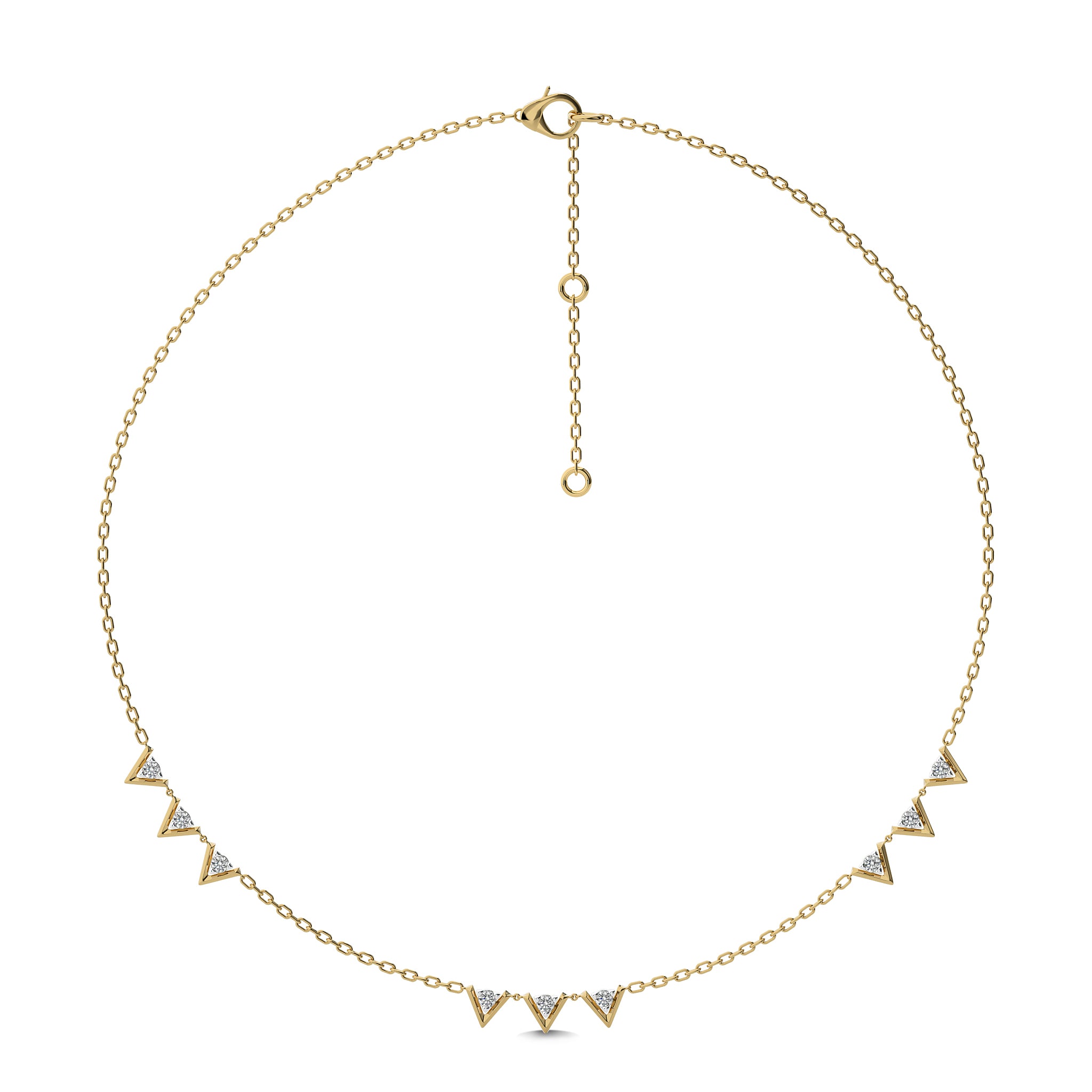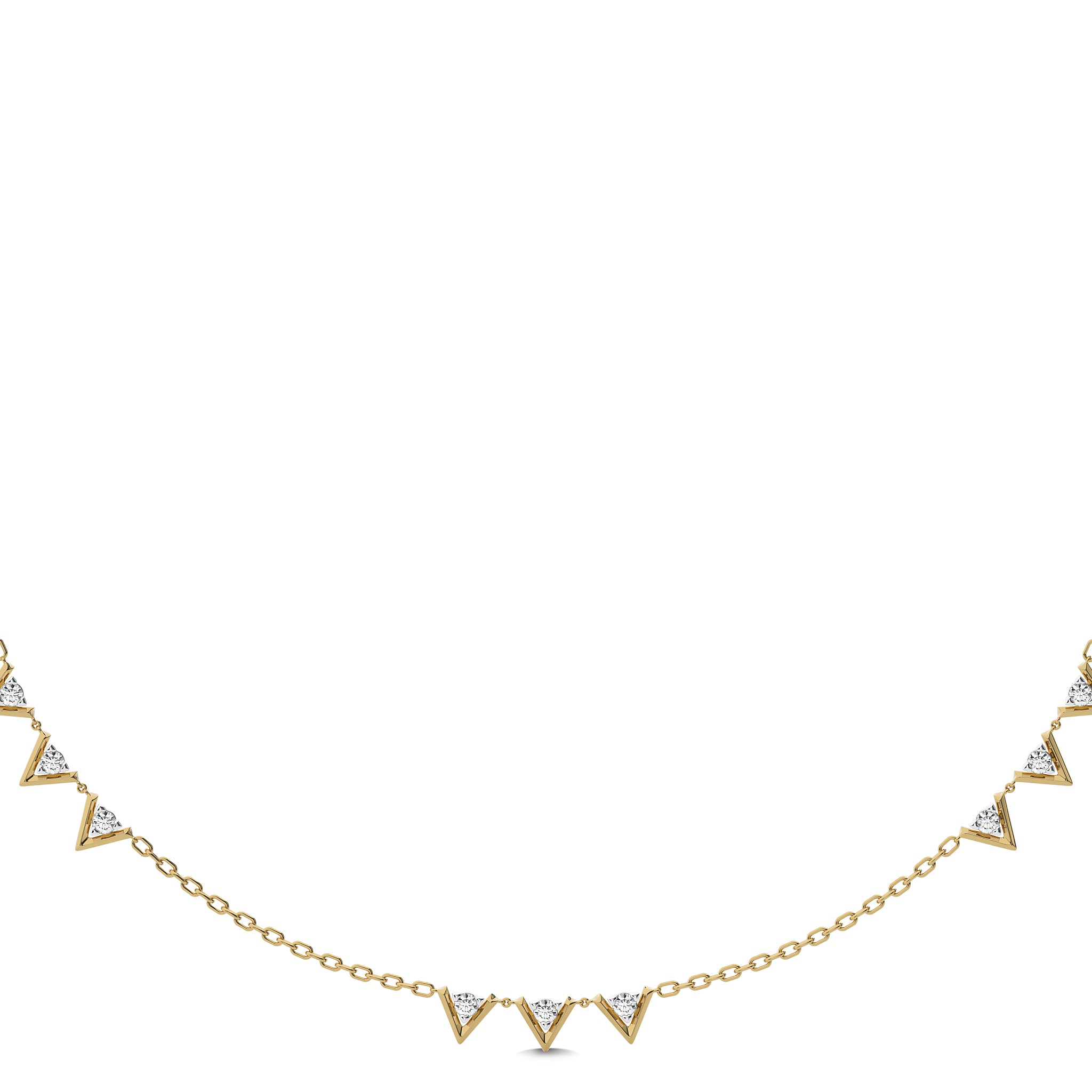 Uplift your style with our Dainty V motifs necklace, featuring 1/2 carat of natural round diamonds of H-I/I1-I2 quality. Each diamond is set in a secure prong setting, creating a delicate yet dazzling look