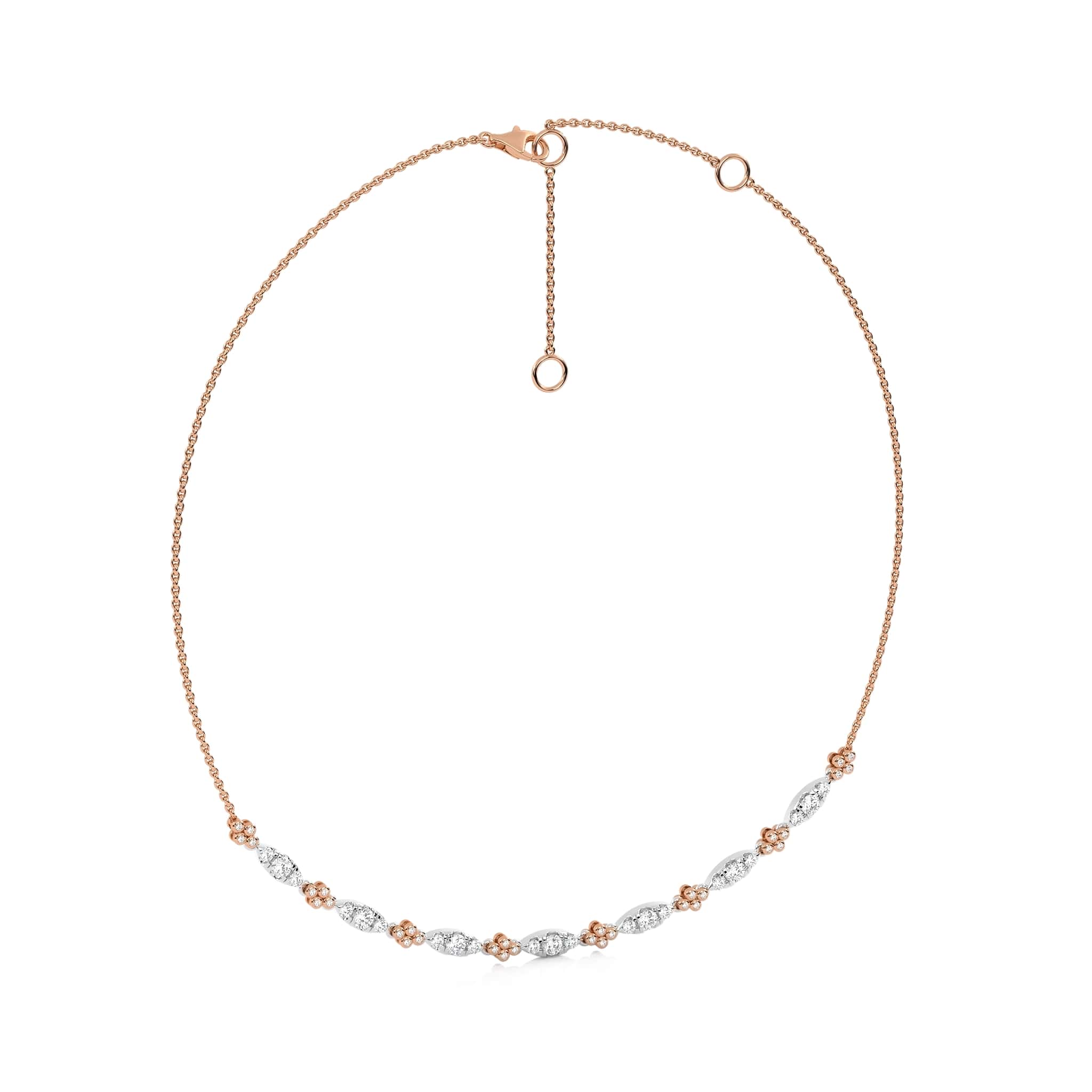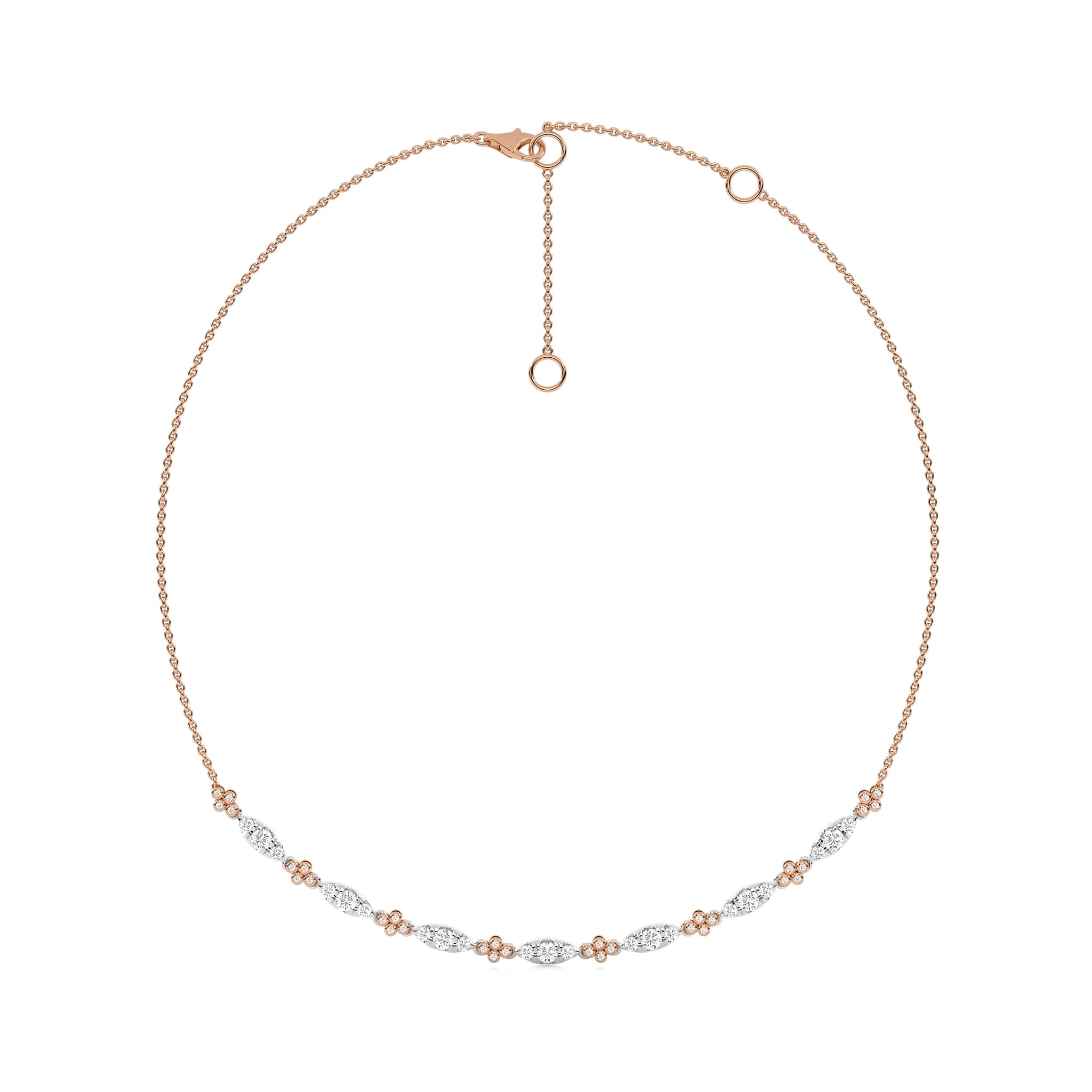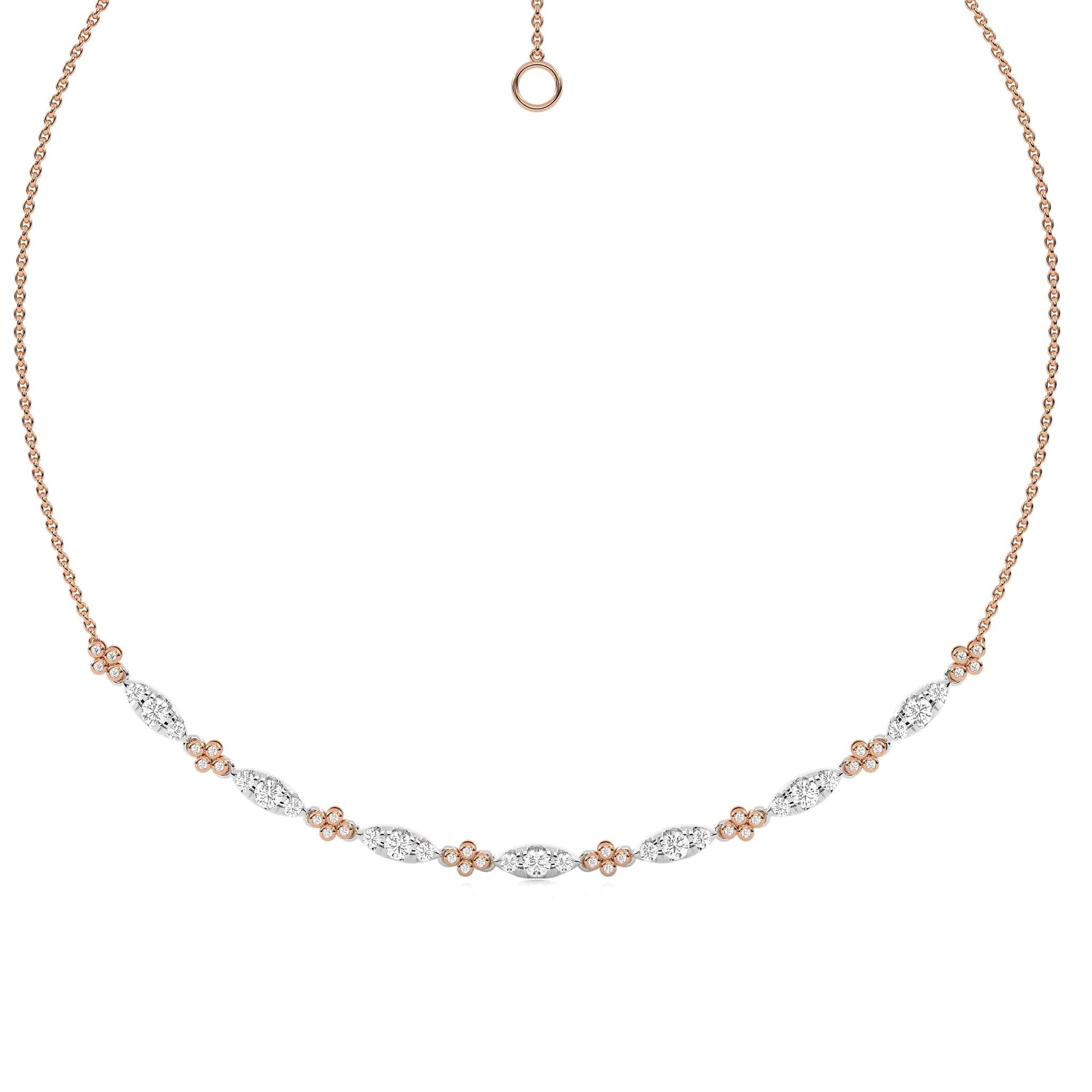 Let's have a look at this stunning 1 1/2 CT. round Natural diamond two-tone necklace. Featuring H-I/I1-I2 quality diamonds in a bezel and micro-split setting, it radiates brilliance with a captivating contrast of metals