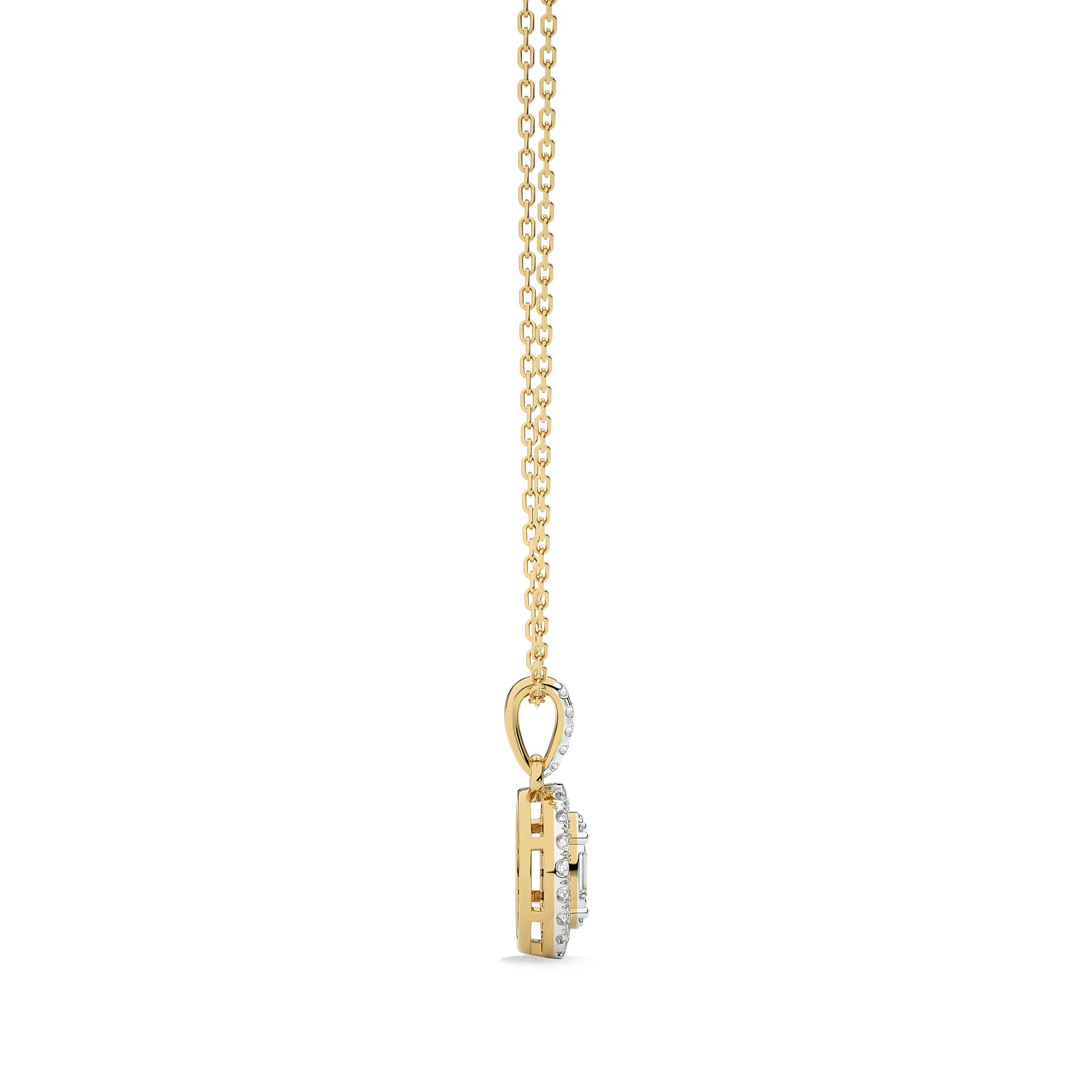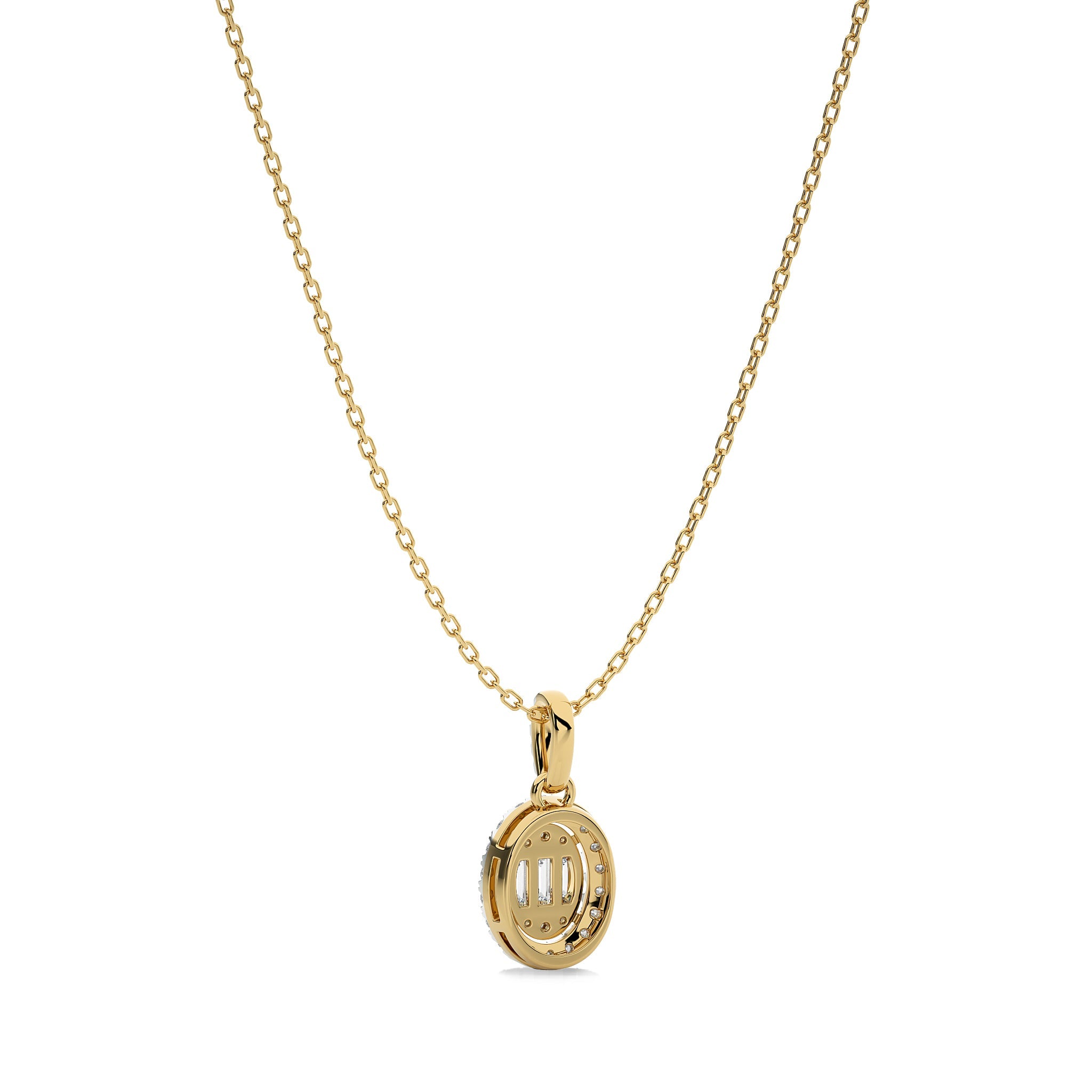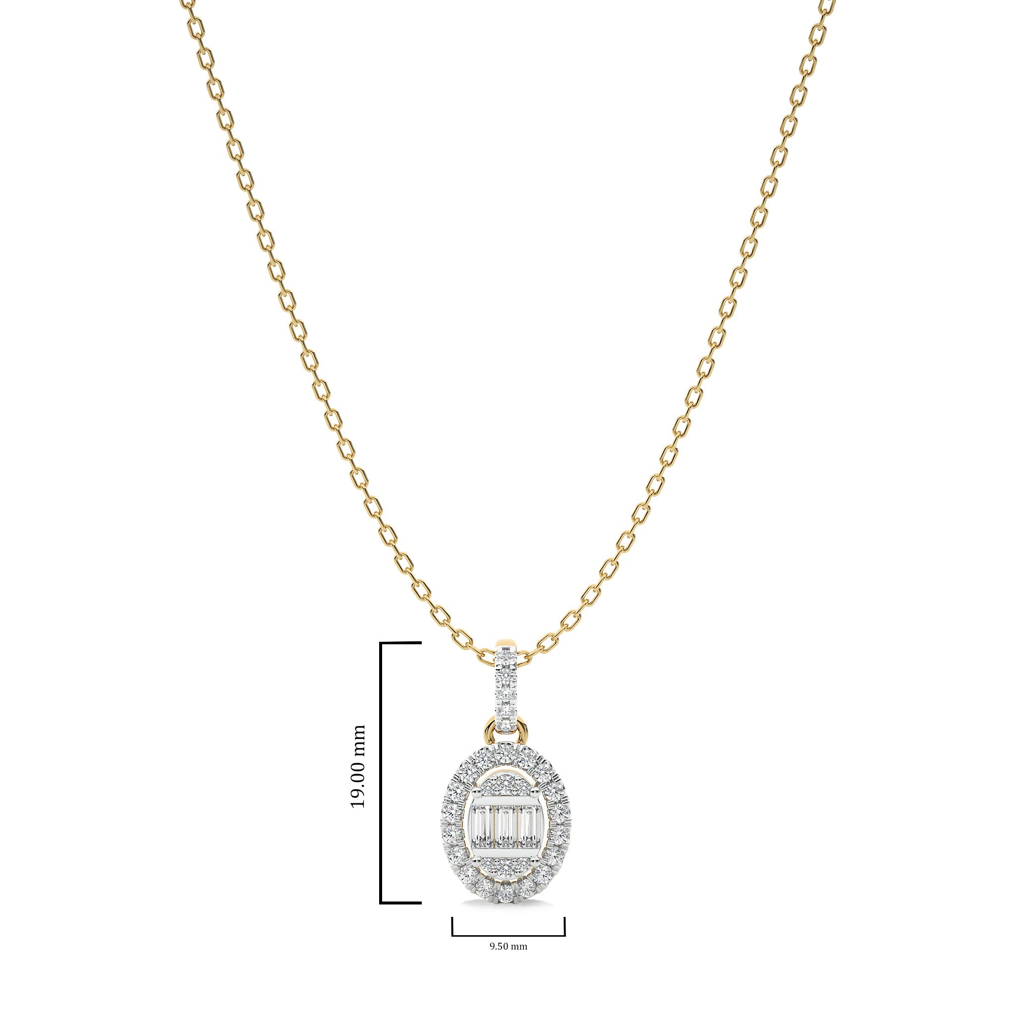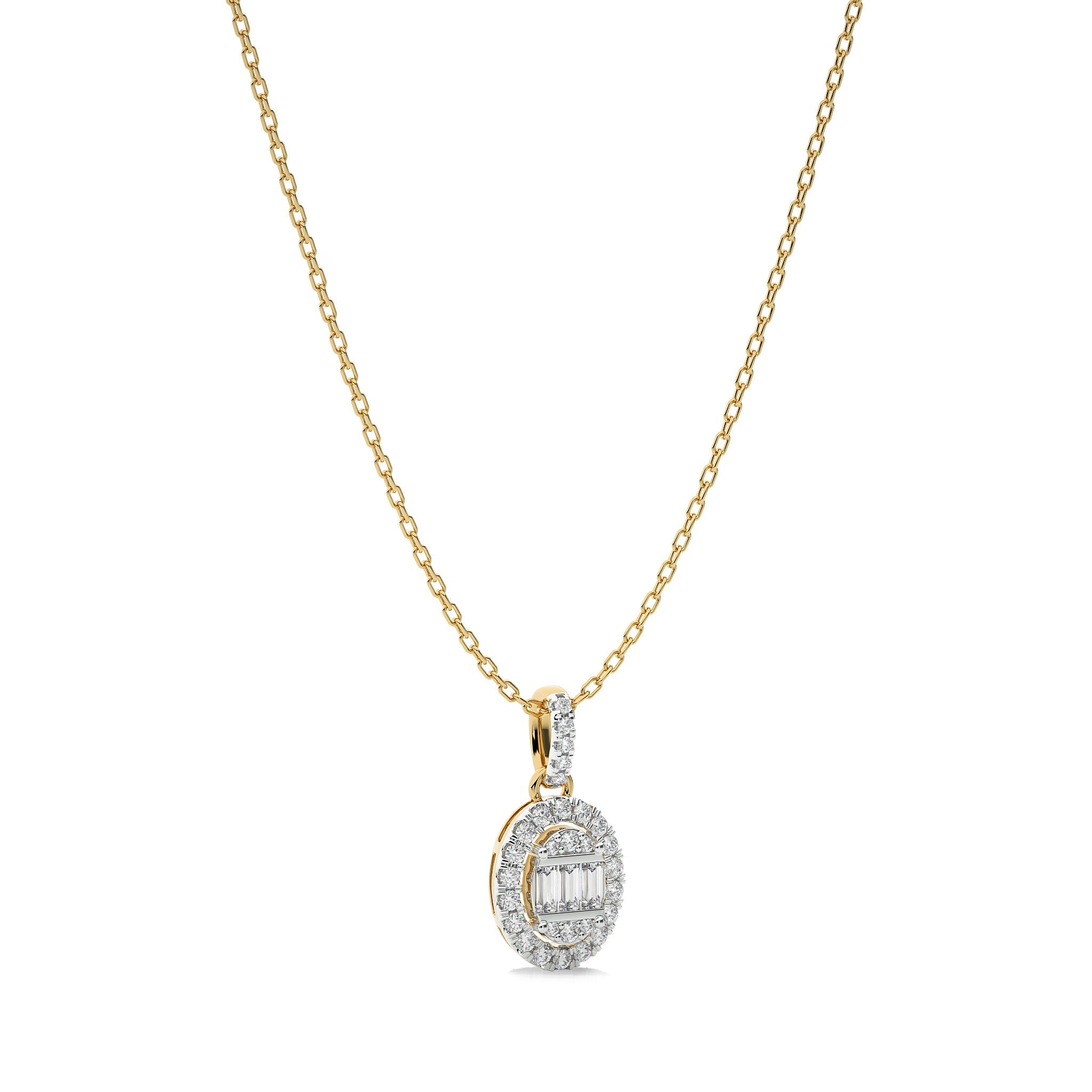 Unleash your elegance with this 3/8 CT. Oval Shape Halo Round and Baguette Natural Diamond Pendant, showcasing H-I/I1-I2 quality diamonds in a micro split, prong, and channel setting. This captivating pendant is a versatile piece that effortlessly enhances any outfit