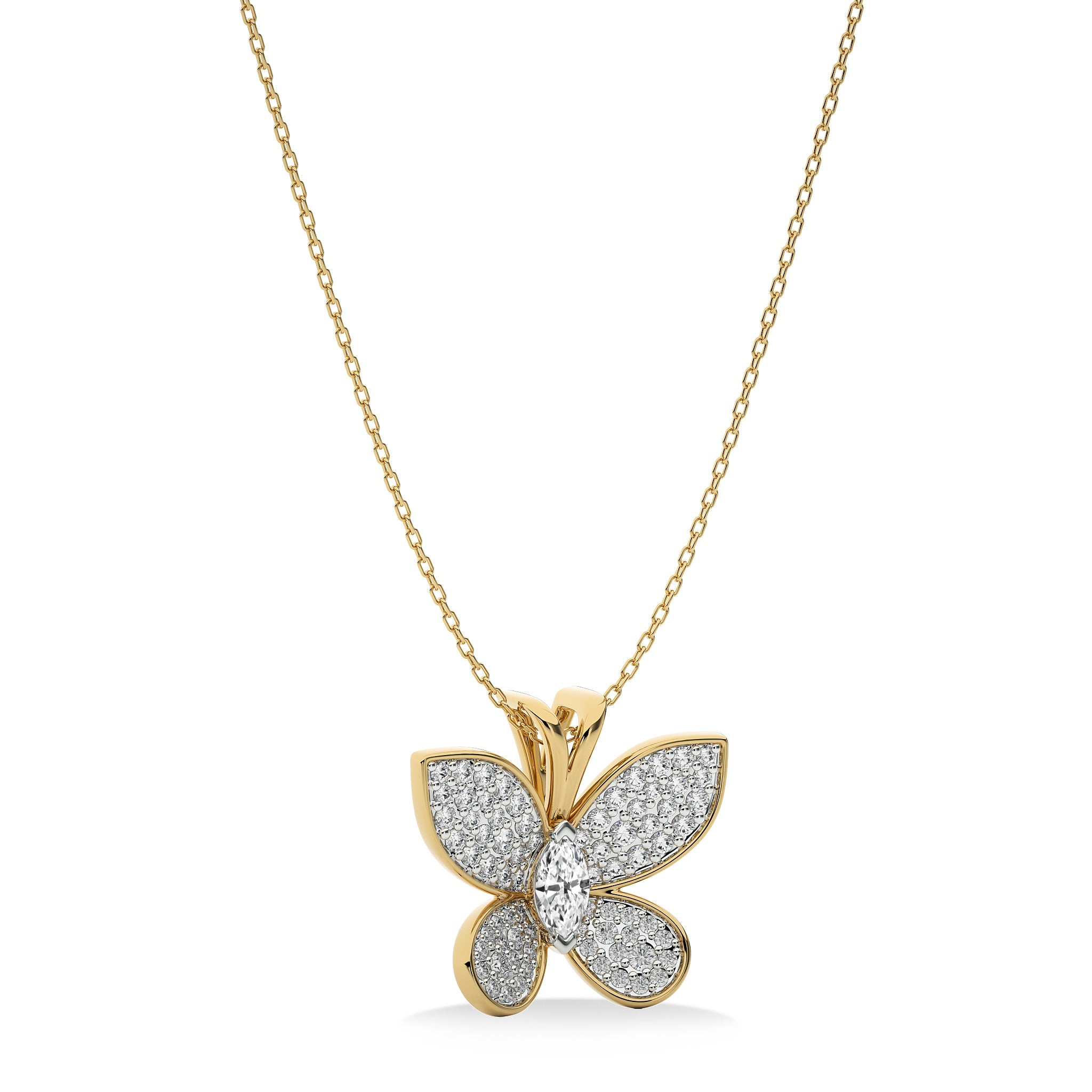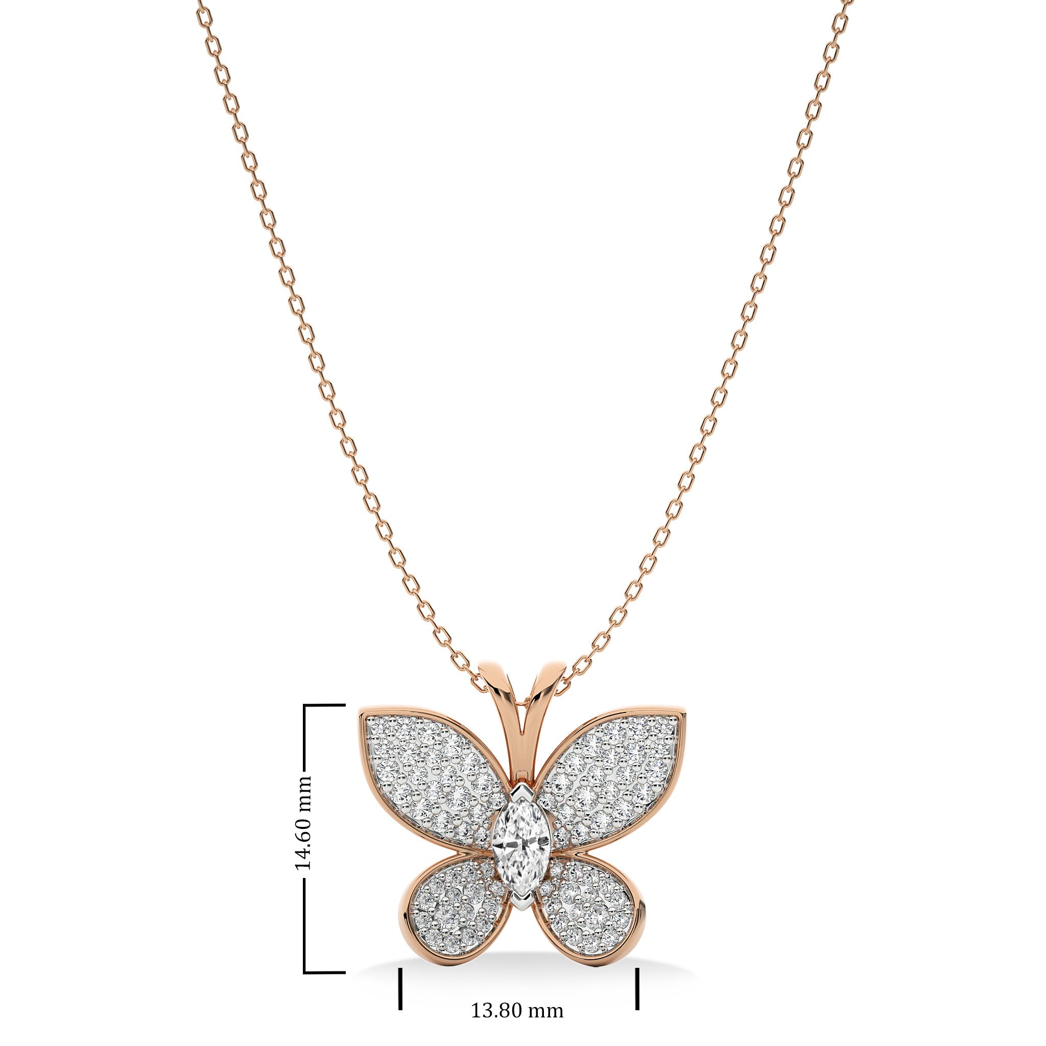 Delight in the elegance of this 3/4 CT. Butterfly Natural Diamond Pendant dazzling H-I/I1-I2 Quality stones are expertly set in a stunning Pave and Prong Setting,a true symbol of grace and beauty