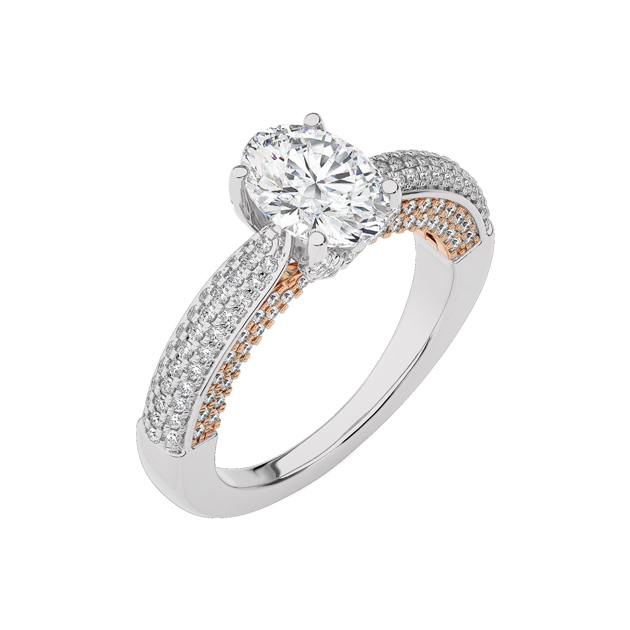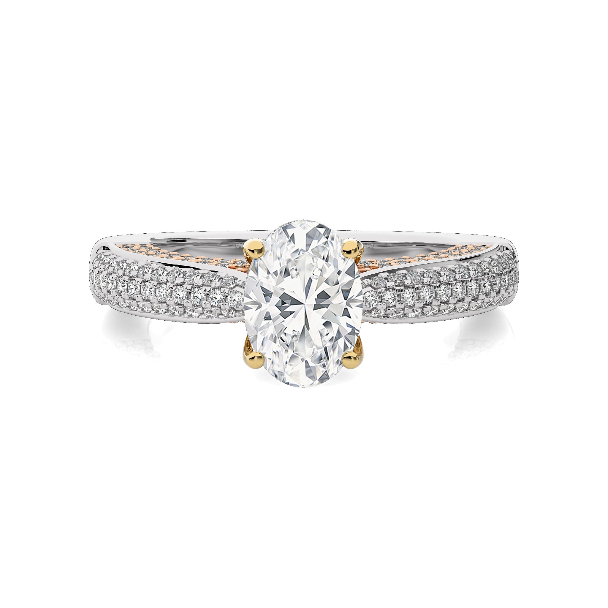 A celestial masterpiece, this three tone engagement ring showcases a 1 1/2 carat oval lab-created diamond at its center, flanked by 3/4 carat round side stones. The three tone setting, crafted in DEF/SI quality with micro split and prong settings, adds a distinctive flair. This ring symbolizes the unity of your love, shining with a brilliance that reflects the merging of two hearts into one