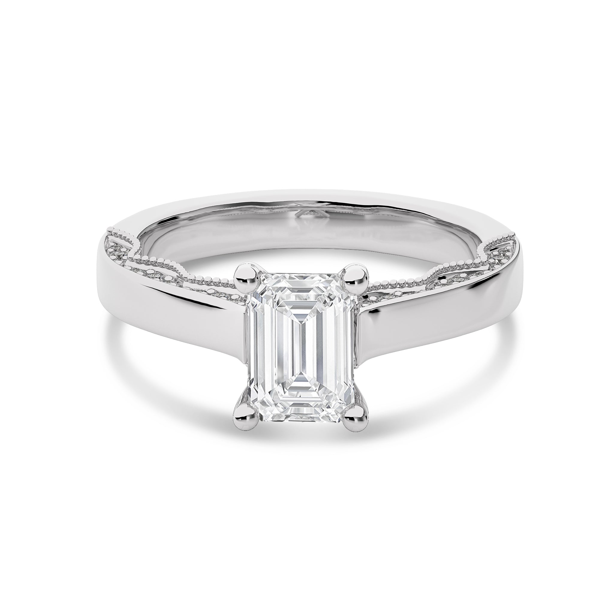 Showcase your style with this vintage 1 3/4 carat emerald cut solitaire Lab Created diamond engagement ring. The studded edge offers a classic touch, while the pave and prong settings highlight the DEF color, SI clarity diamond's dazzling brilliance. Celebrate your special moments with this timeless and striking ring