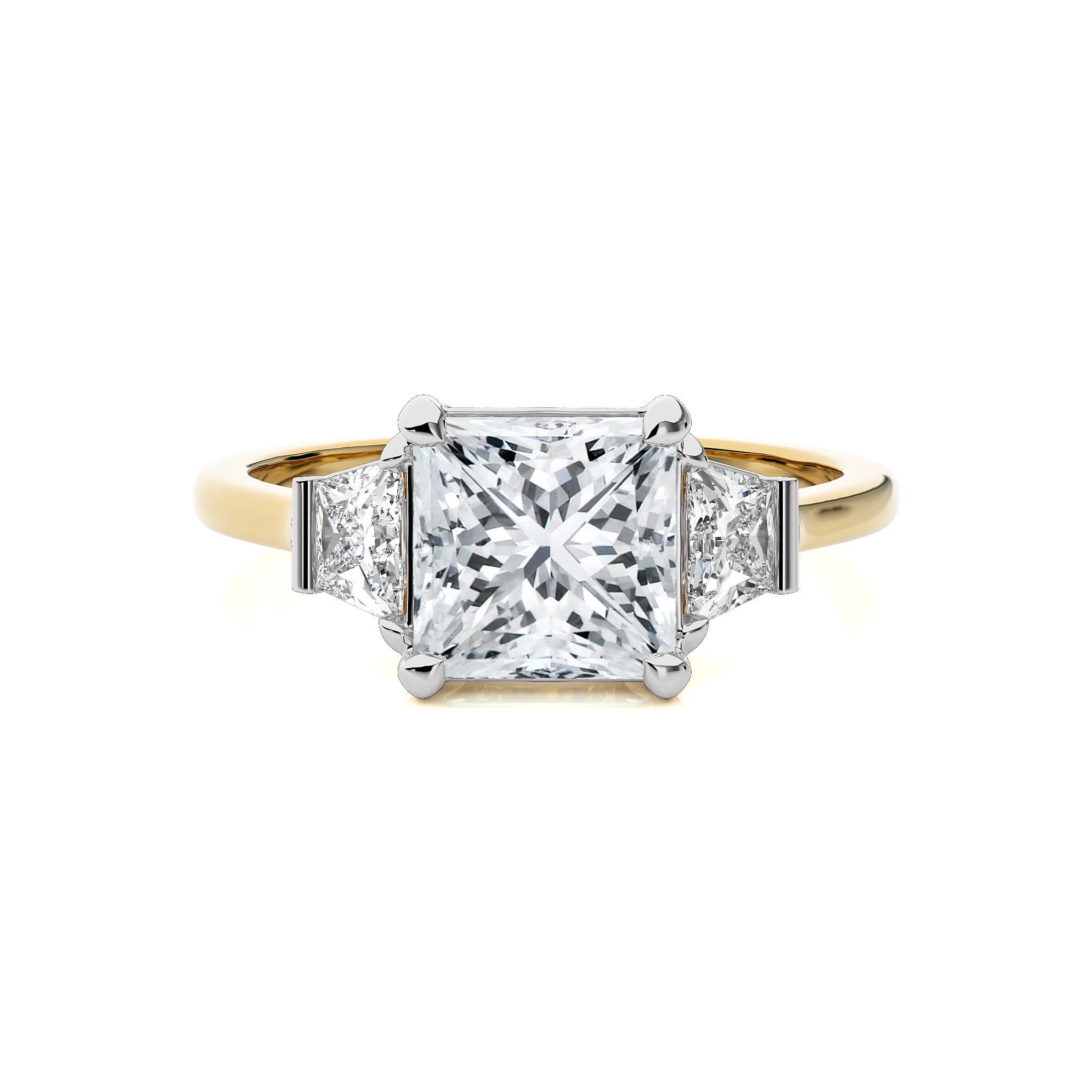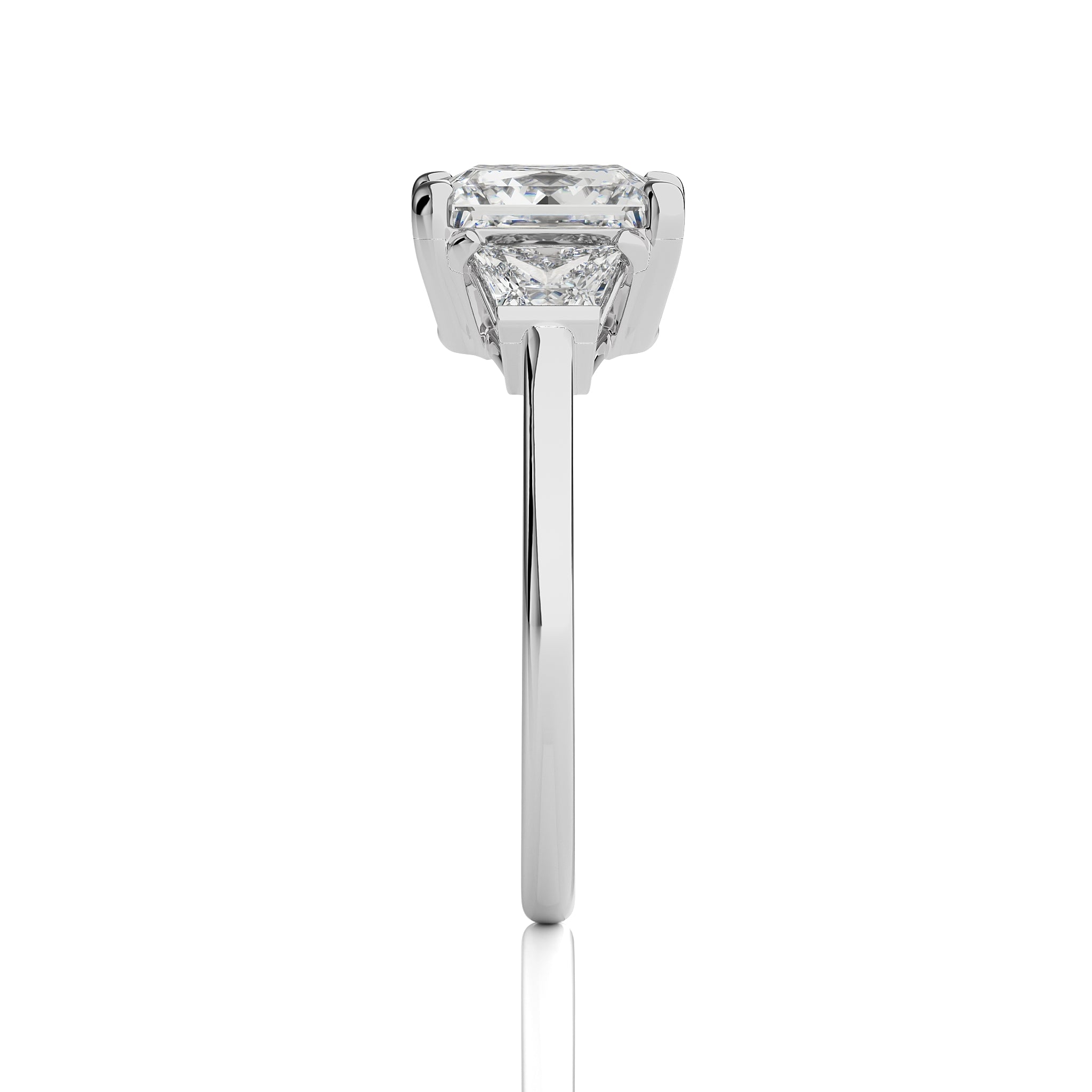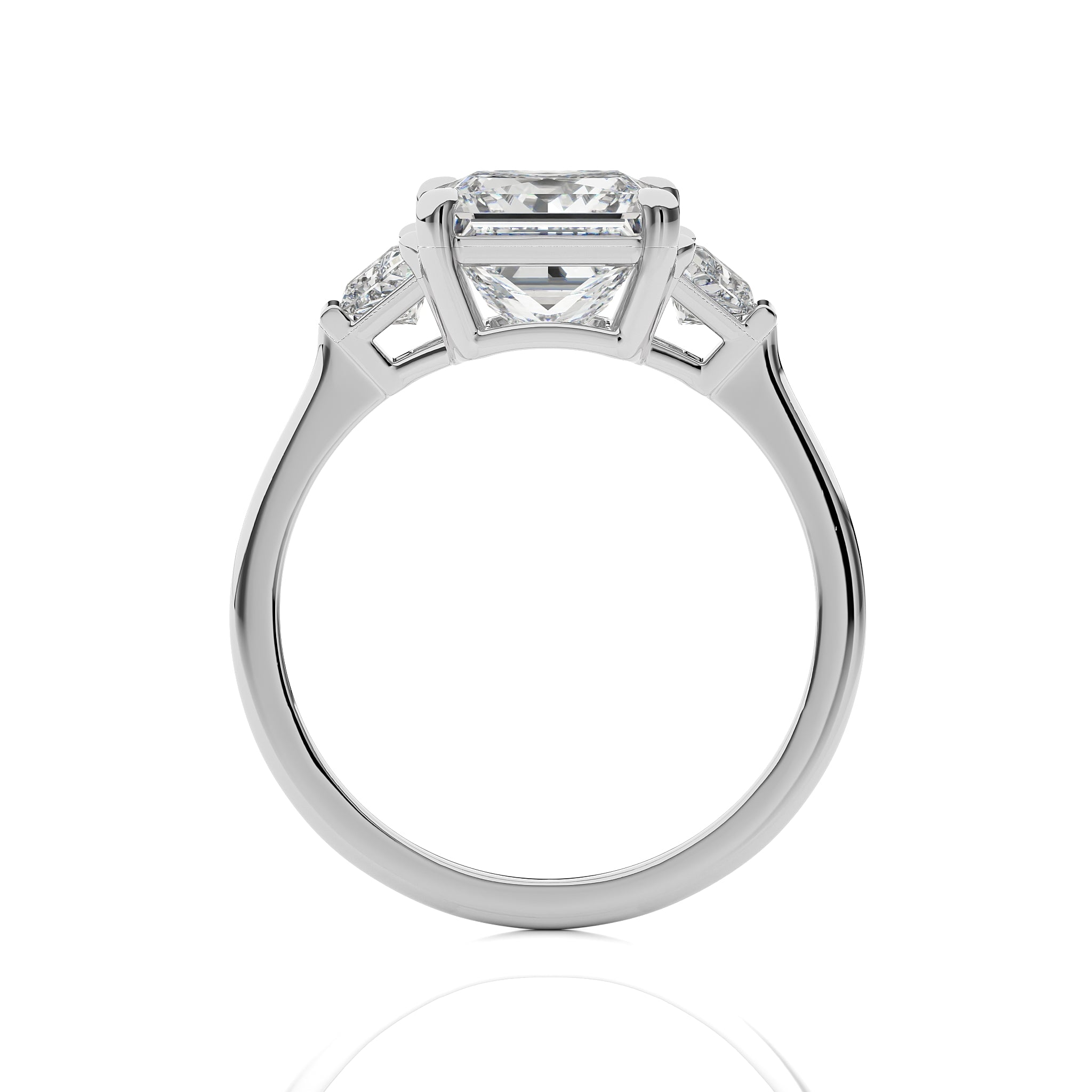 Experience Grace with this stunning three stone engagement ring featuring a 2 1/2 carat princess cut lab created diamond at its center, flanked by two 1/2 carat step cut trapezoid lab created diamonds, all set in high-quality DEF/VS diamonds, this ring is a timeless symbol of love and commitment