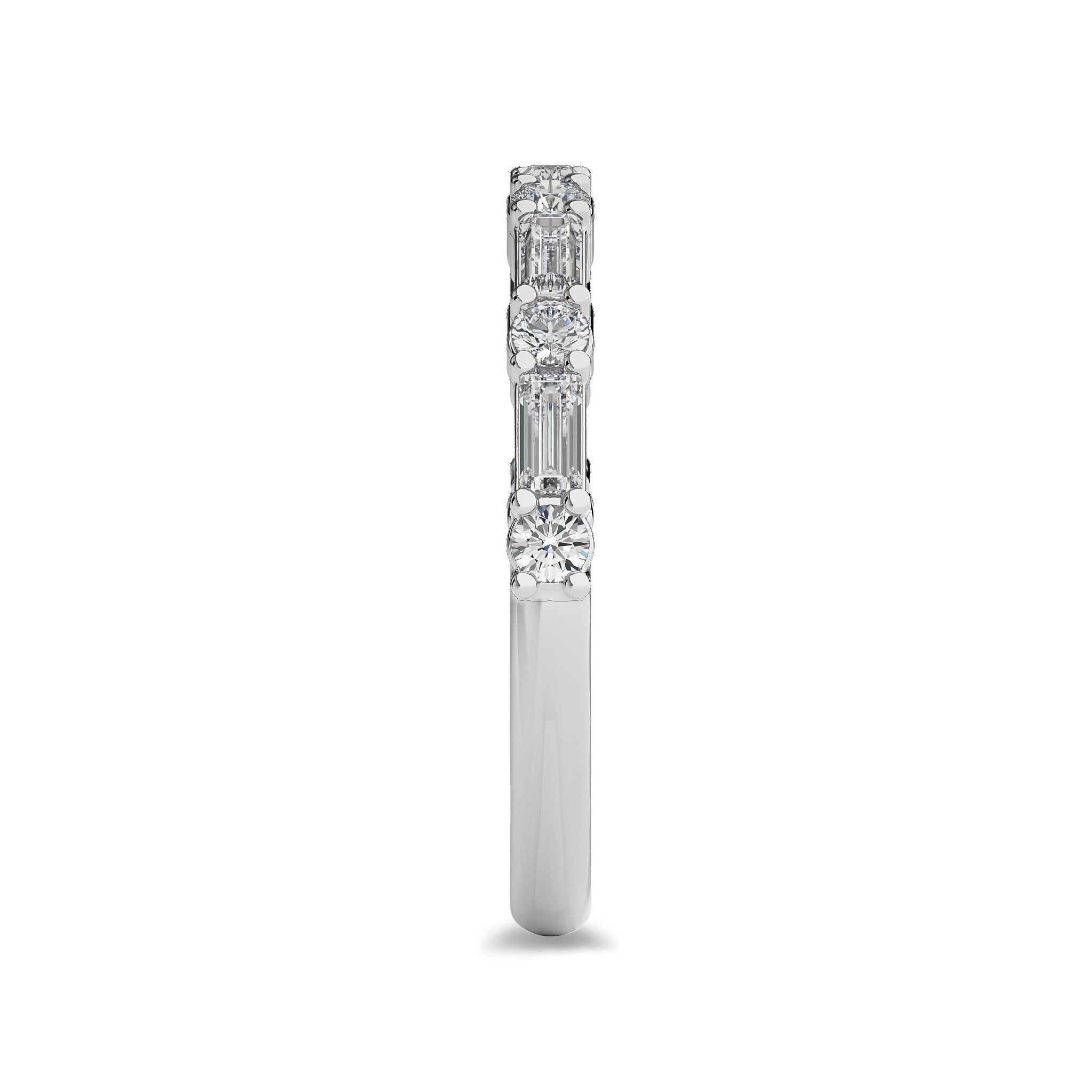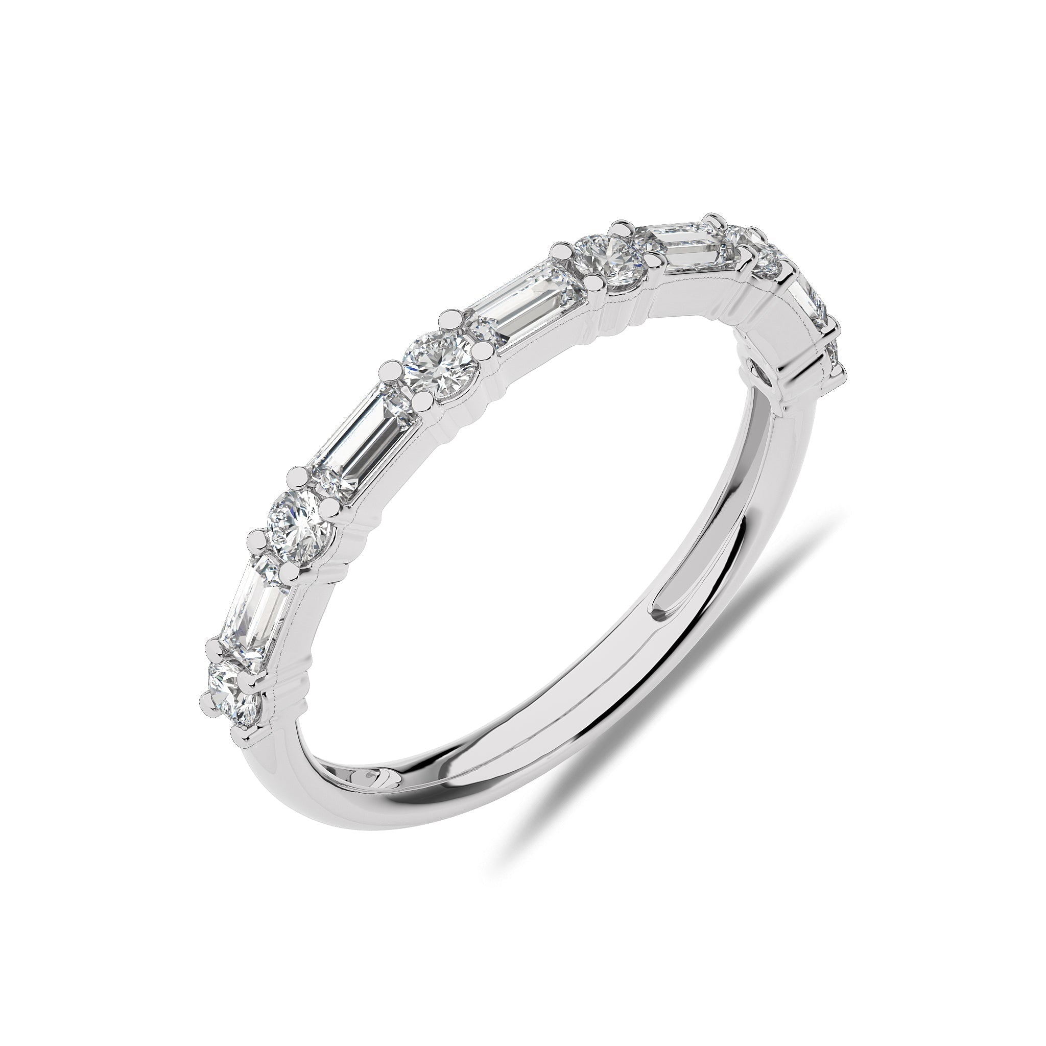 This elegant wedding band showcases 1/2 carat of round and baguette Natural diamonds in H-I/I1-I2 quality, meticulously set in prong settings. The seamless combination of diamond shapes offers a sophisticated touch, ideal for celebrating your union with grace and style