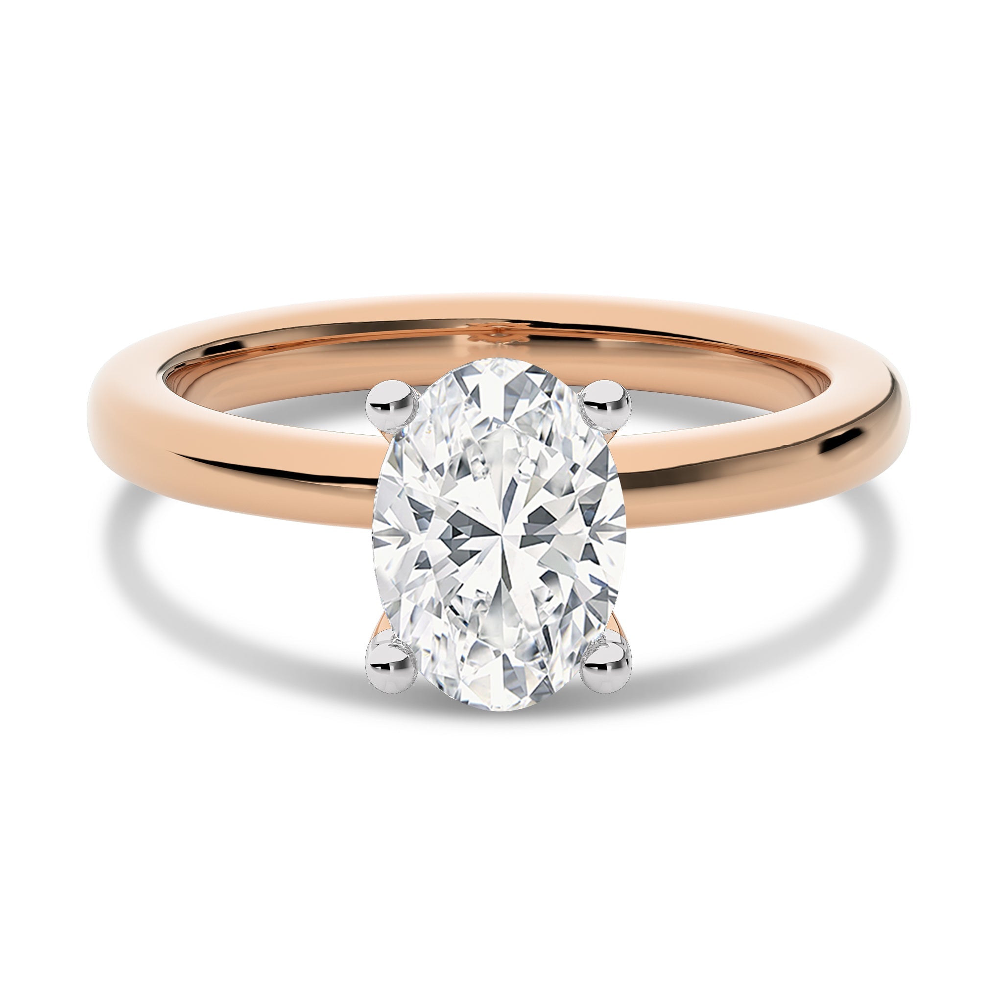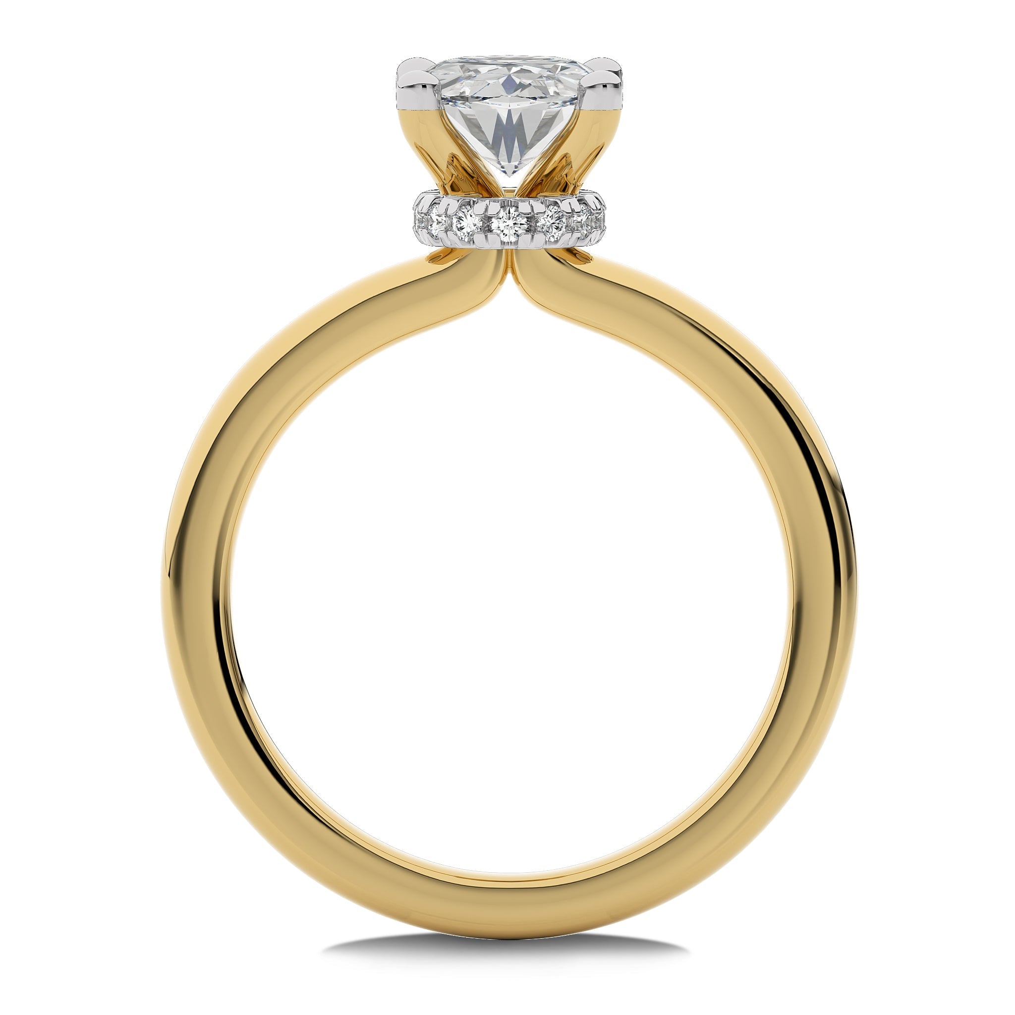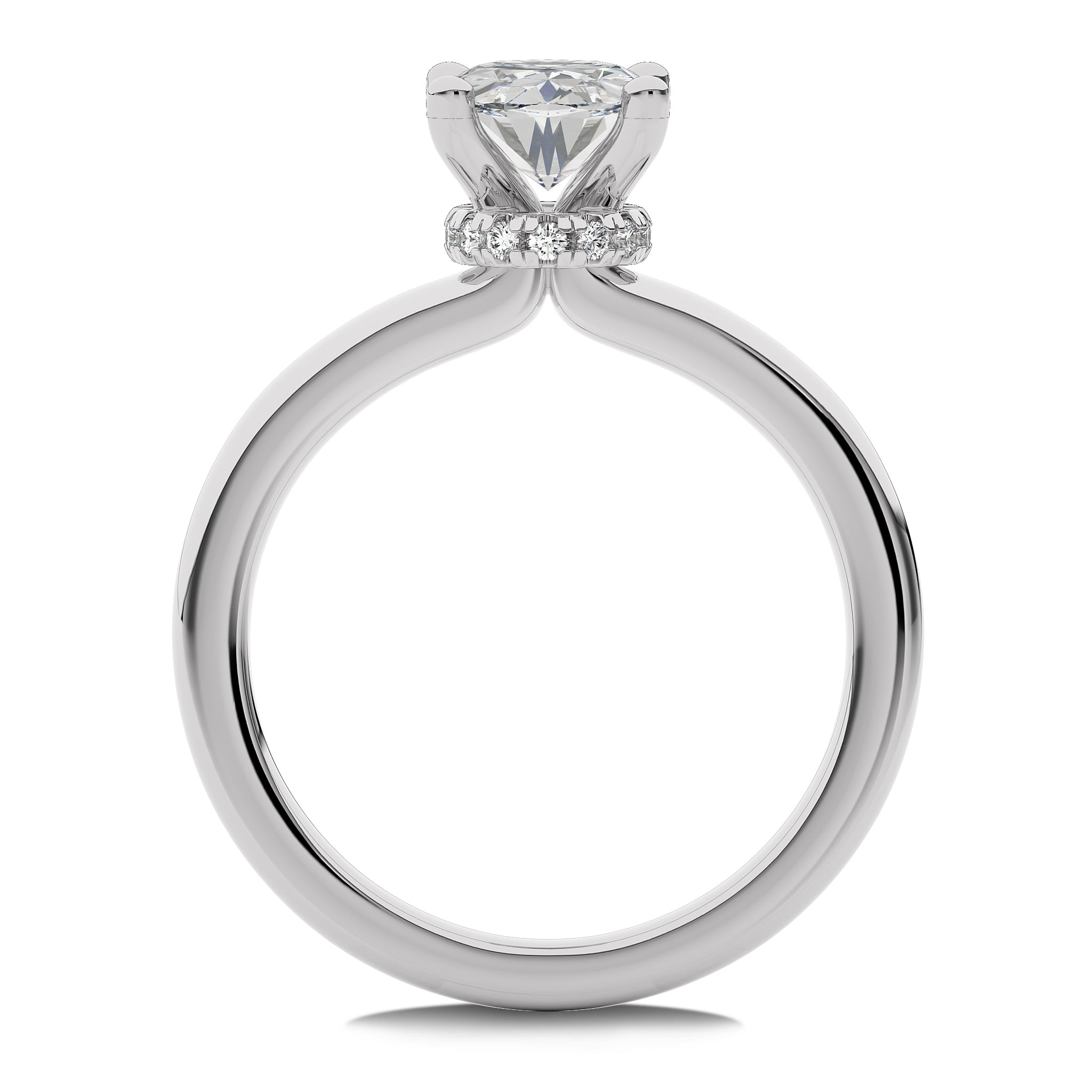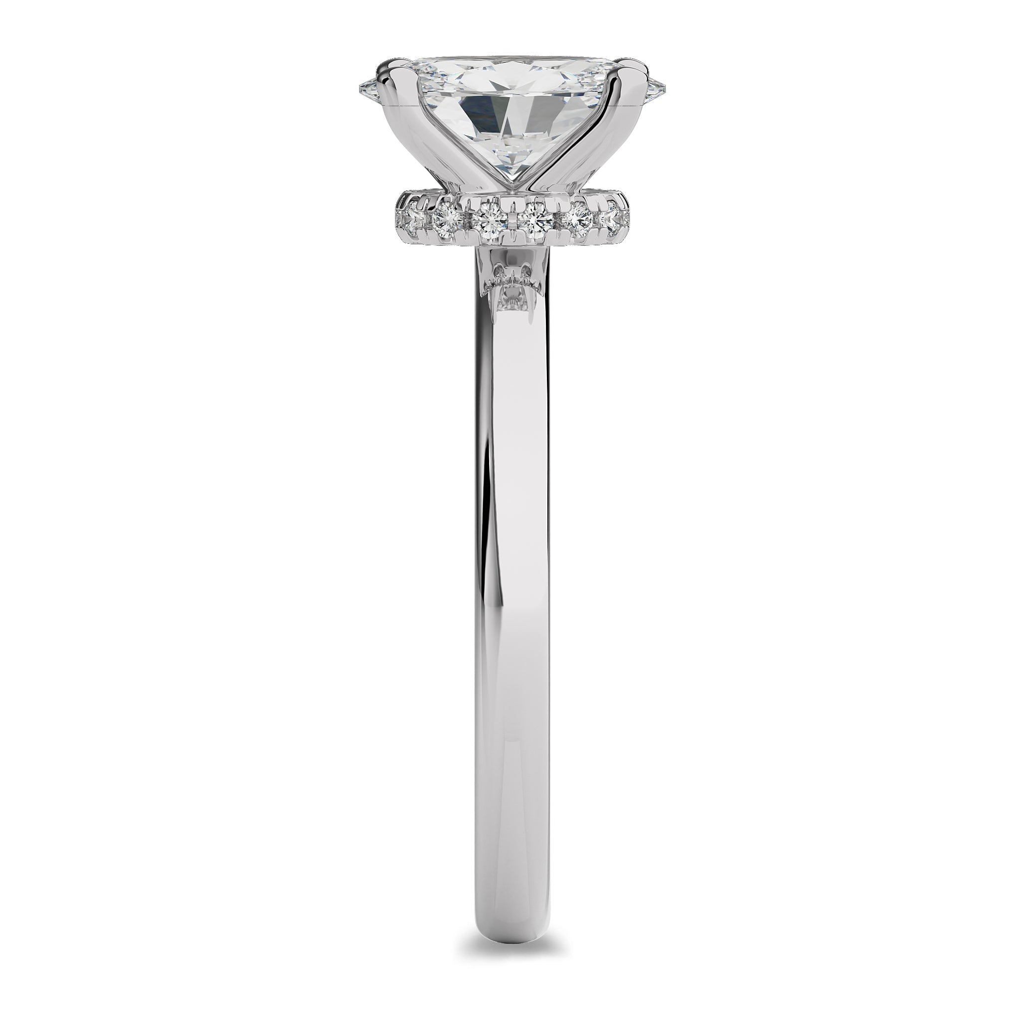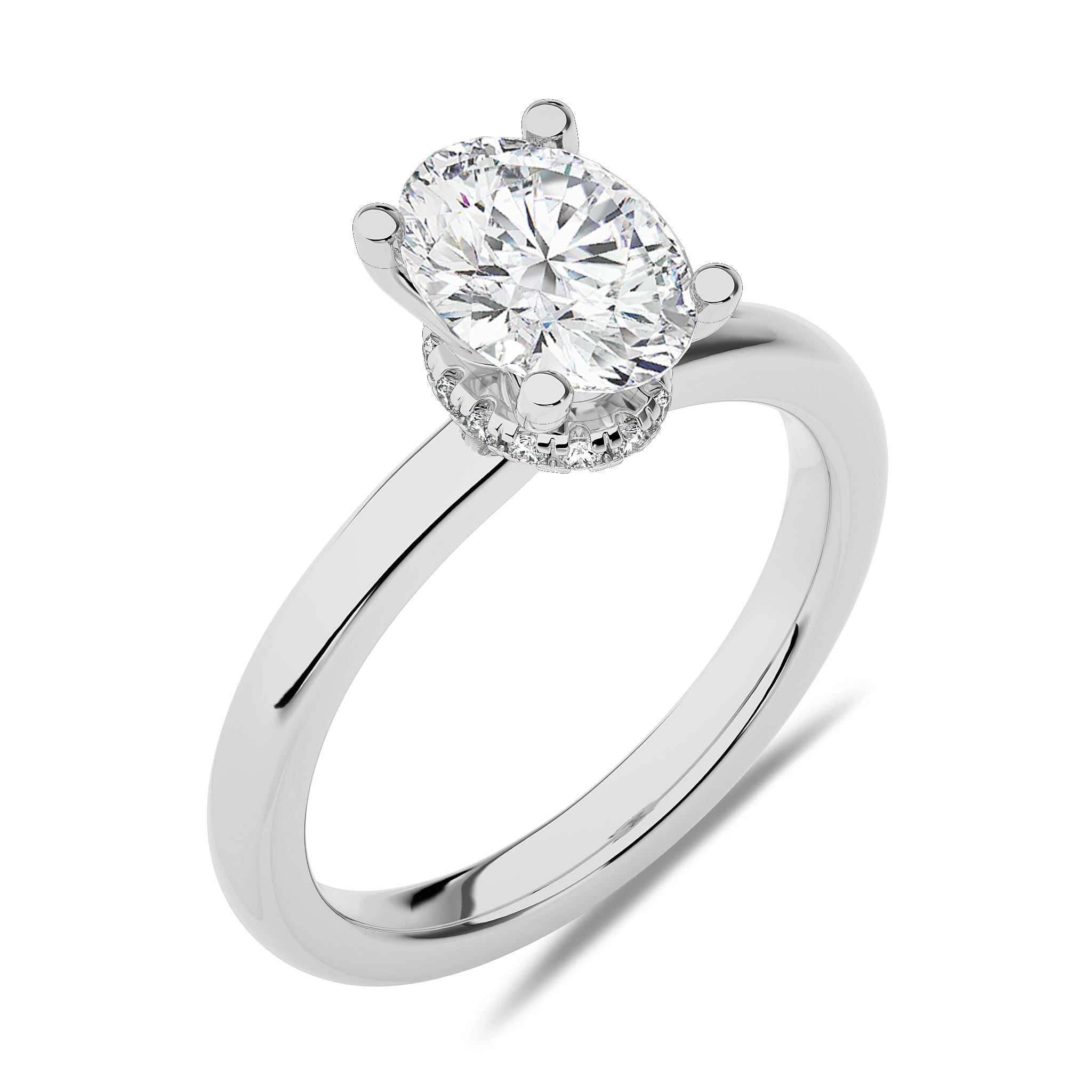 This engagement ring features a 1 1/2 carat oval lab-created diamond with a hidden halo, set in DEF/SI quality with micro split and prong settings. The hidden halo adds an extra layer of sparkle and sophistication, making this ring a radiant symbol of your love and commitment