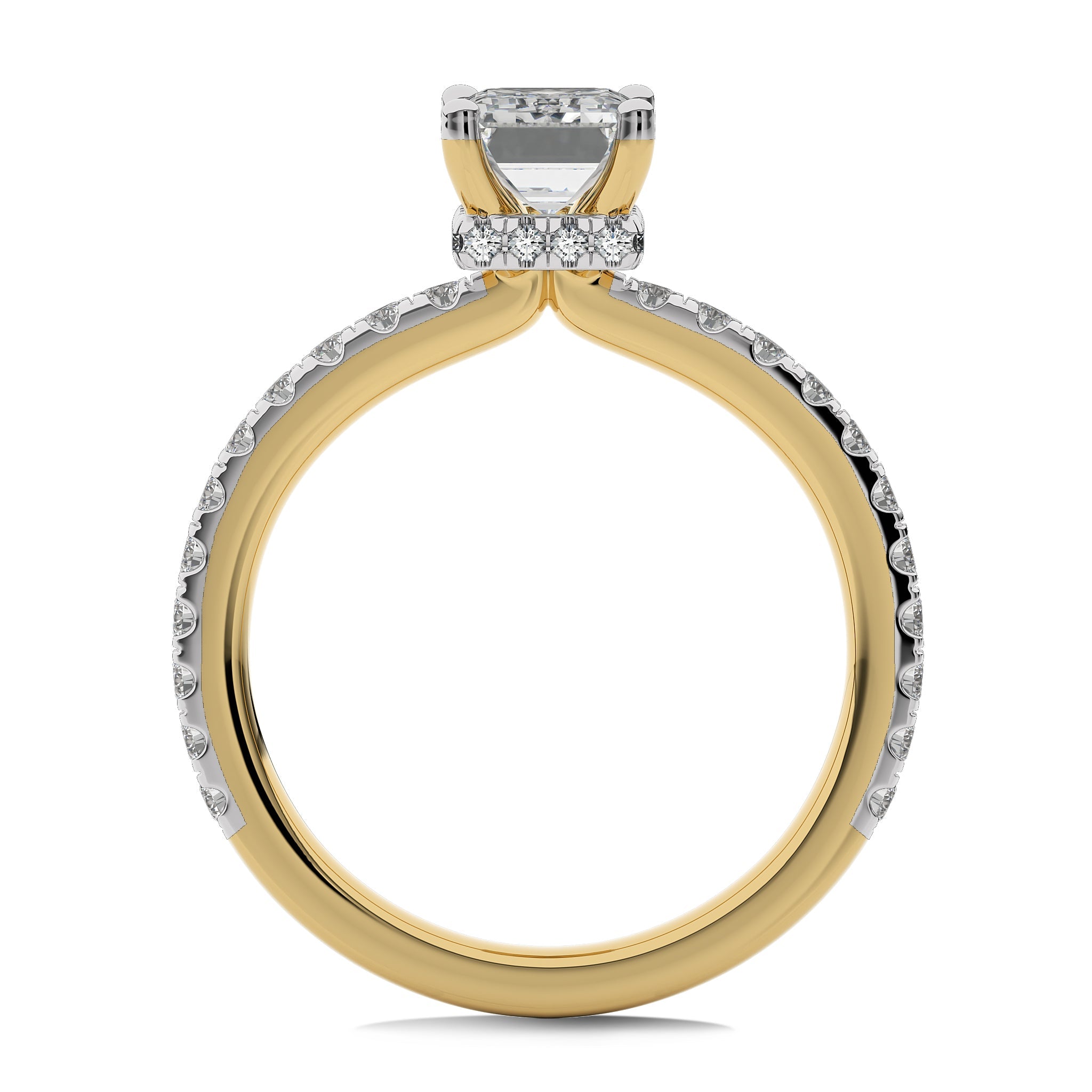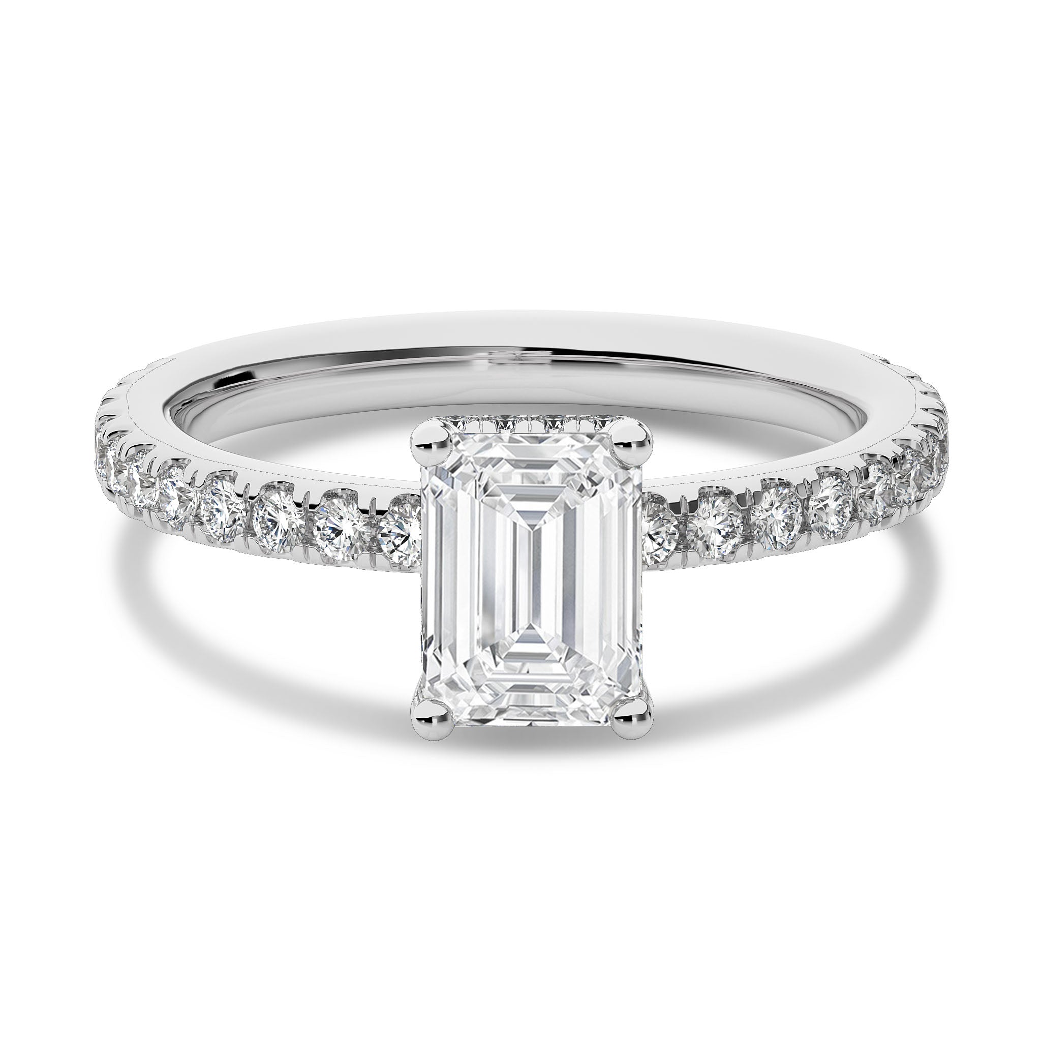 This magnificent engagement ring features a 2 carat emerald cut lab-created diamond, enhanced by a hidden halo and a studded shank. With DEF/SI quality stones set in micro split and prong settings, the hidden halo and sparkling shank elevate the ring?s grandeur, creating a truly unforgettable centerpiece