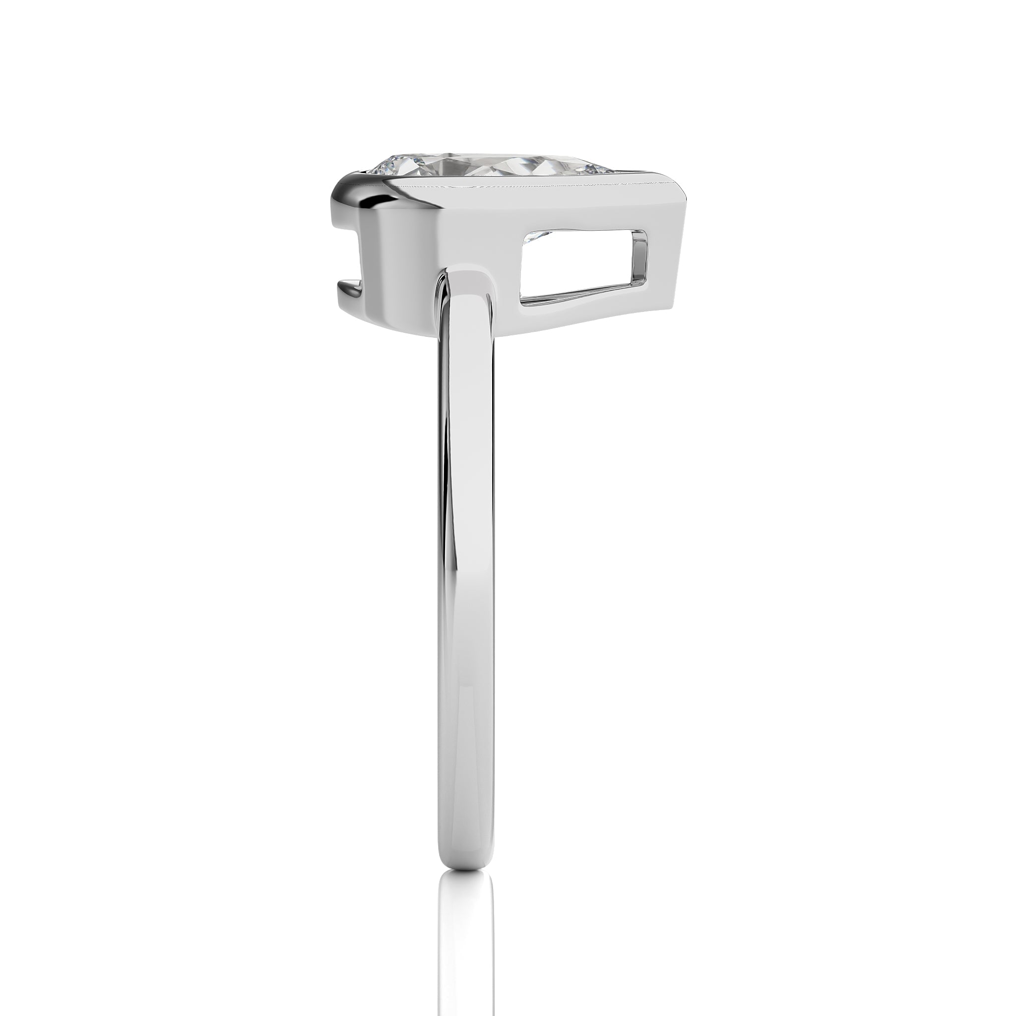 Elegantly featuring a stunning 1 1/2 carat pear shaped lab created diamond, this engagement ring is a testament to bespoke elegance. With DEF/SI quality and a secure bezel setting, Make this unique ring the centerpiece of your unforgettable moments