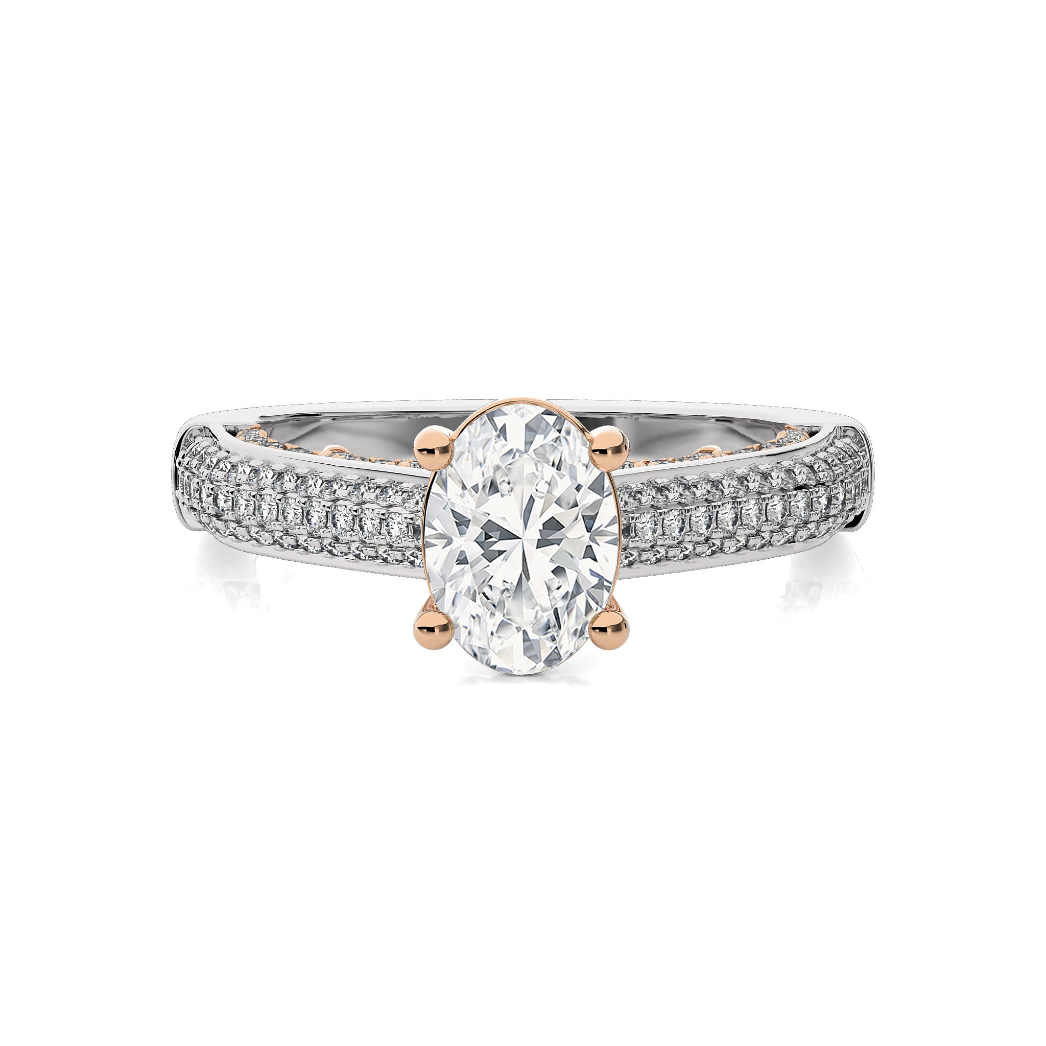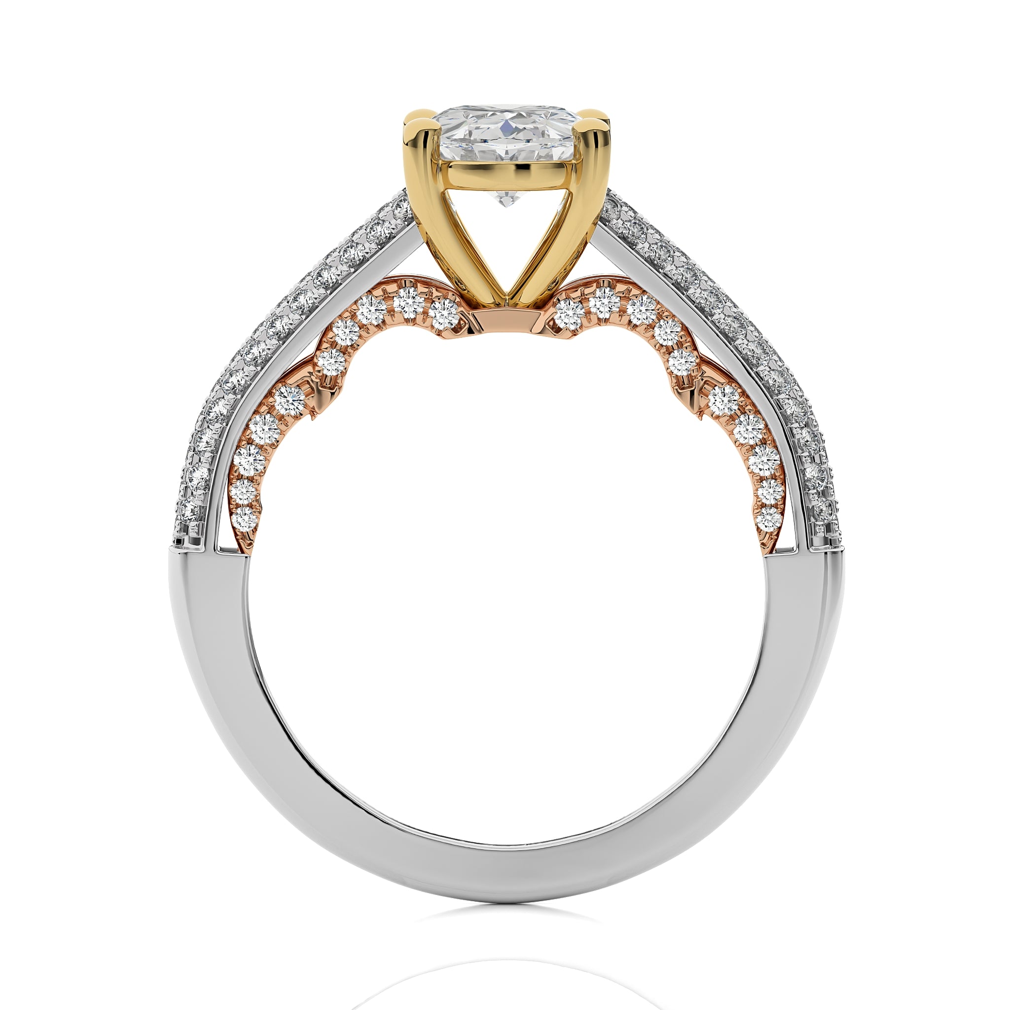 This three tone breathtaking ring features a 1 1/2 carat Oval Natural diamond as the centerpiece, held securely in a prong setting. Flanked by 1/2 carat round diamonds in a micro split setting, this H-I/I1-I2 quality ring radiates an enchanting brilliance. The Lunar Embrace symbolizes the merging of two hearts, capturing the luminous glow of a love that transcends time