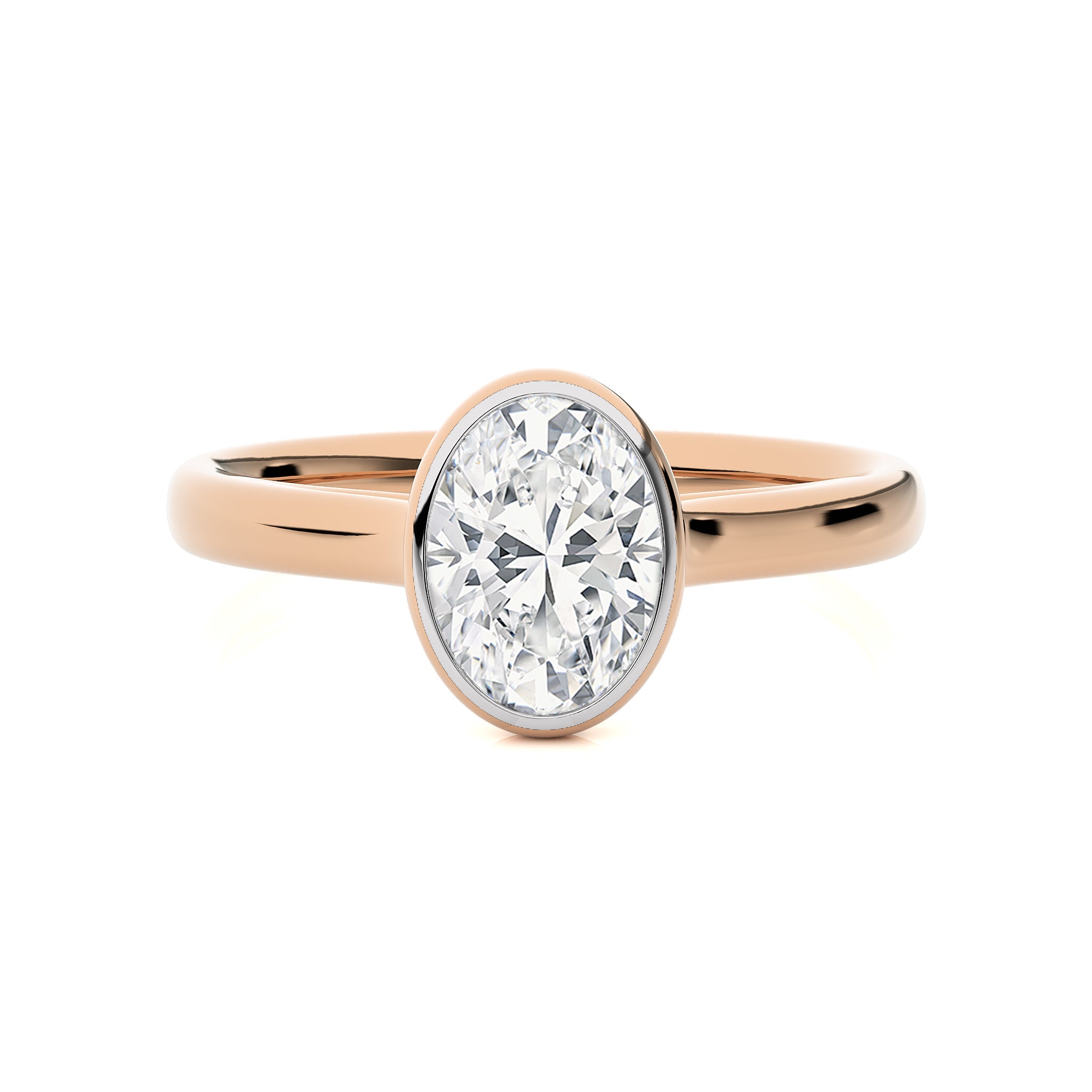 Featuring a captivating 1 1/2 carat oval lab created diamond, this ring is set in a sleek bezel design, highlighting its DEF/SI quality brilliance. The bezel setting adds a touch of modern elegance, while the diamond's radiant beauty embodies the promise of a future filled with love. Embrace the graceful horizon of your journey together with this timeless symbol of commitment