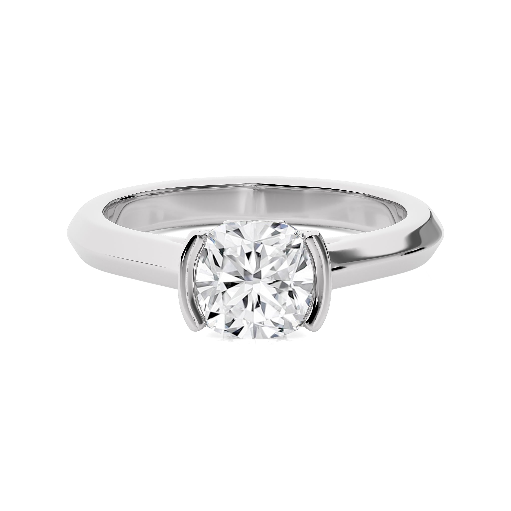 Witness the eternal grace of the Unfading Grace Bezel Set Knife Edge Cushion Natural Diamond Engagement Ring. Featuring a striking 1 1/2 carat diamond in H-I/I1-I2 quality, this ring is crafted with a half bezel setting that enhances its brilliance. An impeccable choice for celebrating a love that lasts forever