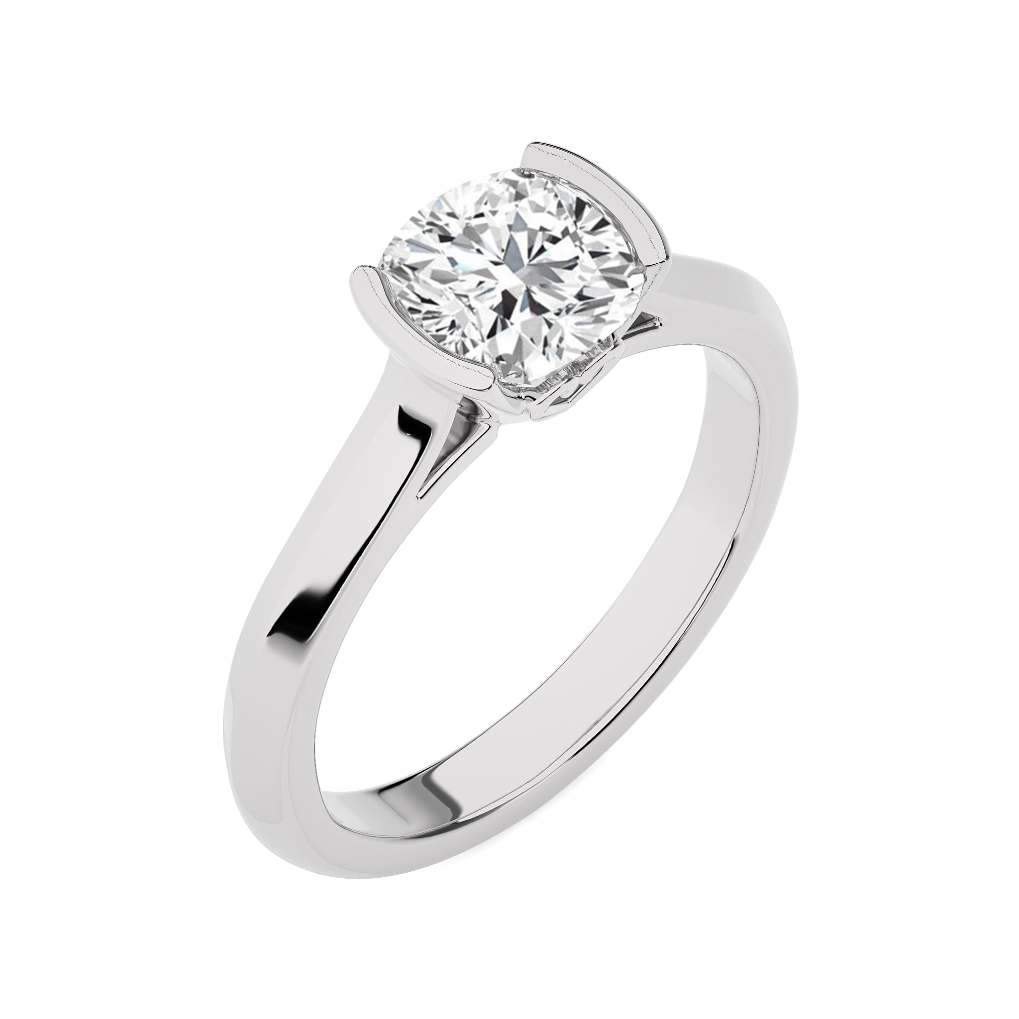 Witness the eternal grace of the Unfading Grace Bezel Set Knife Edge Cushion Lab Created Diamond Engagement Ring. Featuring a striking 1 1/2 carat diamond in DEF/SI quality, this ring is crafted with a half bezel setting that enhances its brilliance. An impeccable choice for celebrating a love that lasts forever
