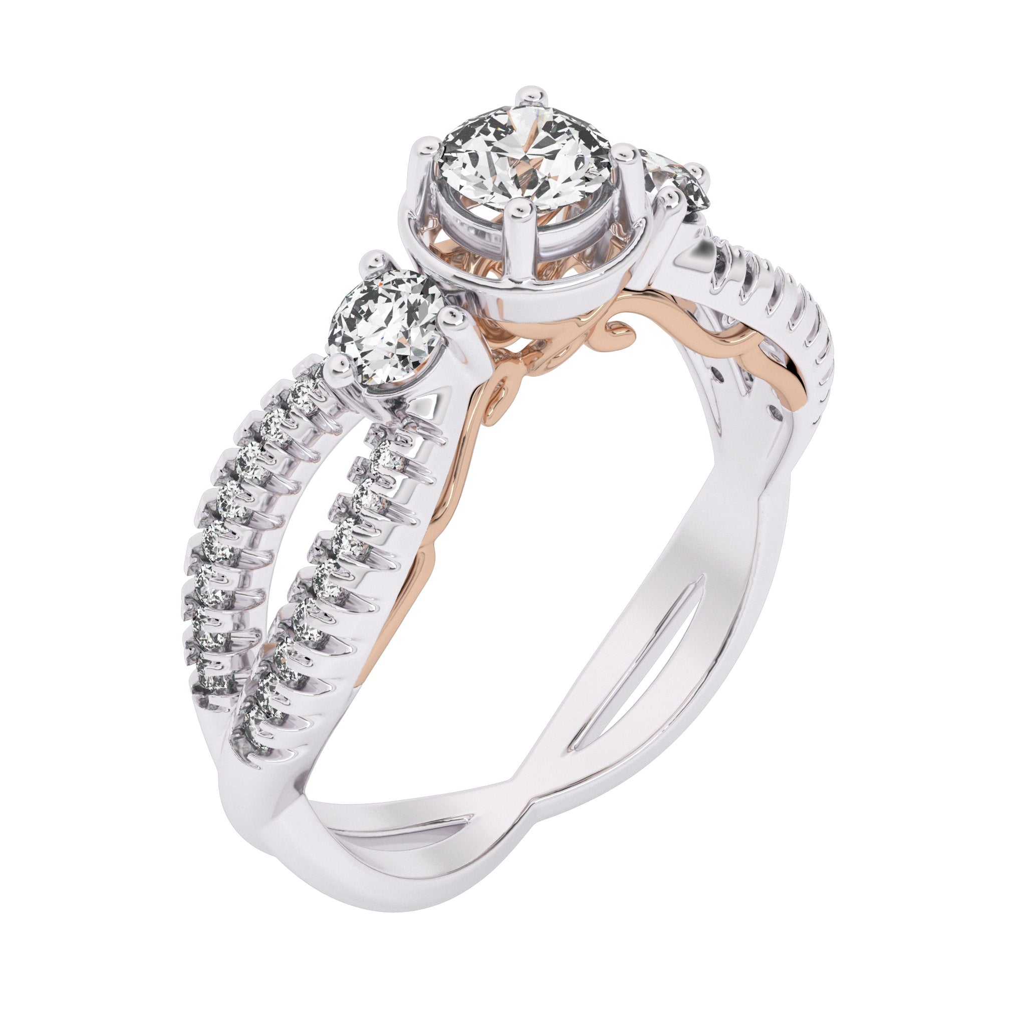 Indulge in eternal love with our exquisite 3/4 carat Infinity Twist Three Stone Engagement Ring, featuring DEF/SI quality lab-created diamonds expertly set in a micro split and prong setting, The timeless design showcases a trio of stunning diamonds, representing your past, present, and future together. The infinity twist band symbolizes your never-ending love and commitment