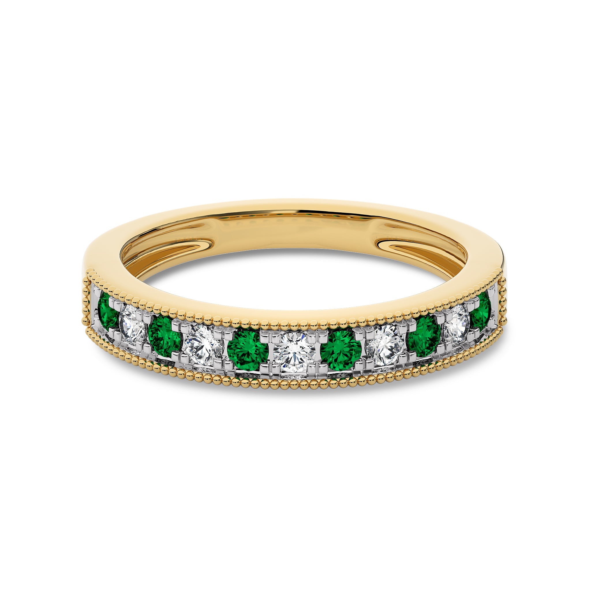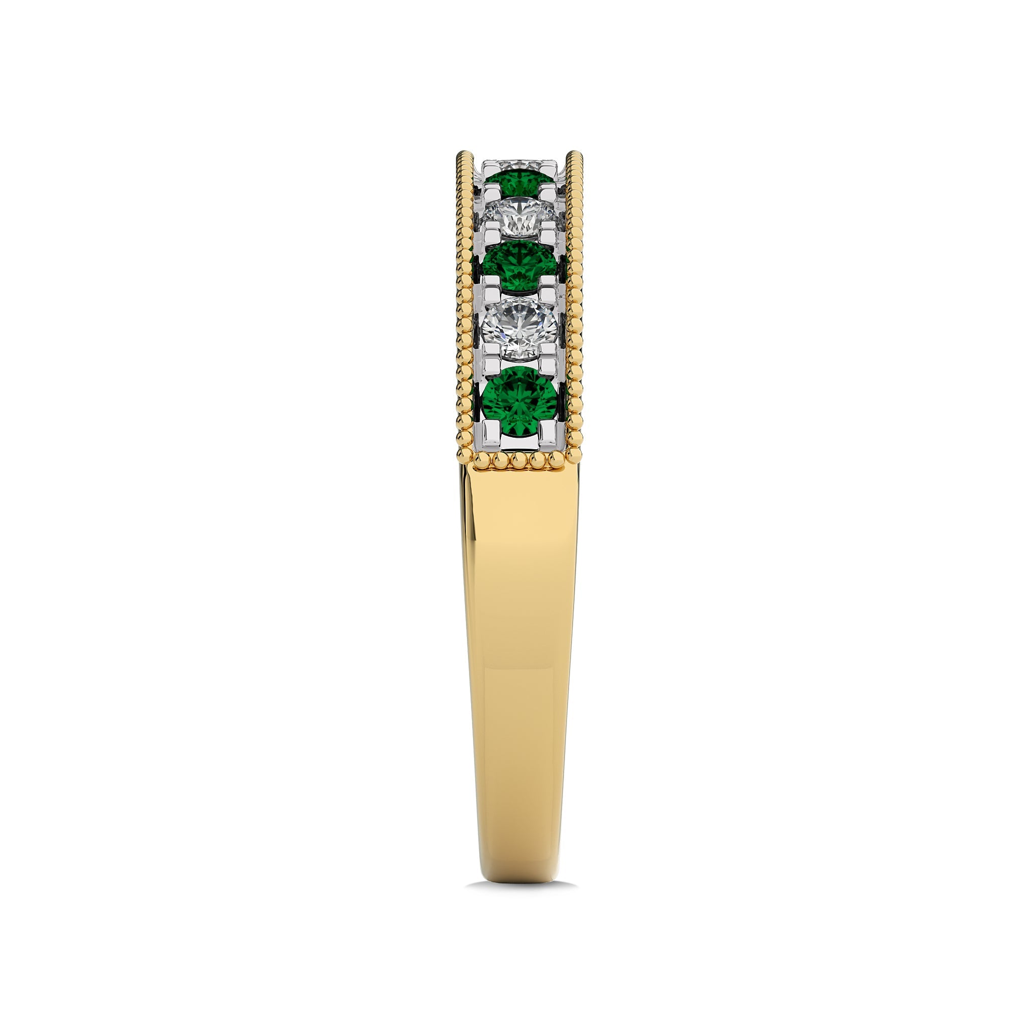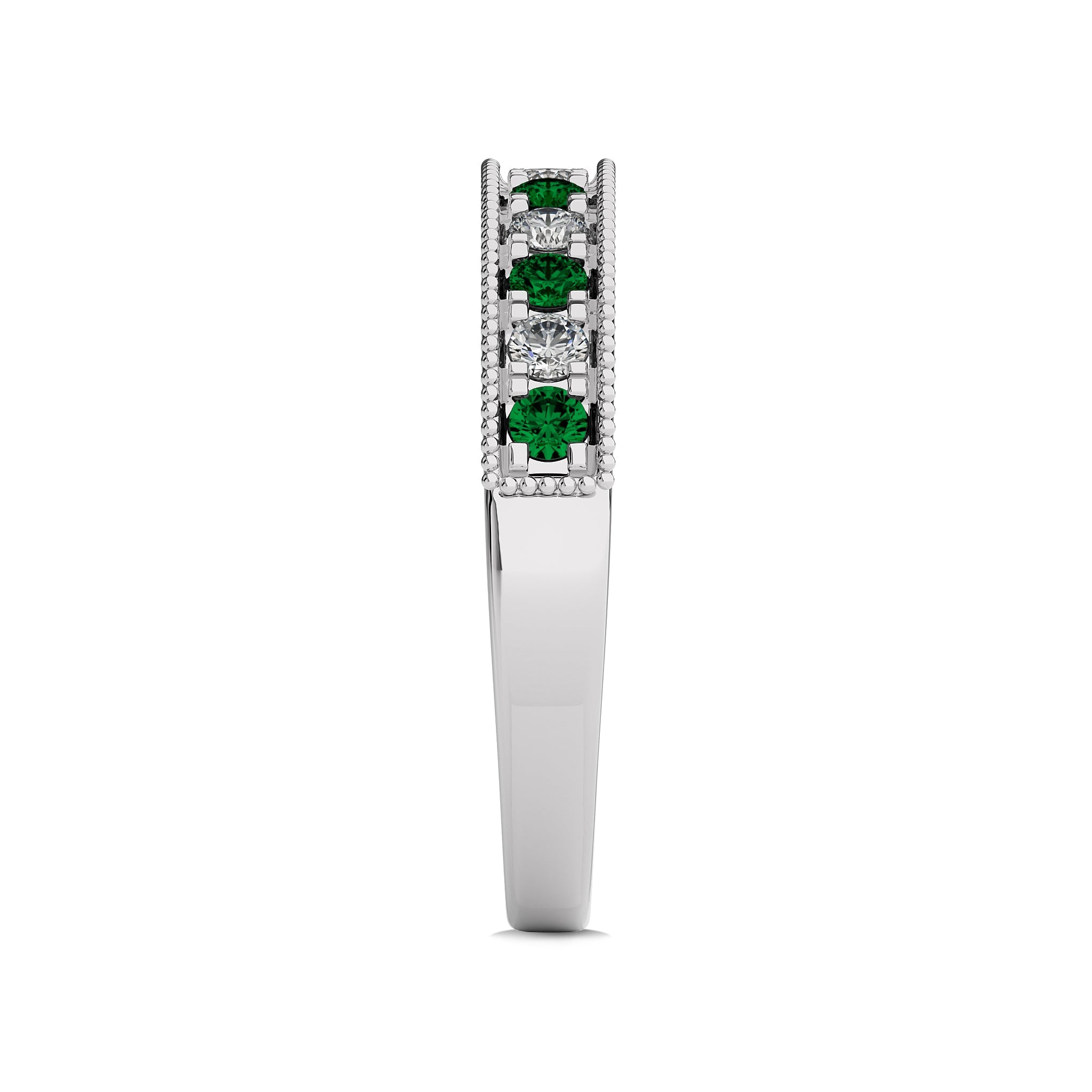 Discover the charm of vintage inspired design with this 3/8 CT. Round Natural Diamond and Emerald Half Eternity Band. The micro-split setting alternates between dazzling round diamonds H-I/I1-I2 and vibrant emeralds, creating a stunning and balanced contrast. This elegant piece adds a refined and timeless touch to any collection