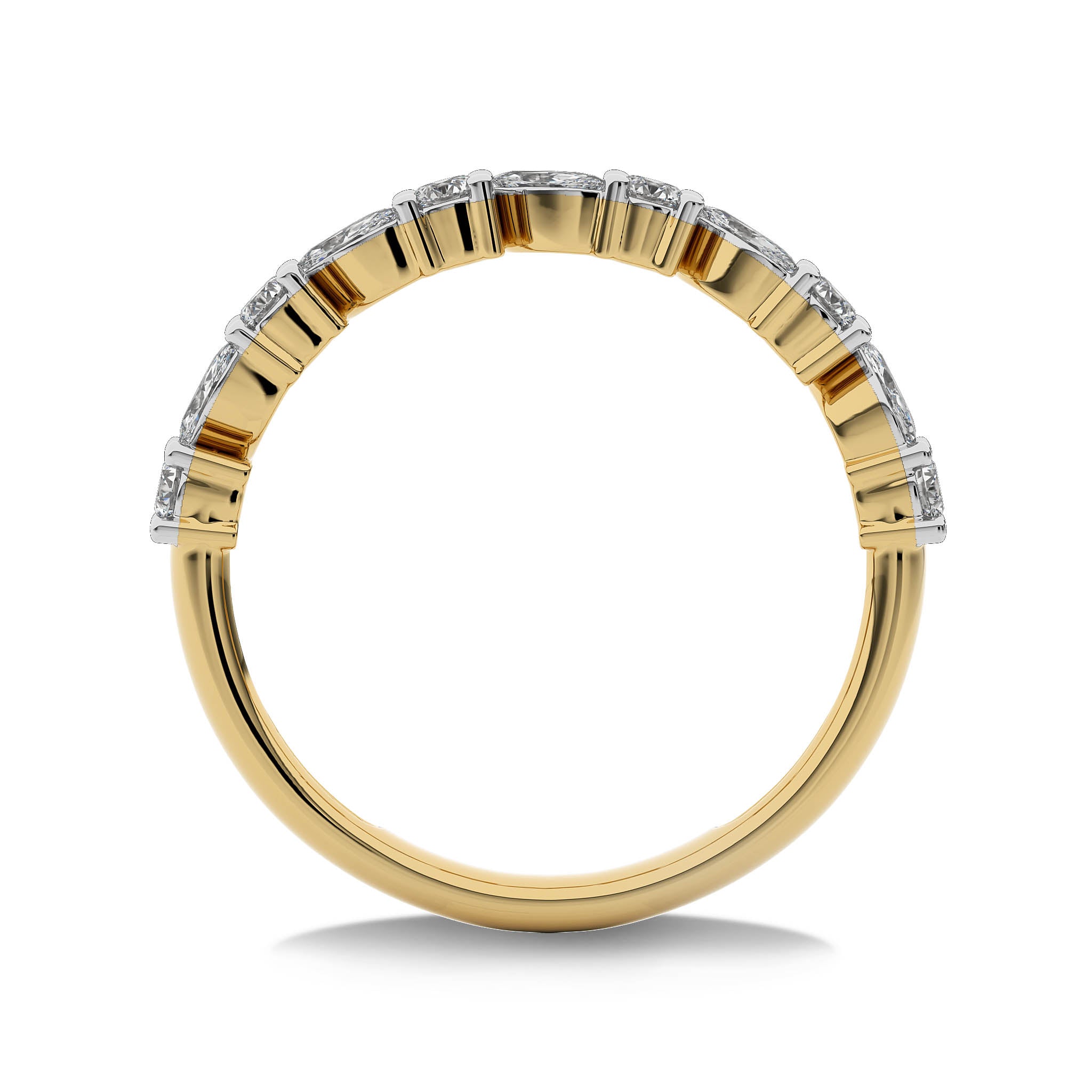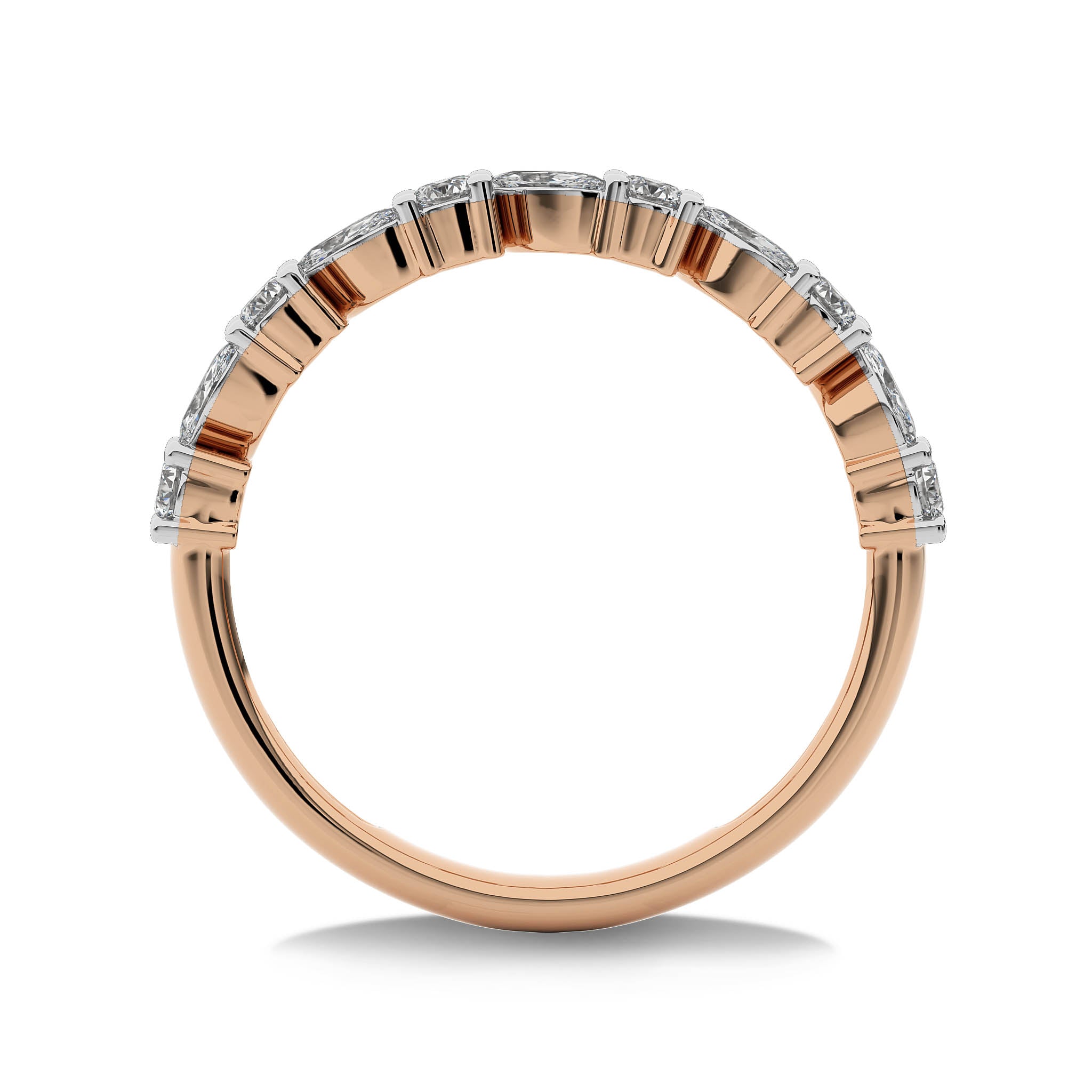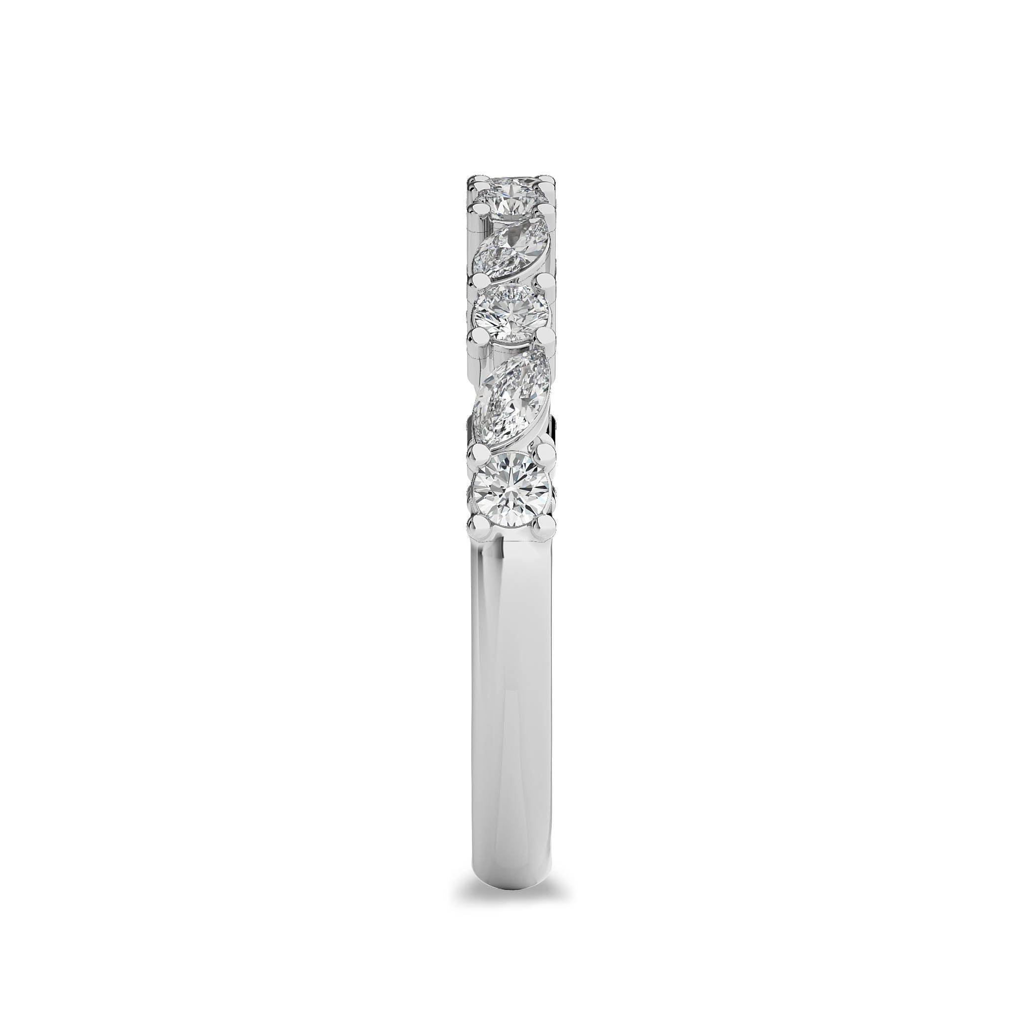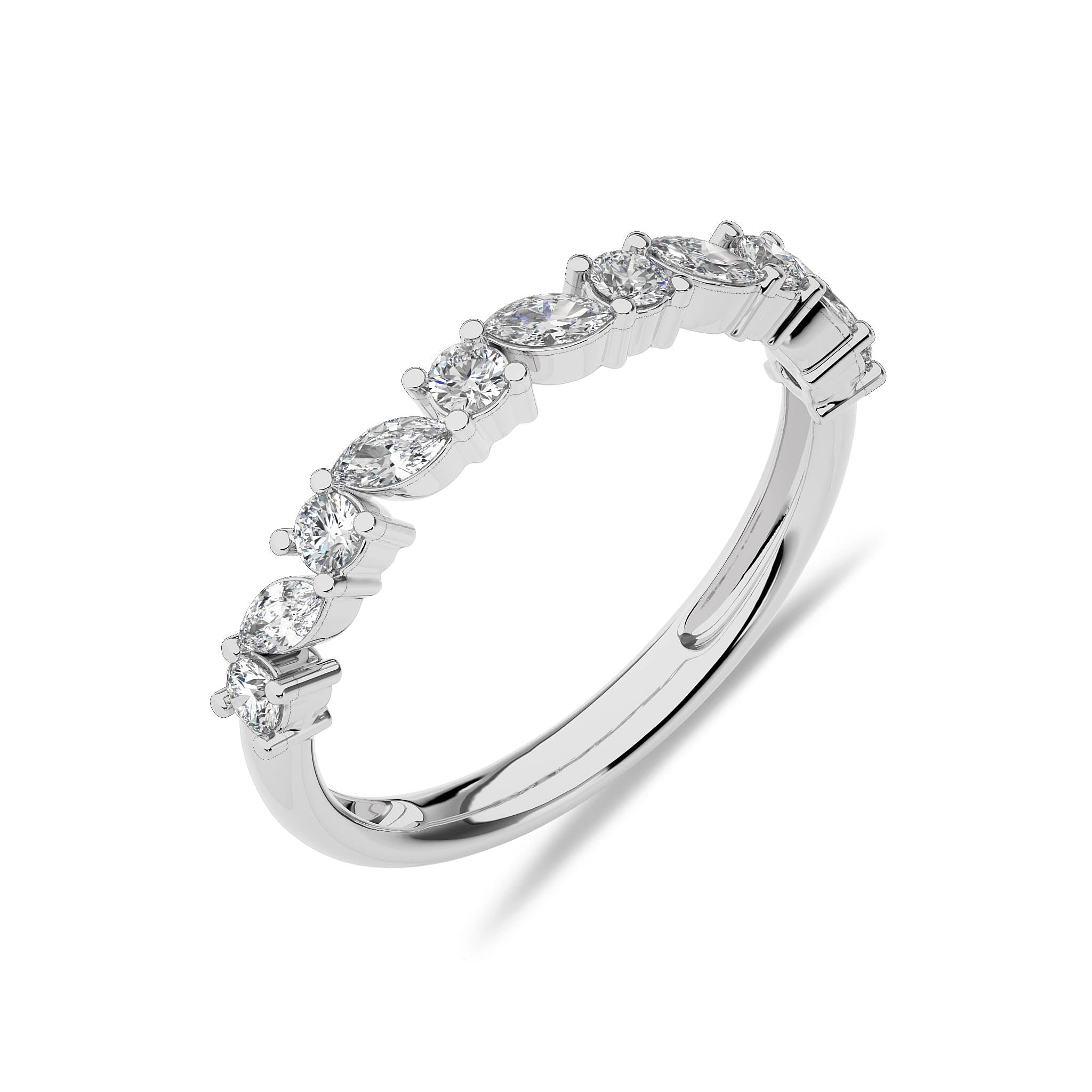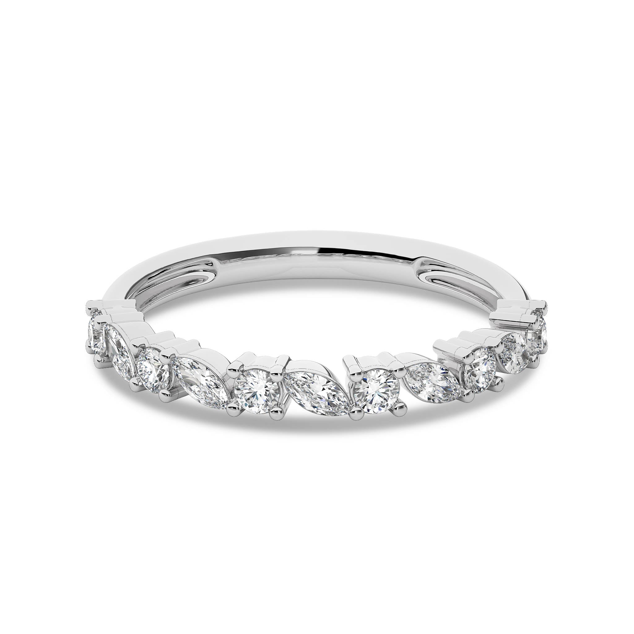 This elegant wedding band features 1/2 carat of cocktail round and marquise lab-created diamonds, set in DEF/SI quality with prong settings. The sophisticated arrangement of stones adds a touch of glamour and grace. Celebrate your commitment with this beautifully crafted band, a perfect complement to your love story