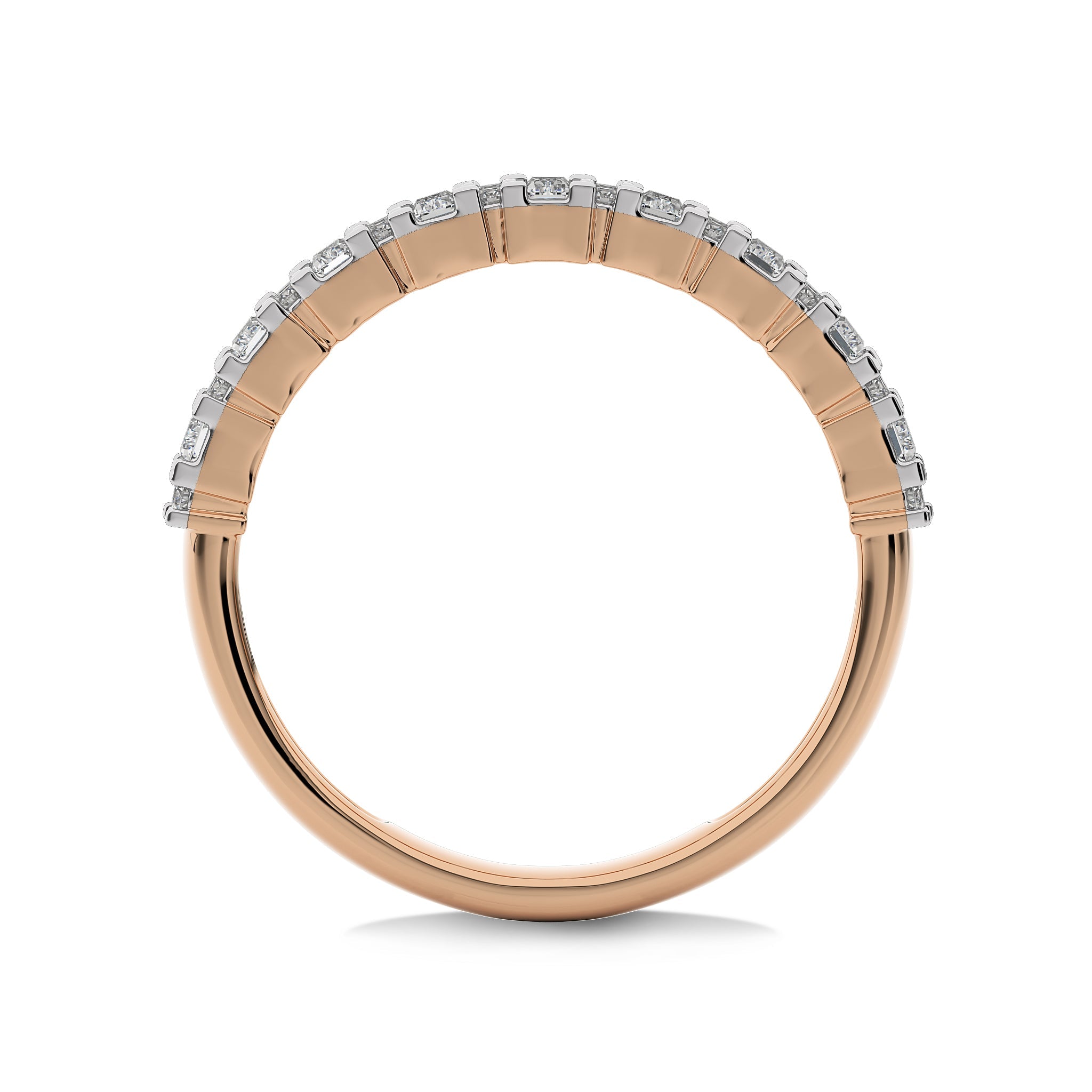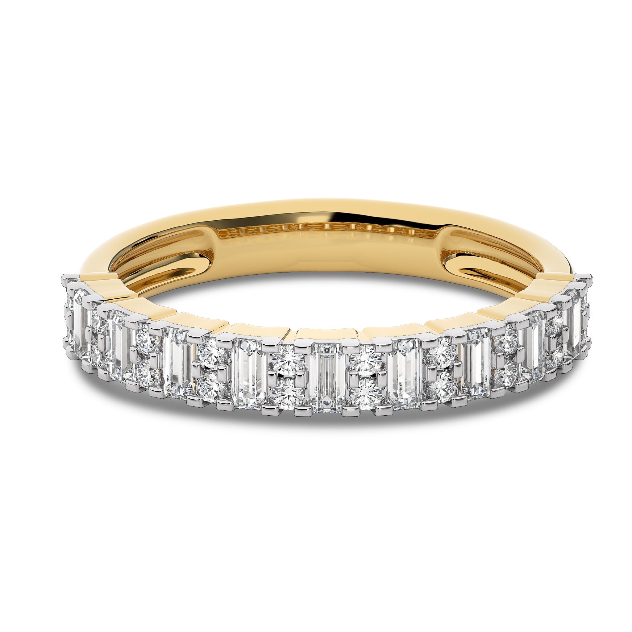 This wedding band features 1/2 carat of round and baguette lab-created diamonds in DEF/SI quality, set with a sleek micro split design. The refined arrangement of diamonds offers a chic touch, perfect for adding a touch of elegance to any special occasion
