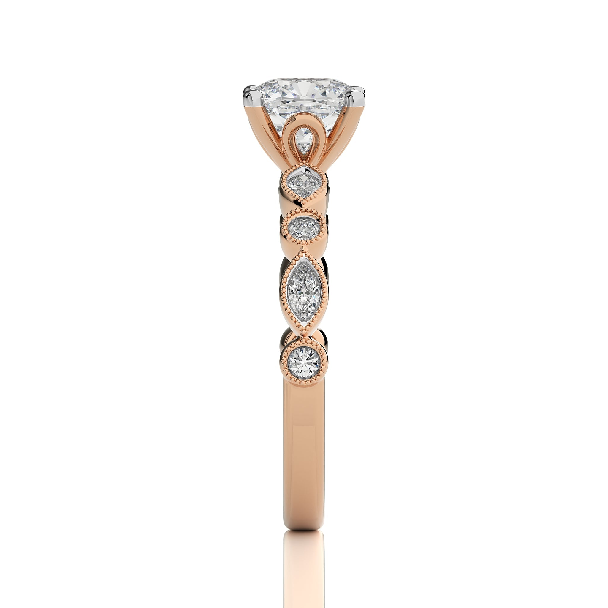Glorify your love with the vintage charm cushion engagement ring available in lab created and natural diamonds set in bezel and prong settings. Experience the timeless allure of this exquisite symbol of your eternal bond